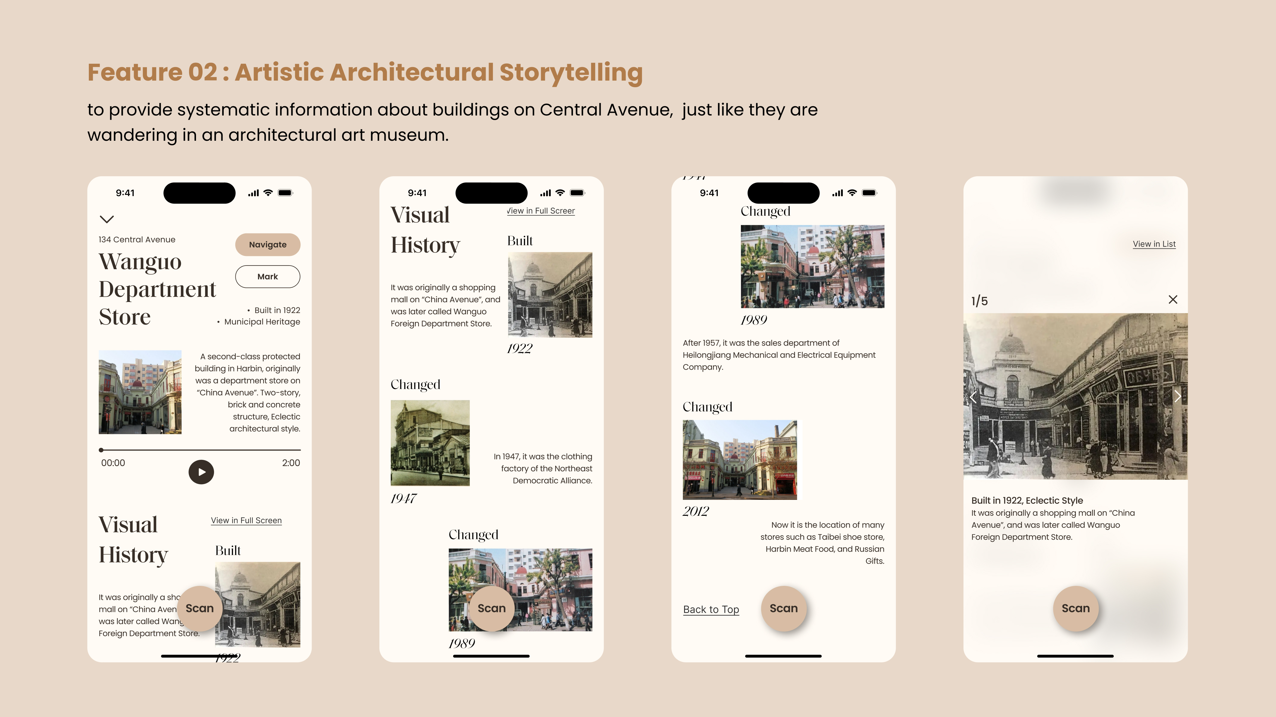 Artistic Architectural Storytelling – Harbin ARcollage provides systematic and authentic information about historic buildings on the avenue, presented in a visual style inspired by art museums, to give users the experience just like they are wandering in an open-air architectural exhibition.