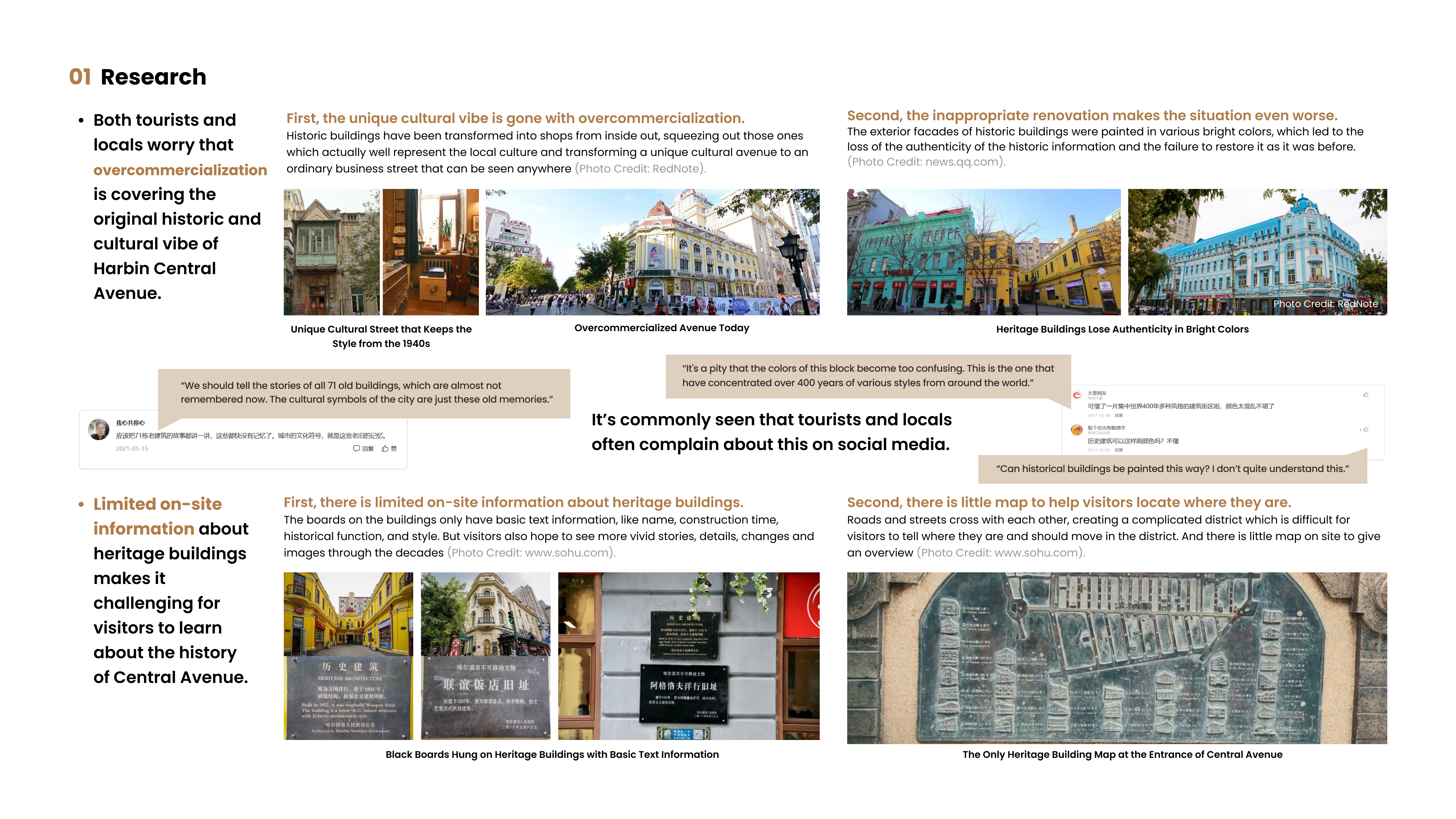 On the Central Avenue in Harbin, China, a strong sense of history intertwined with modern vibrancy attracts both locals and tourists. However, preserving its cultural essence while embracing modernization remains a challenge. One the one hand, overcommercialization risks overshadowing the avenue’s historic charm. On the other hand, the lack of on-site information makes it difficult for visitors to fully appreciate its architectural heritage.