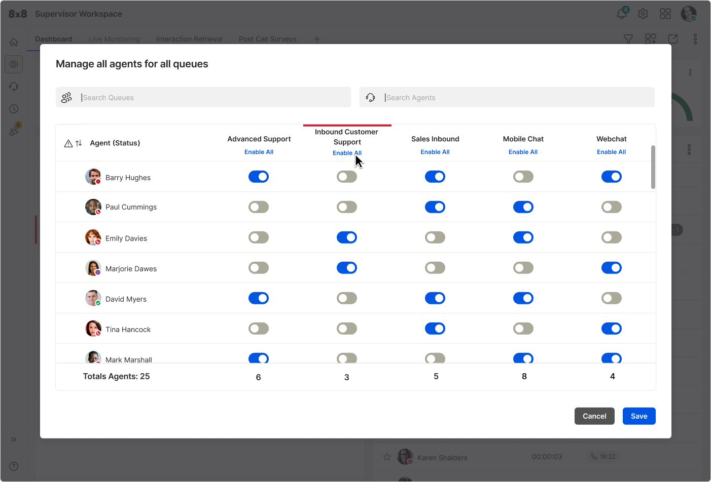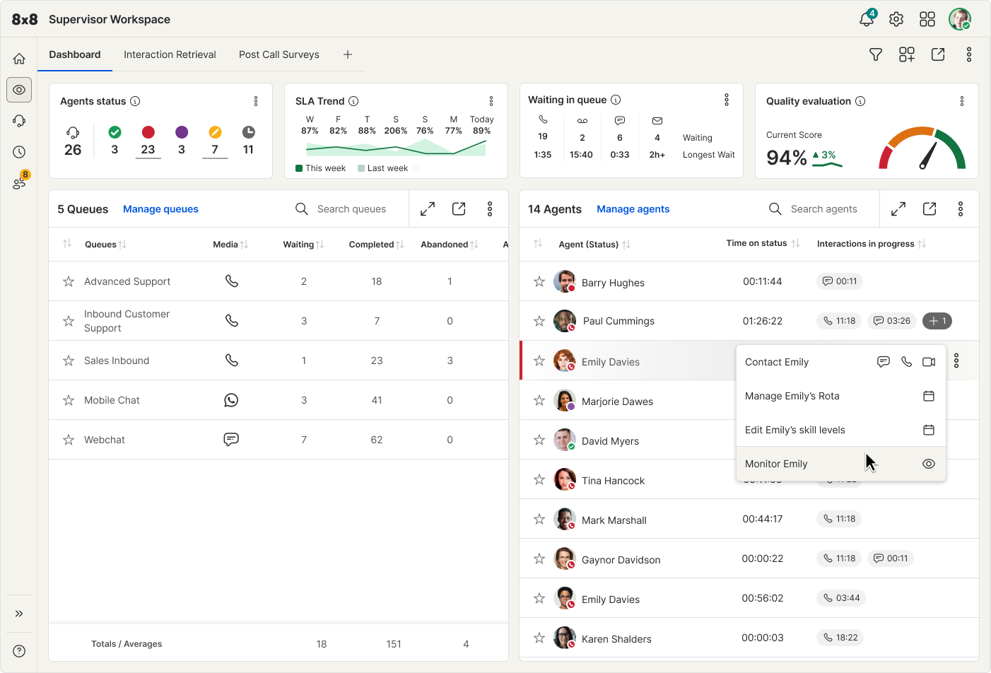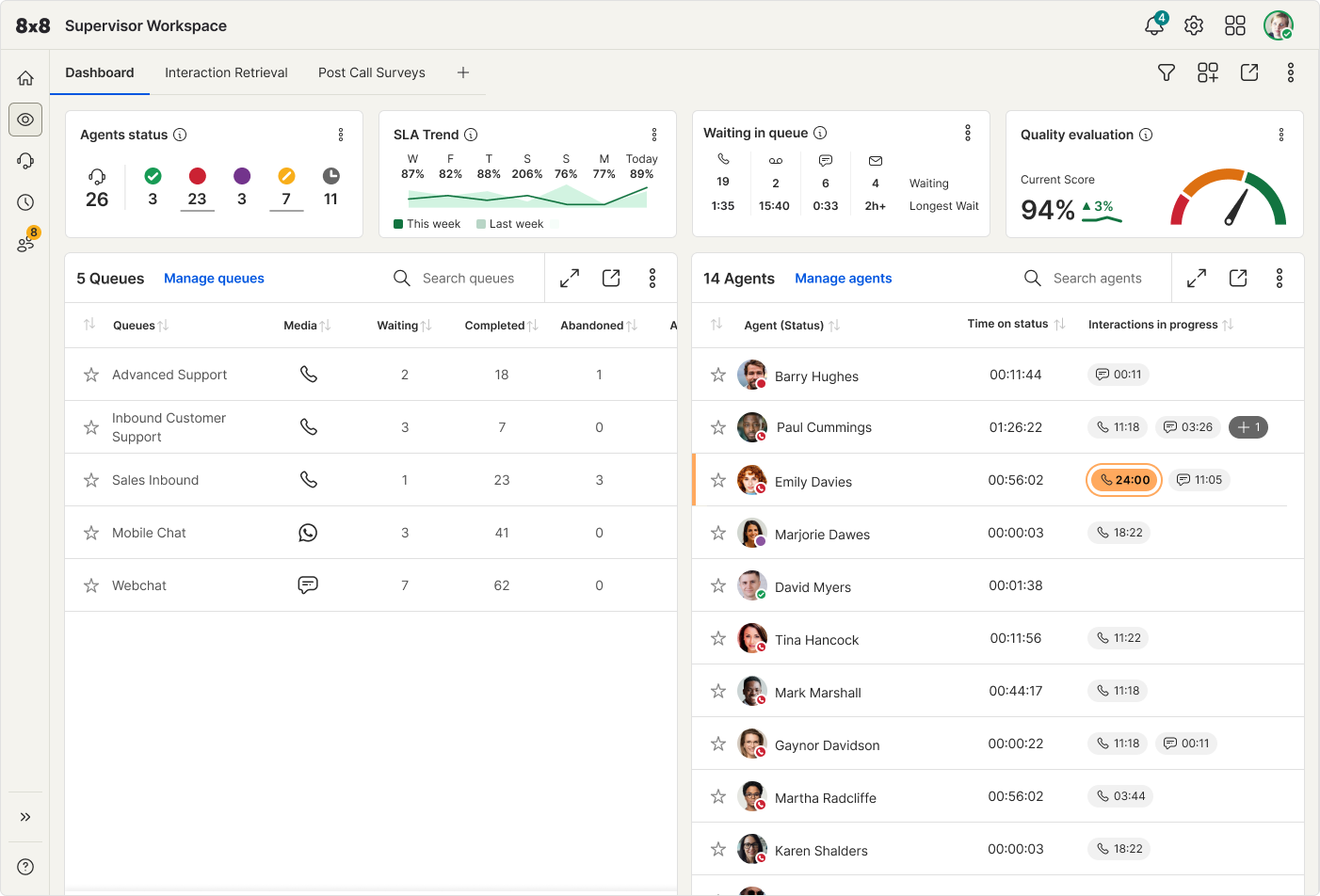 Supervisor Workspace is a customizable, easy-to-use, intuitive UI to ignite contact center performance with personalized, automated supervisor experiences. 8x8 Supervisor Workspace provides a single pane of glass for monitoring and managing the agents' performance and the contact center's overall efficiency. Available on both desktop and through an intuitive mobile experience, Supervisor Workspace centralizes visibility and actions and provides insights, assistance, and guidance so that contact center leaders can view, monitor, and manage agent and queue activity efficiently.