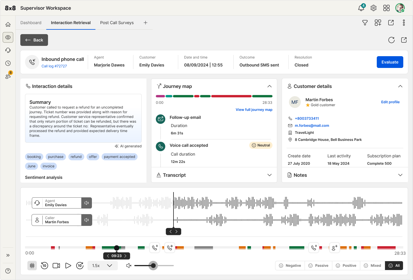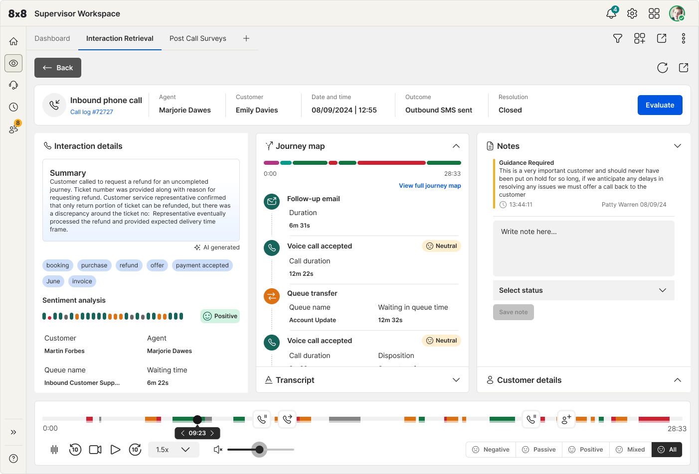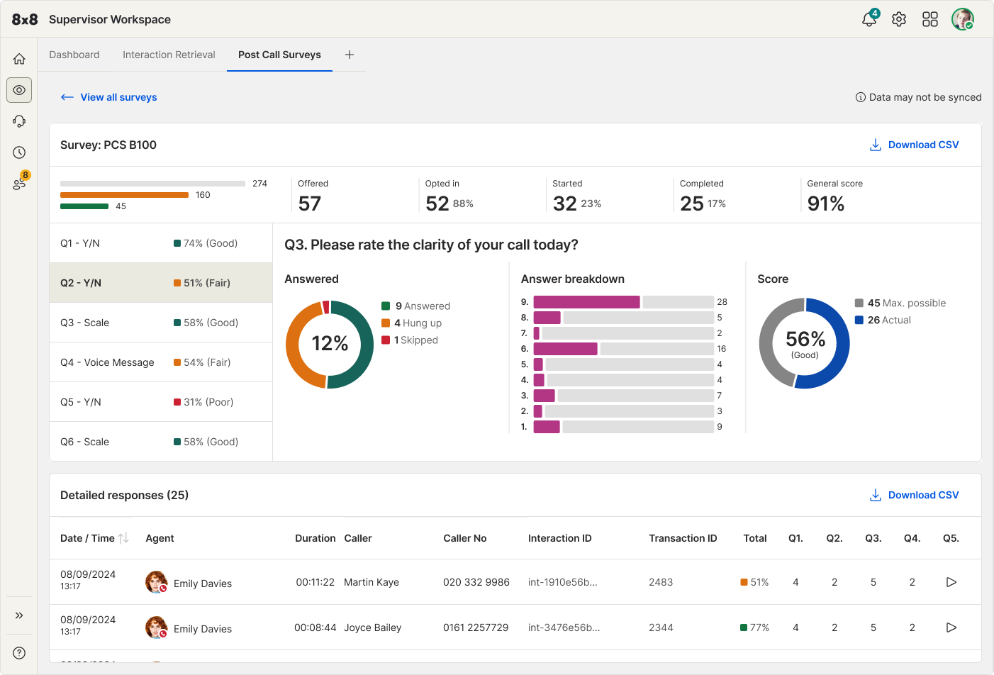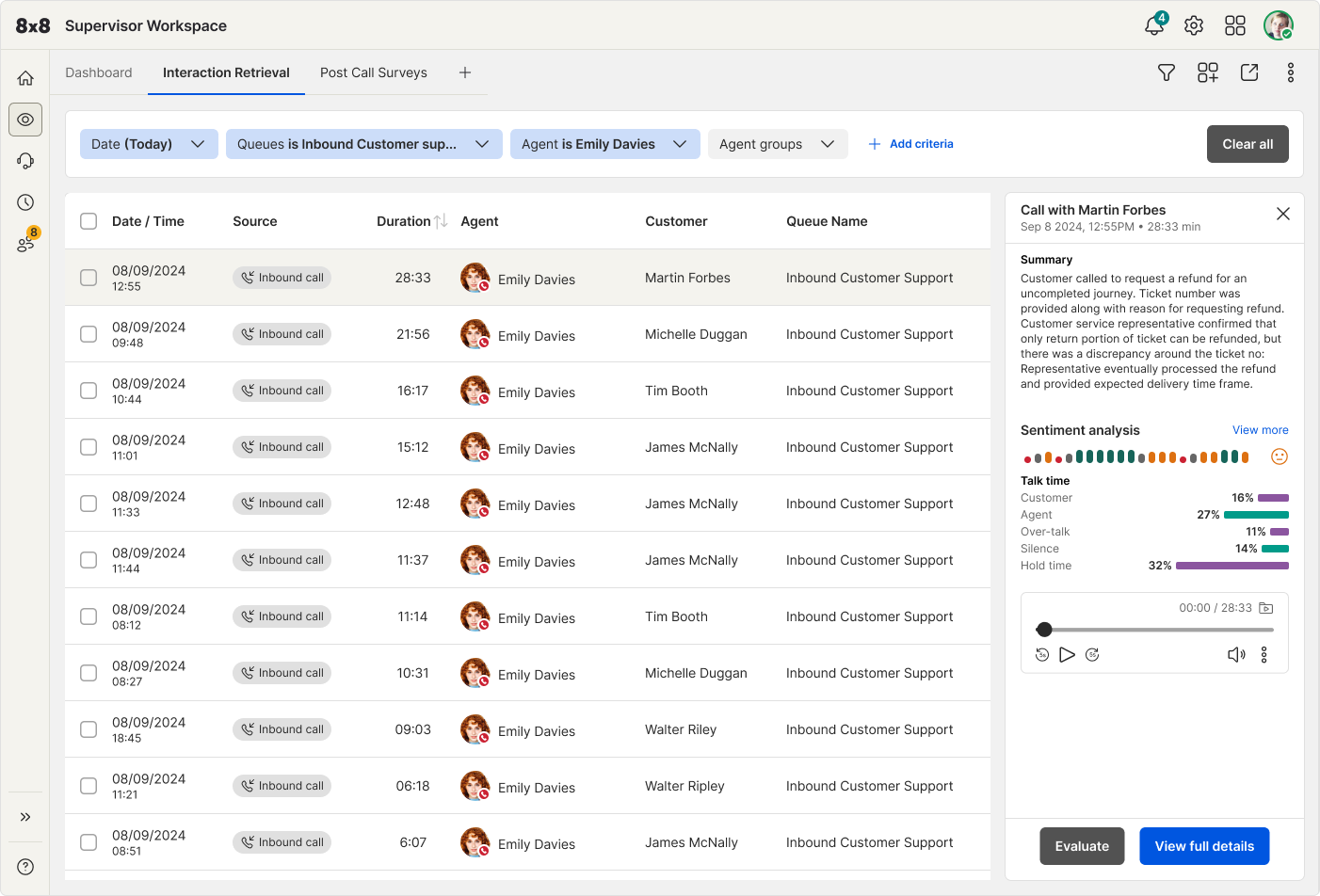 Supervisor Workspace is a customizable, easy-to-use, intuitive UI to ignite contact center performance with personalized, automated supervisor experiences. 8x8 Supervisor Workspace provides a single pane of glass for monitoring and managing the agents' performance and the contact center's overall efficiency. Available on both desktop and through an intuitive mobile experience, Supervisor Workspace centralizes visibility and actions and provides insights, assistance, and guidance so that contact center leaders can view, monitor, and manage agent and queue activity efficiently.