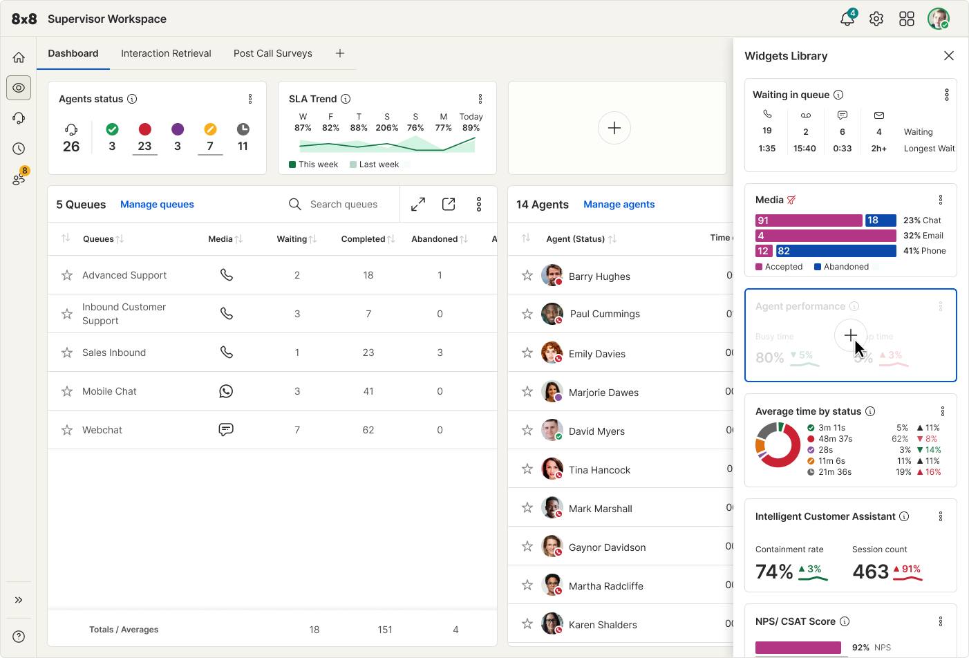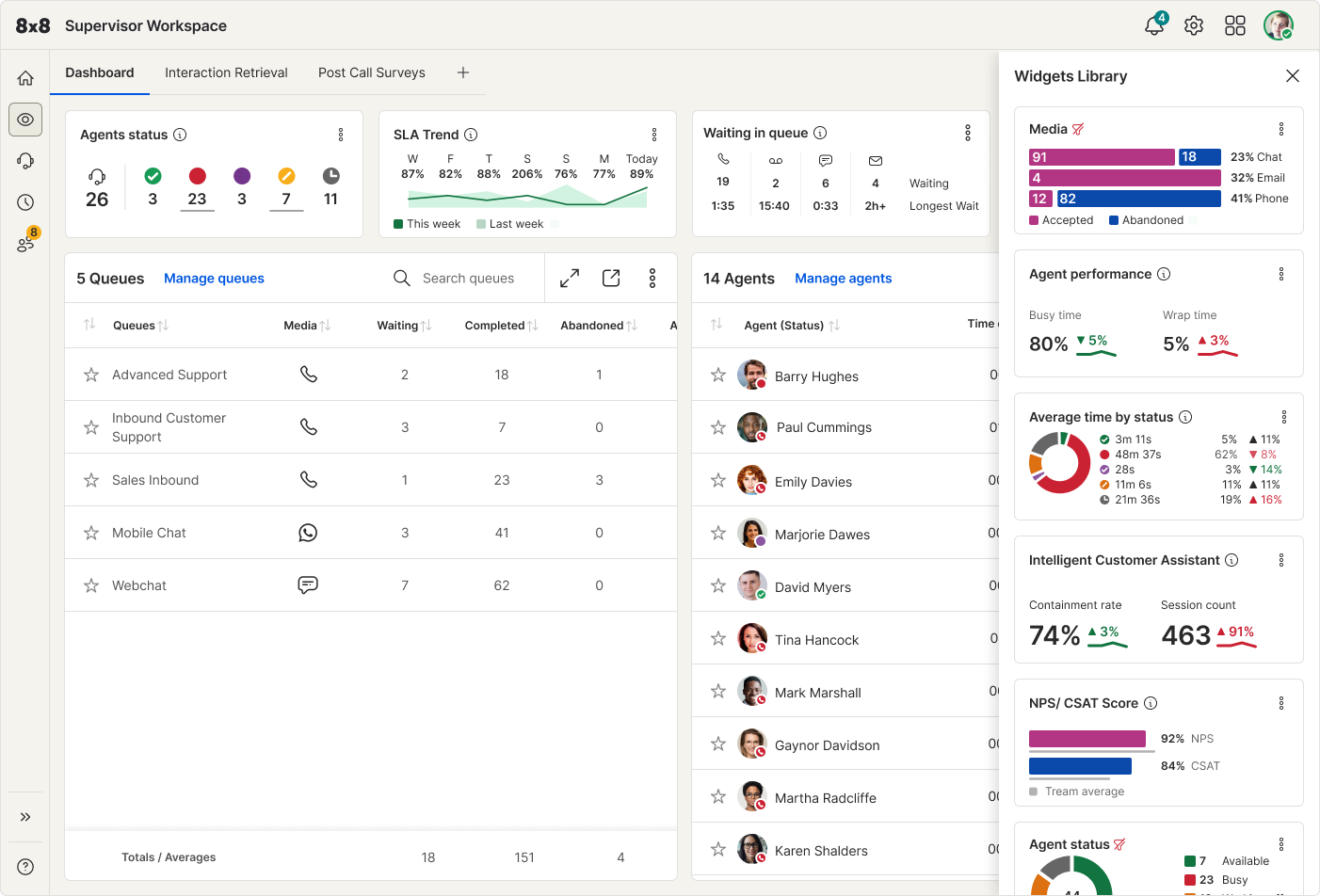 What sets 8x8 Supervisor Workspace apart from the competition is a unified toolbox that provides a fully integrated component library so that customization can happen with clicks, not code. With a micro frontend design, widgets directly access the source of the data, which can include 3rd party sources such as WFM, CRM, and BI tools. This allows supervisors to consolidate and correlate contact center data with line of business applications, providing a holistic view of company performance and the customer experience.