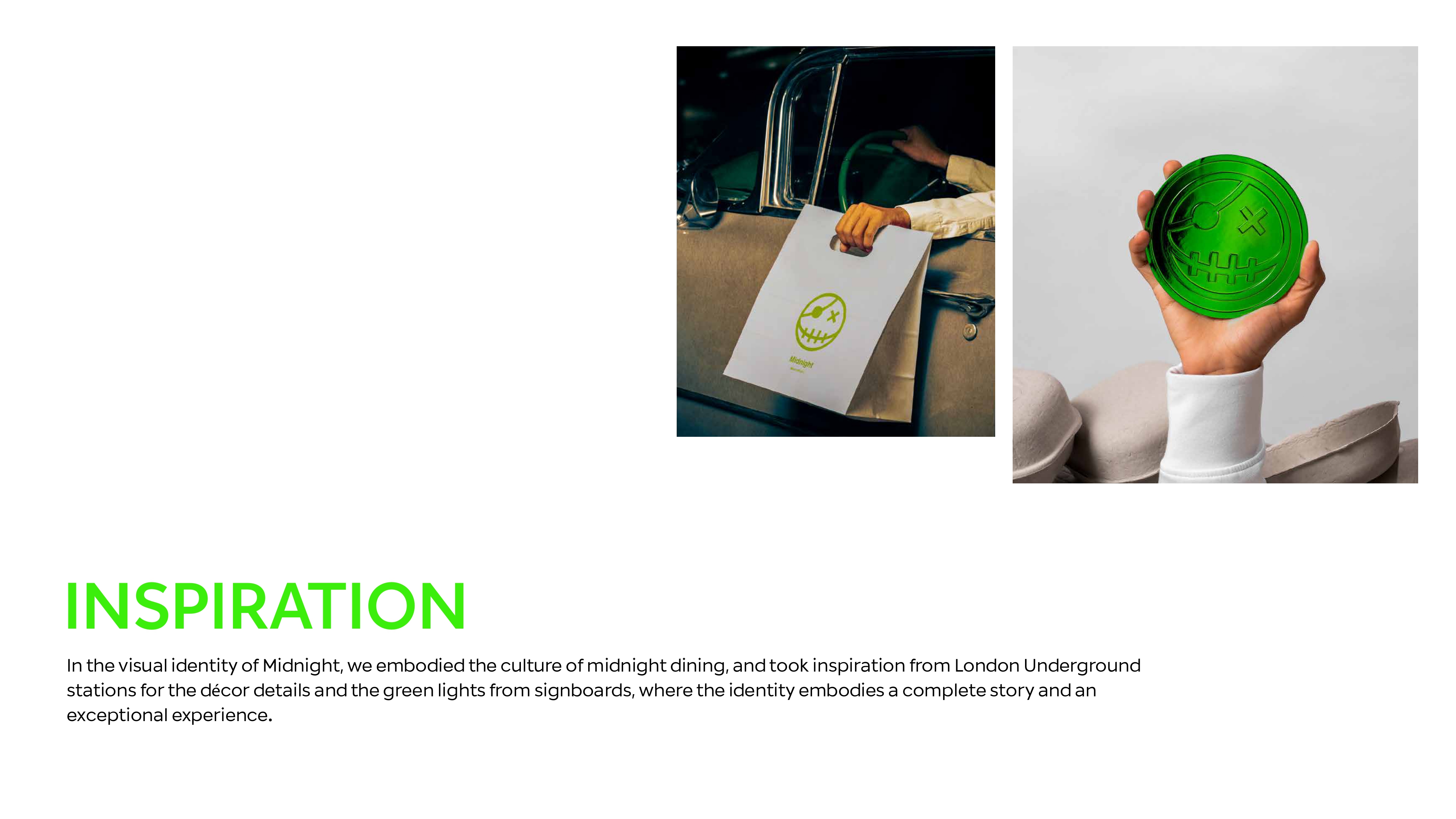 Midnight is a fast-food brand specializing in chicken burgers, designed to capture the energy and essence of late-night dining. The brand identity and packaging were meticulously crafted to deliver a cohesive and immersive experience for its young, dynamic audience. Inspired by the aesthetic of London Underground stations and the ambiance of neon-lit streets, the visual identity reflects an urban, edgy, and inviting feel.