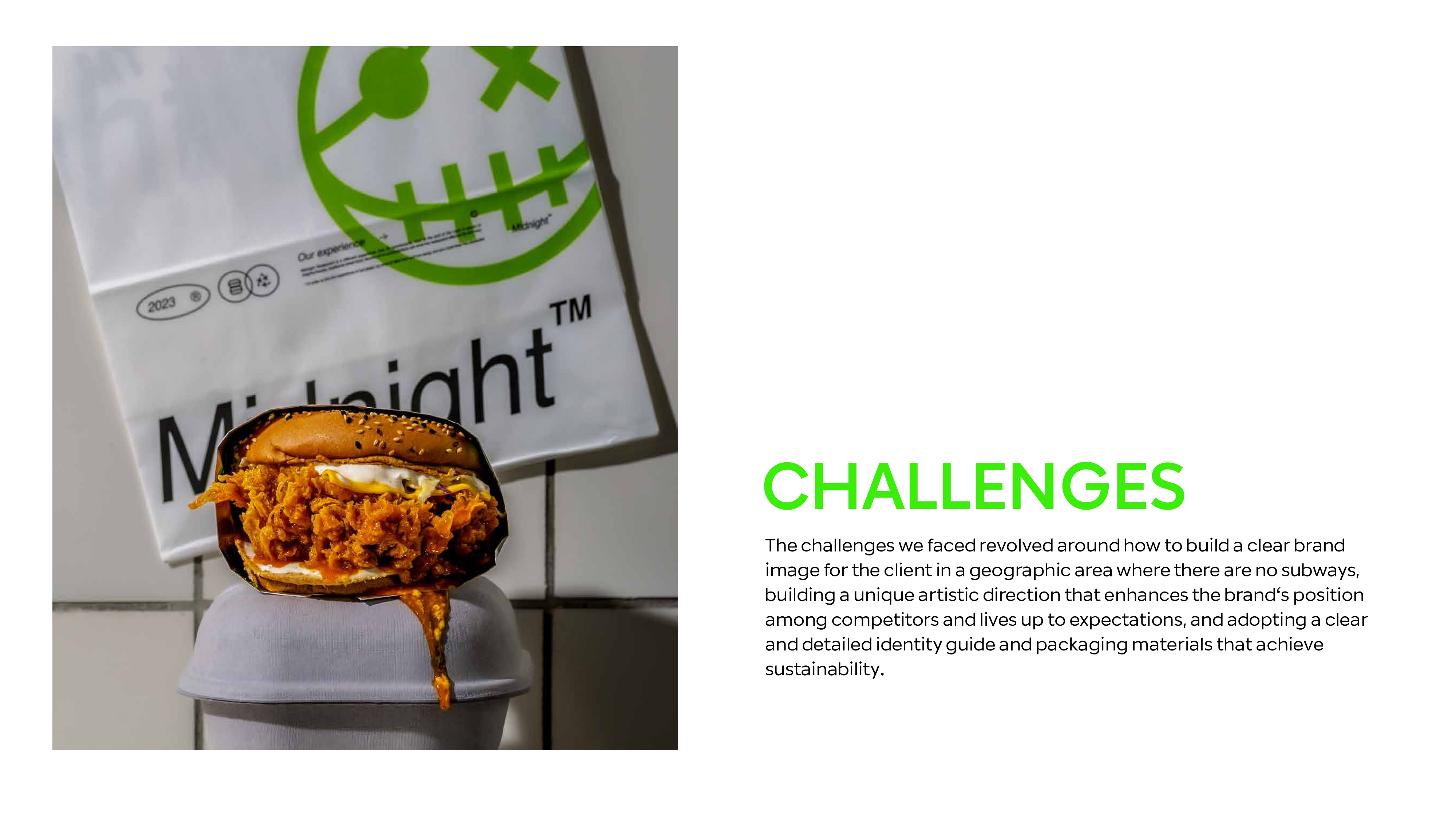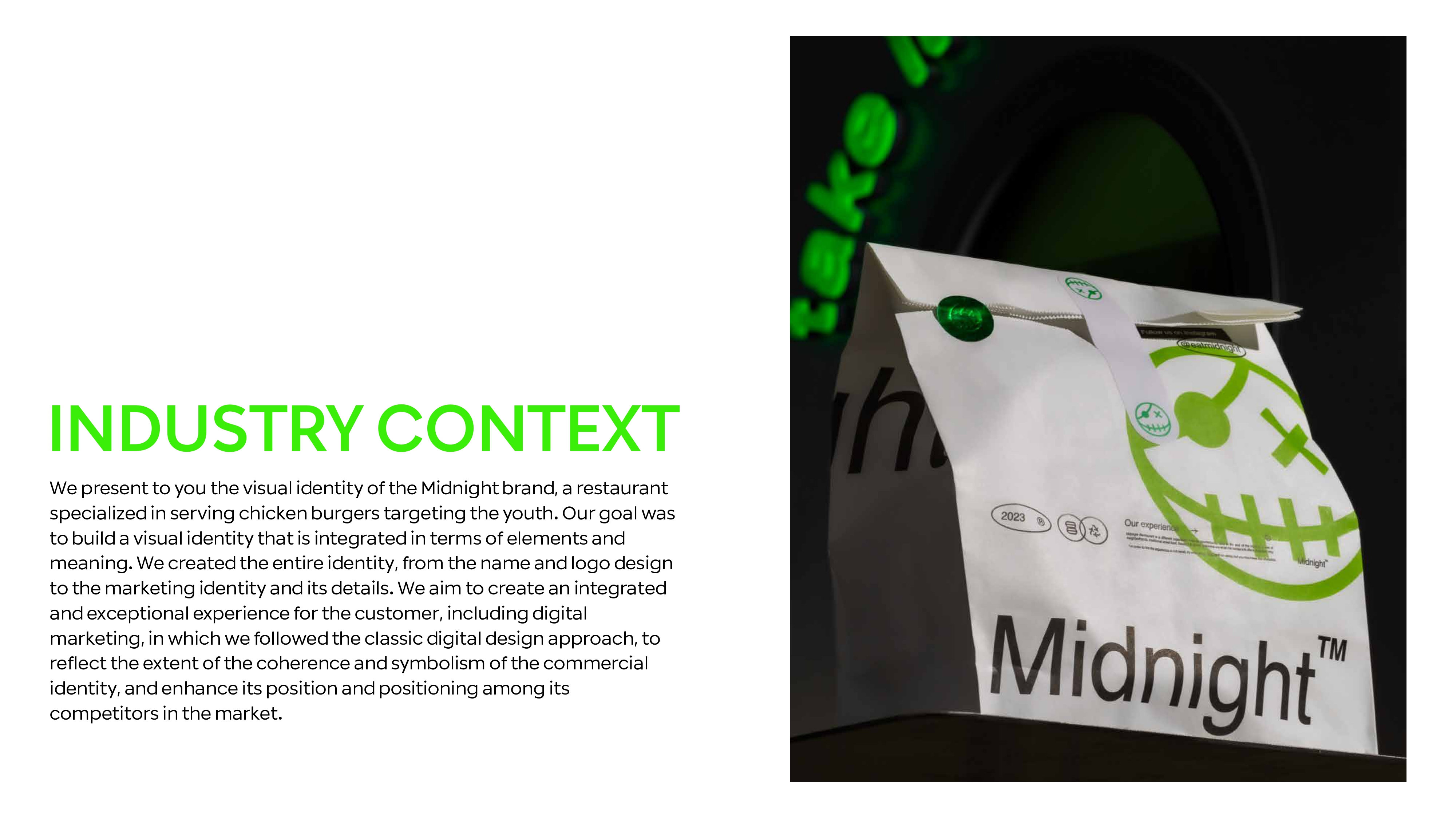 Every design element, from the logo and typography to the packaging and marketing materials, contributes to an integrated story that enhances brand recall and engagement. The sustainable packaging solutions align with the brand’s commitment to modernity and responsibility. Midnight is not just a restaurant; it’s an experience that redefines fast-food culture with creativity and strategic brand positioning.