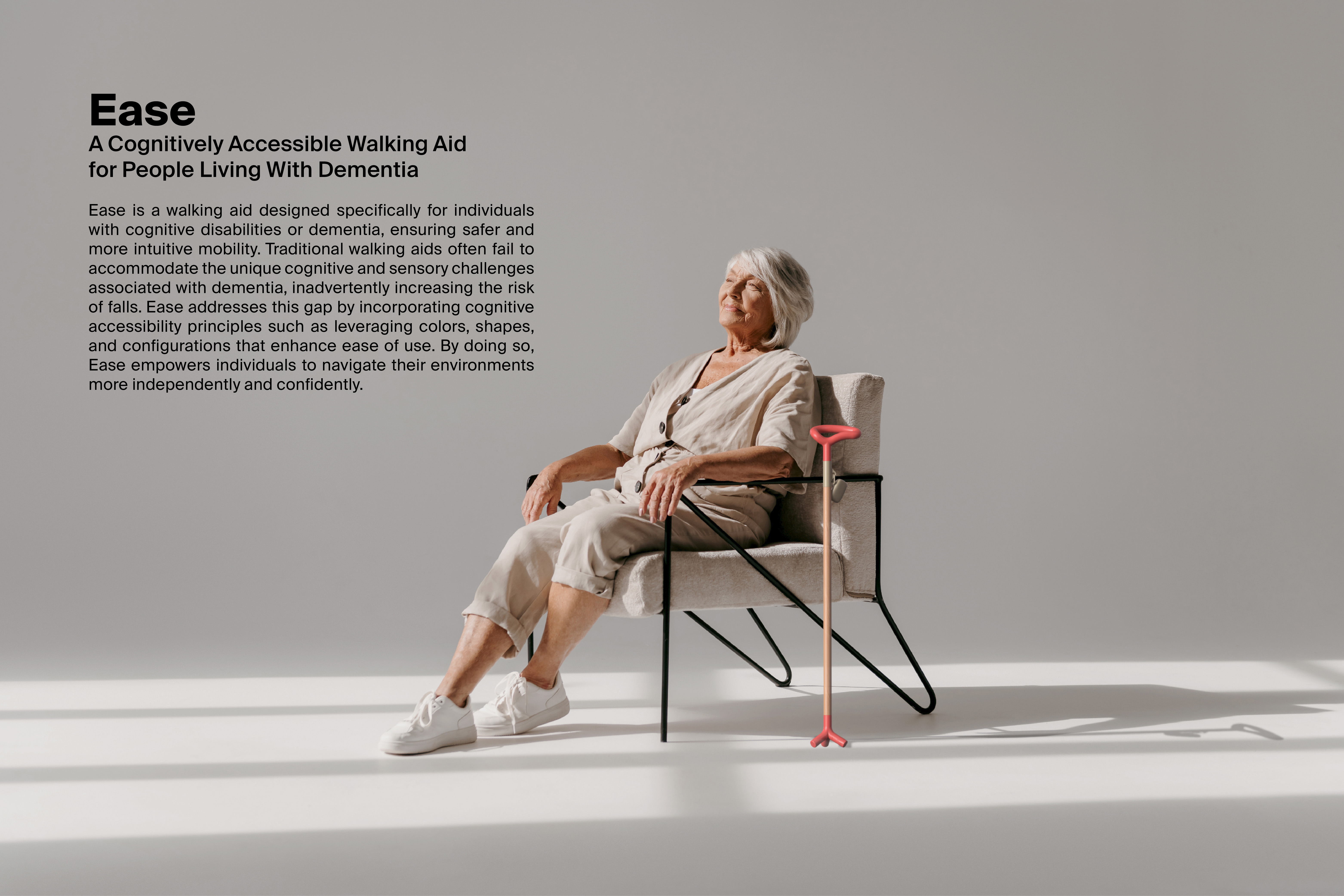 Ease is a walking aid designed especially for people living with dementia. Typically, Walking aids such as canes and walking frames are crucial for elder care. They significantly reduce the risk of falling. However, for people with dementia and cognitive impairment, the aids that were supposed to help reduce risk instead had a negative effect.