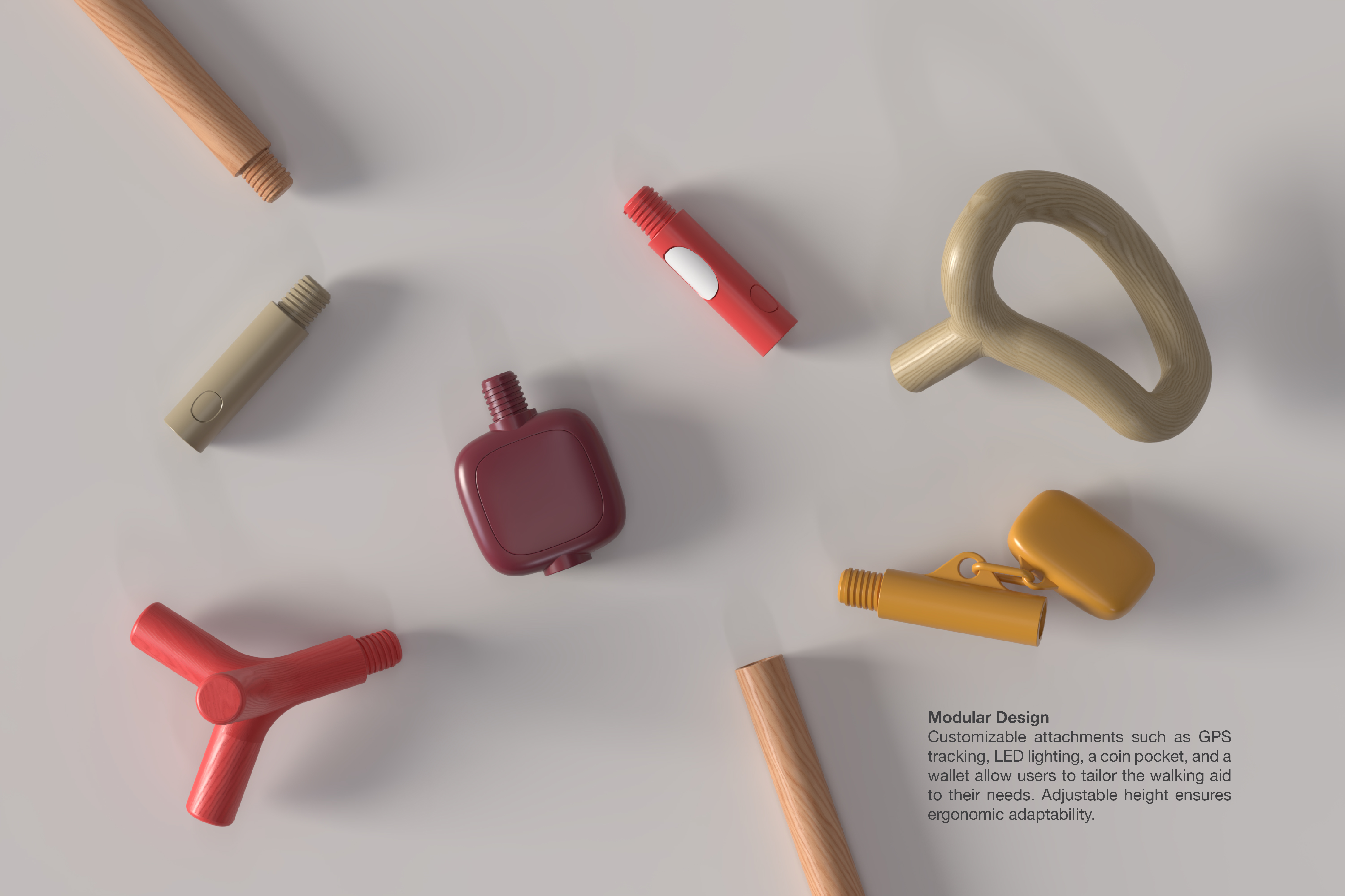 Module parts allow Ease to adapt to every unique user's needs, including GPS, LED light, coin pocket, and wallet. The modular design also allows user to customize the walking stick's height to fit their needs.