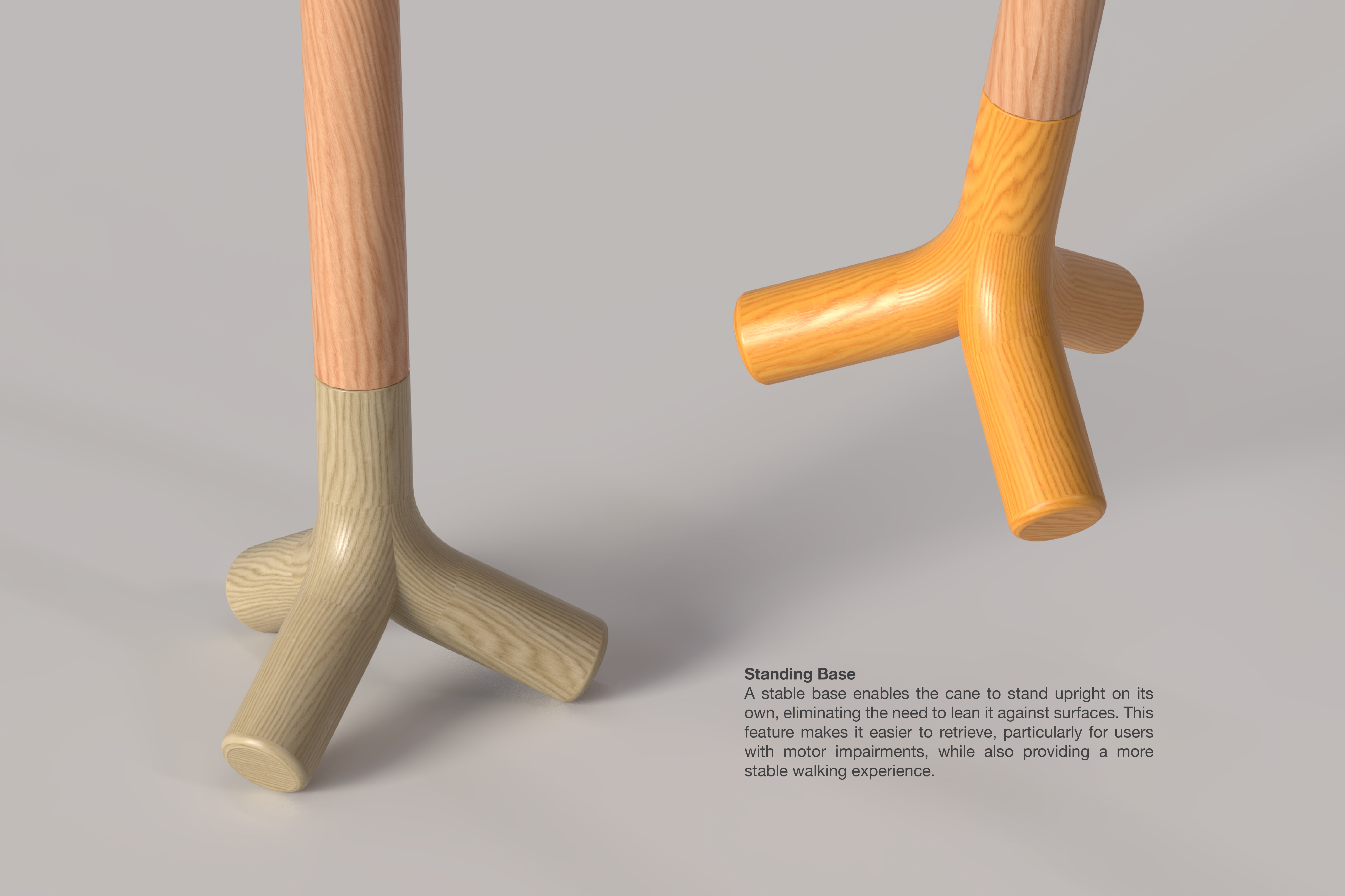 The base allows the user to place the cane everywhere without laying it down or leaning on something, making reaching for the cane when getting up from a seat or bed more effortless for those who have declined motor function.