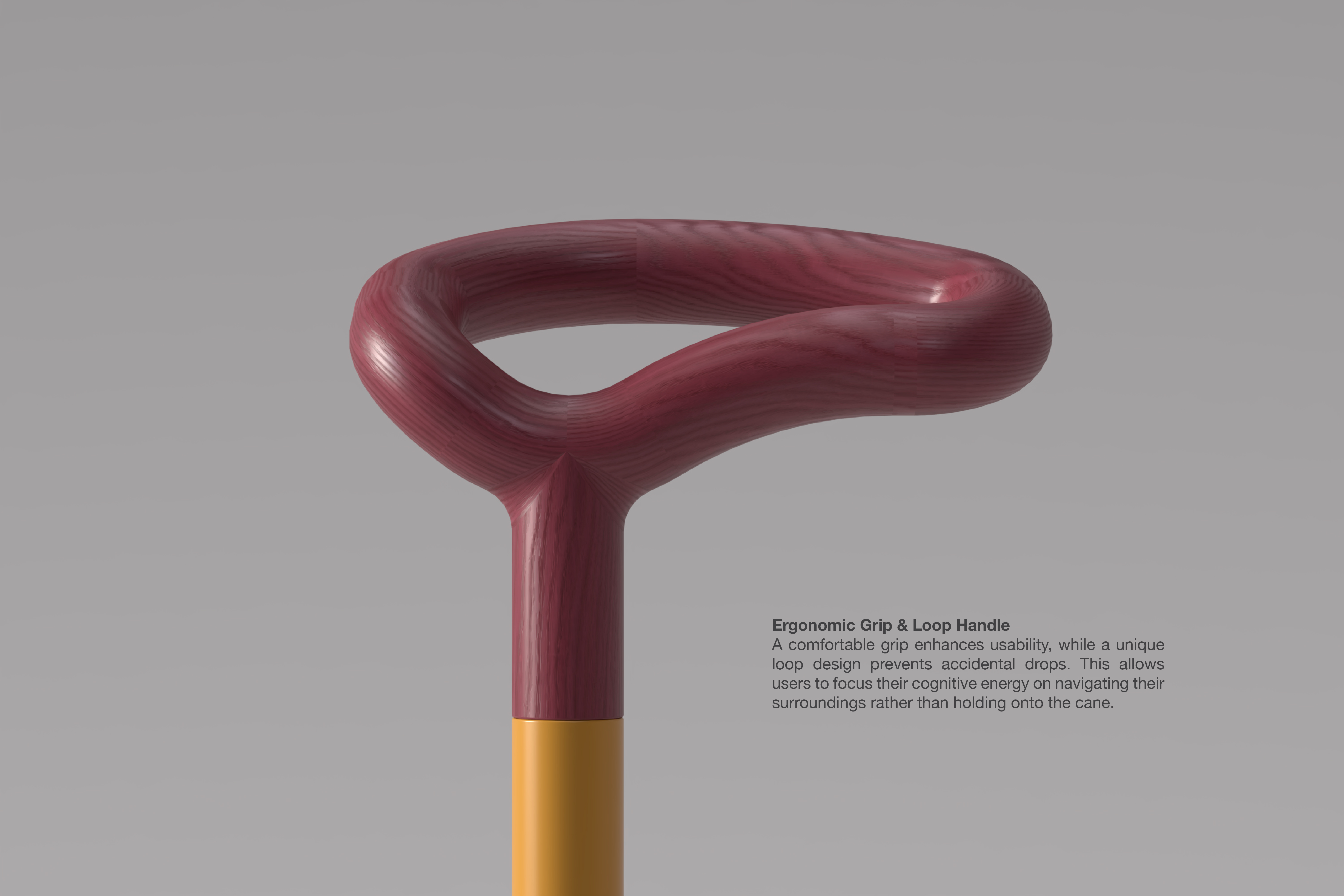 The ergonomic design provides comfort, while the loop design prevents accidental cane drops, allows the user to pay less attention when holding, and allows them to focus their cognitive ability more on the surroundings.