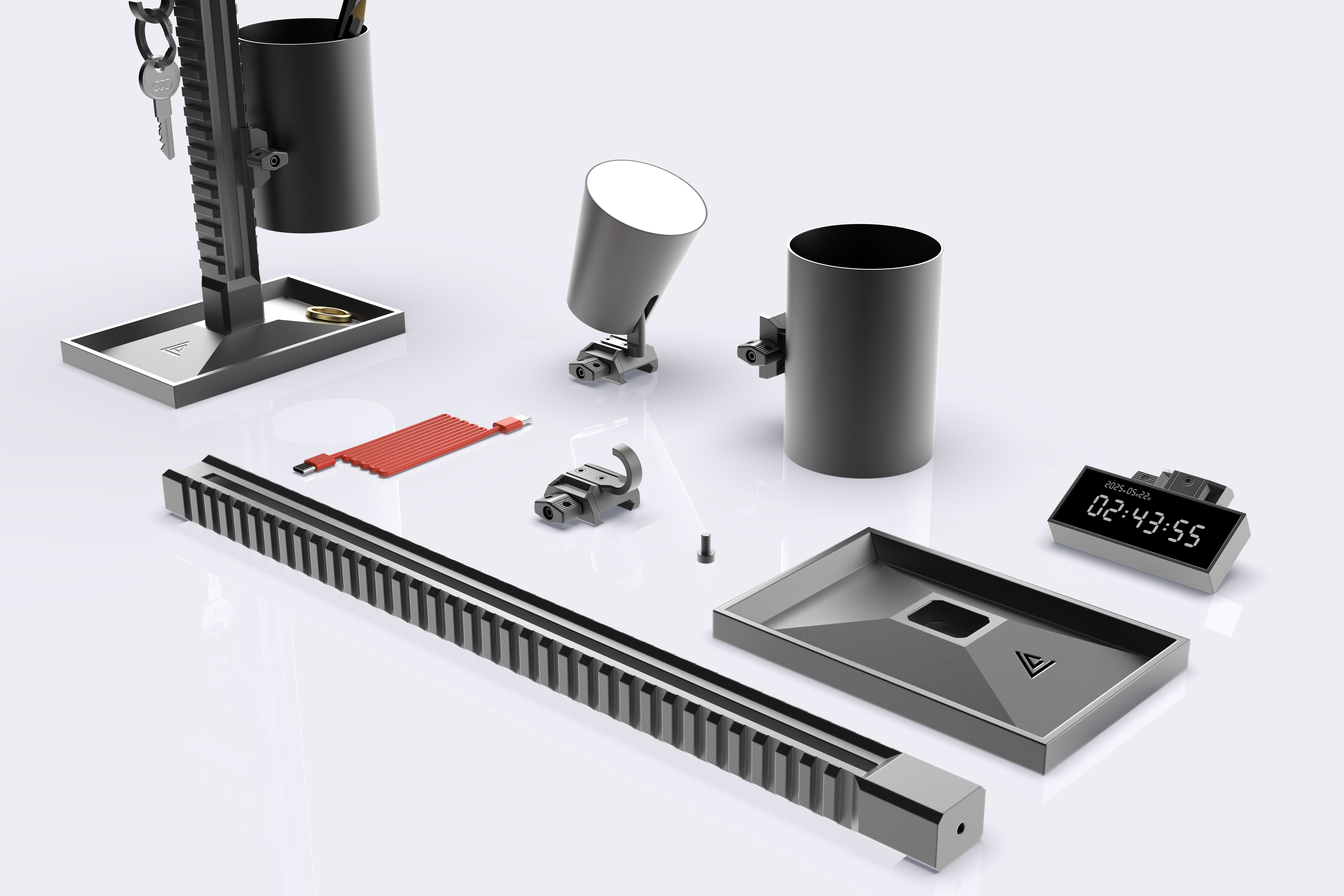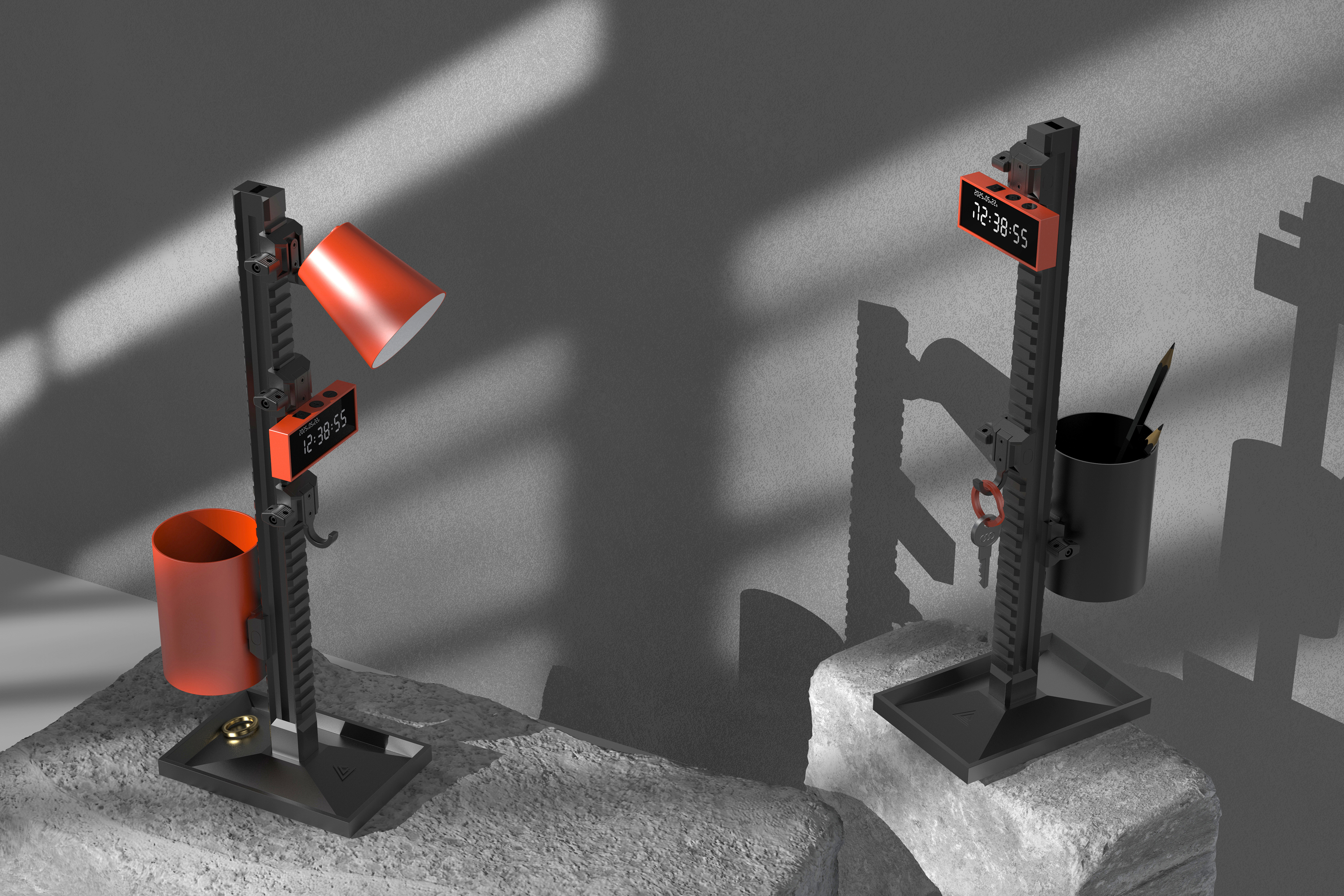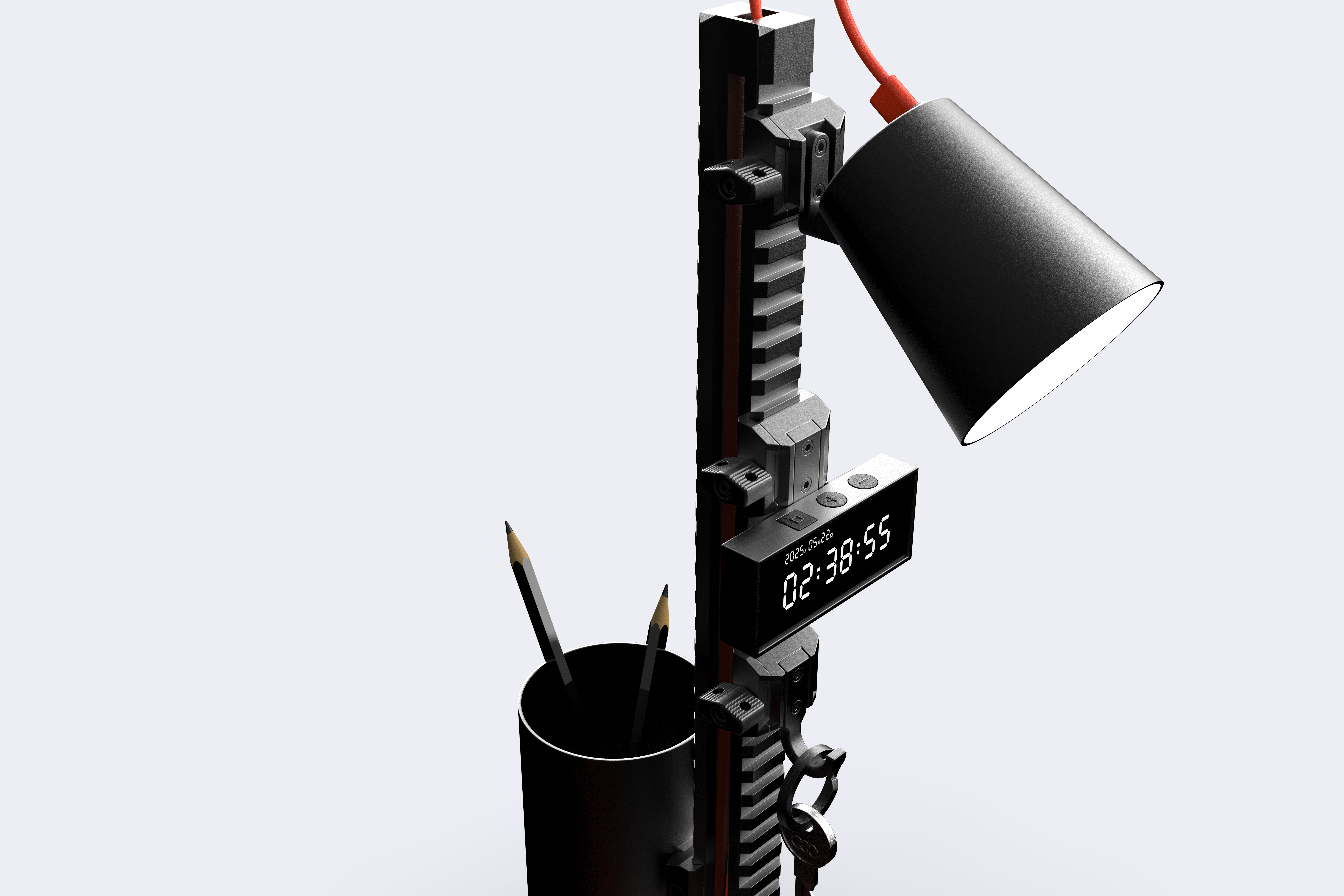 The design is inspired by the Picatinny rail locking principle, and can be flexibly equipped with a variety of functional modules, such as lighting, time display, hooks, pen holders, cell phone holders, etc., to meet the needs of personalized storage.