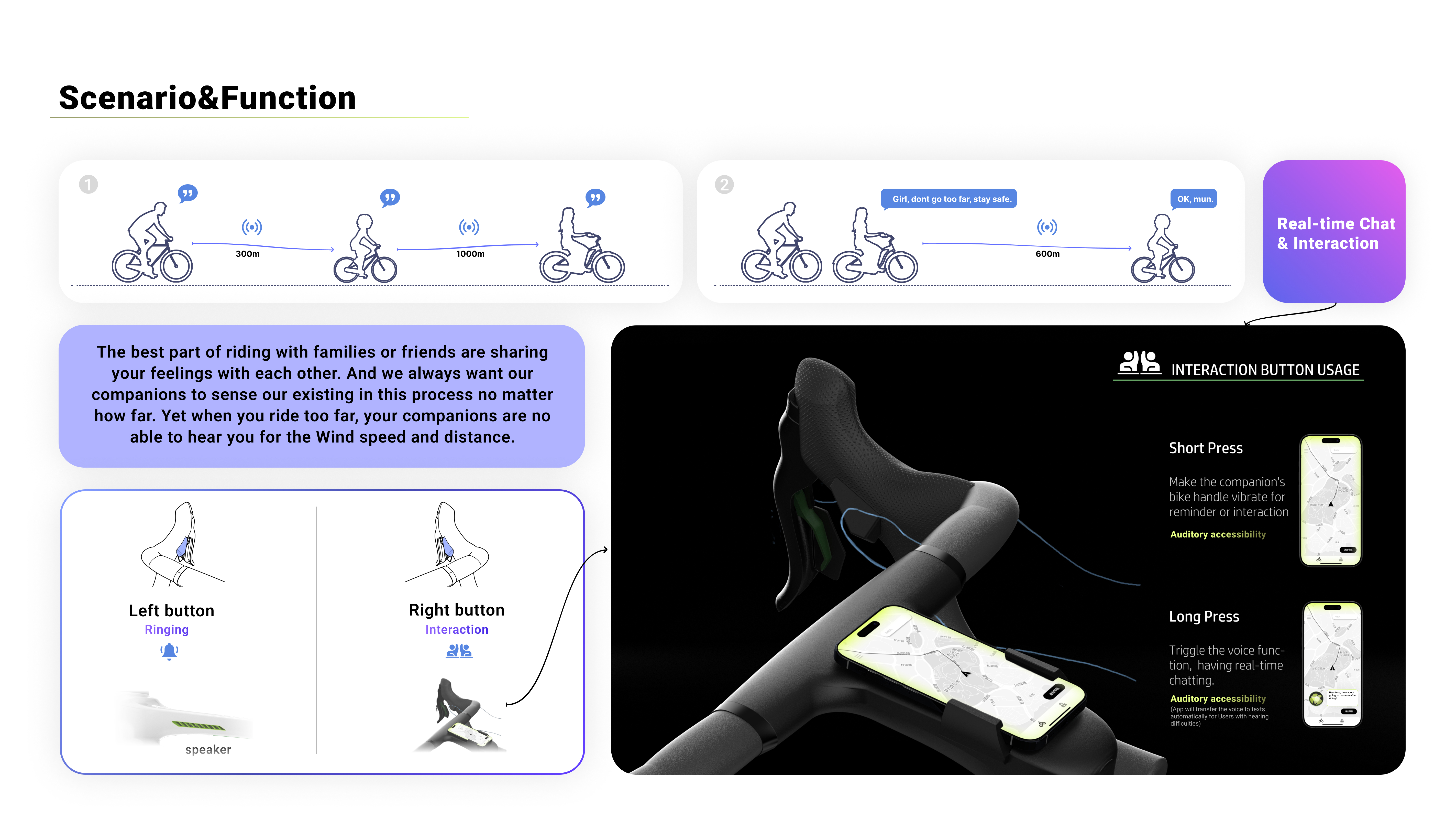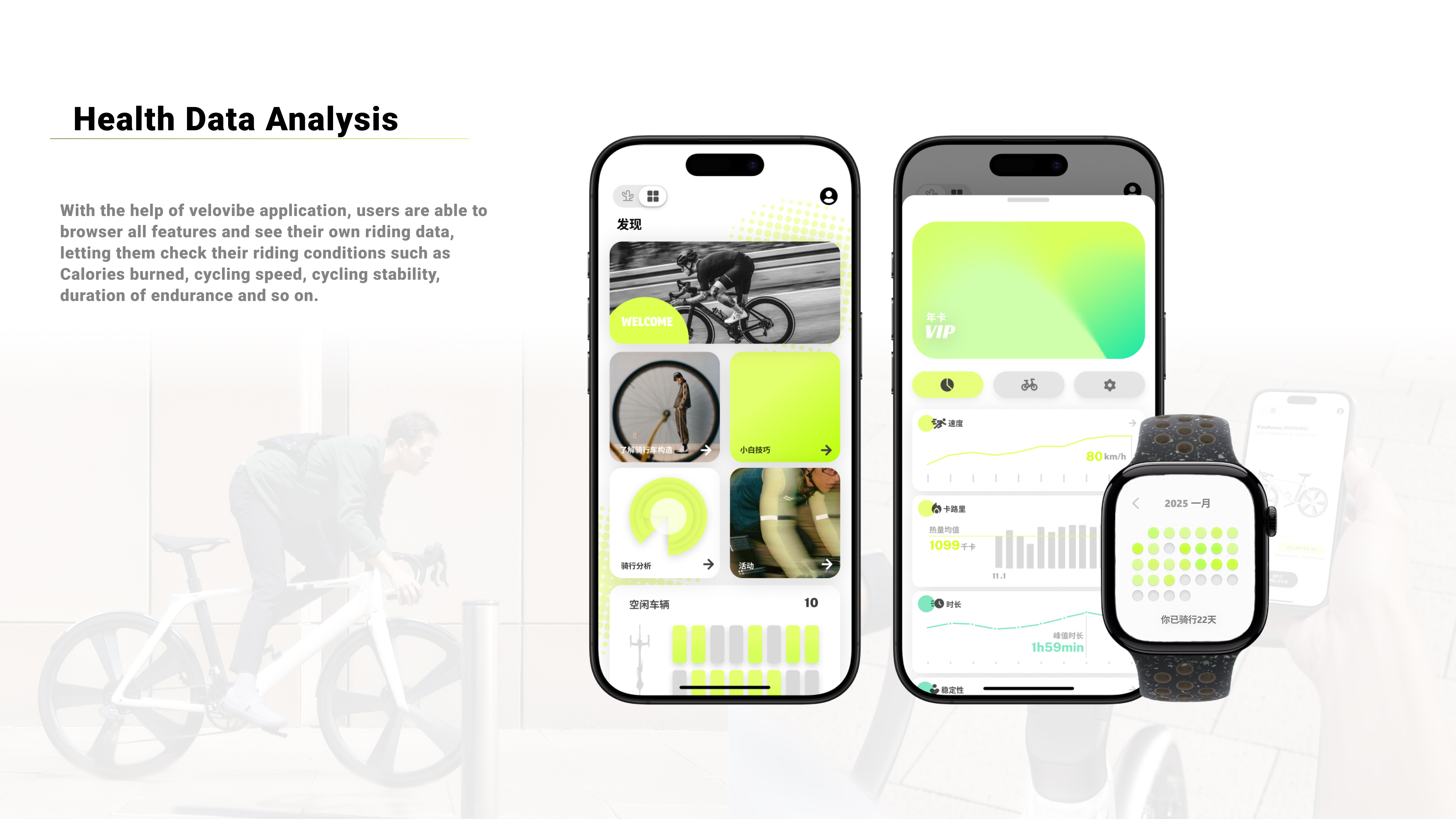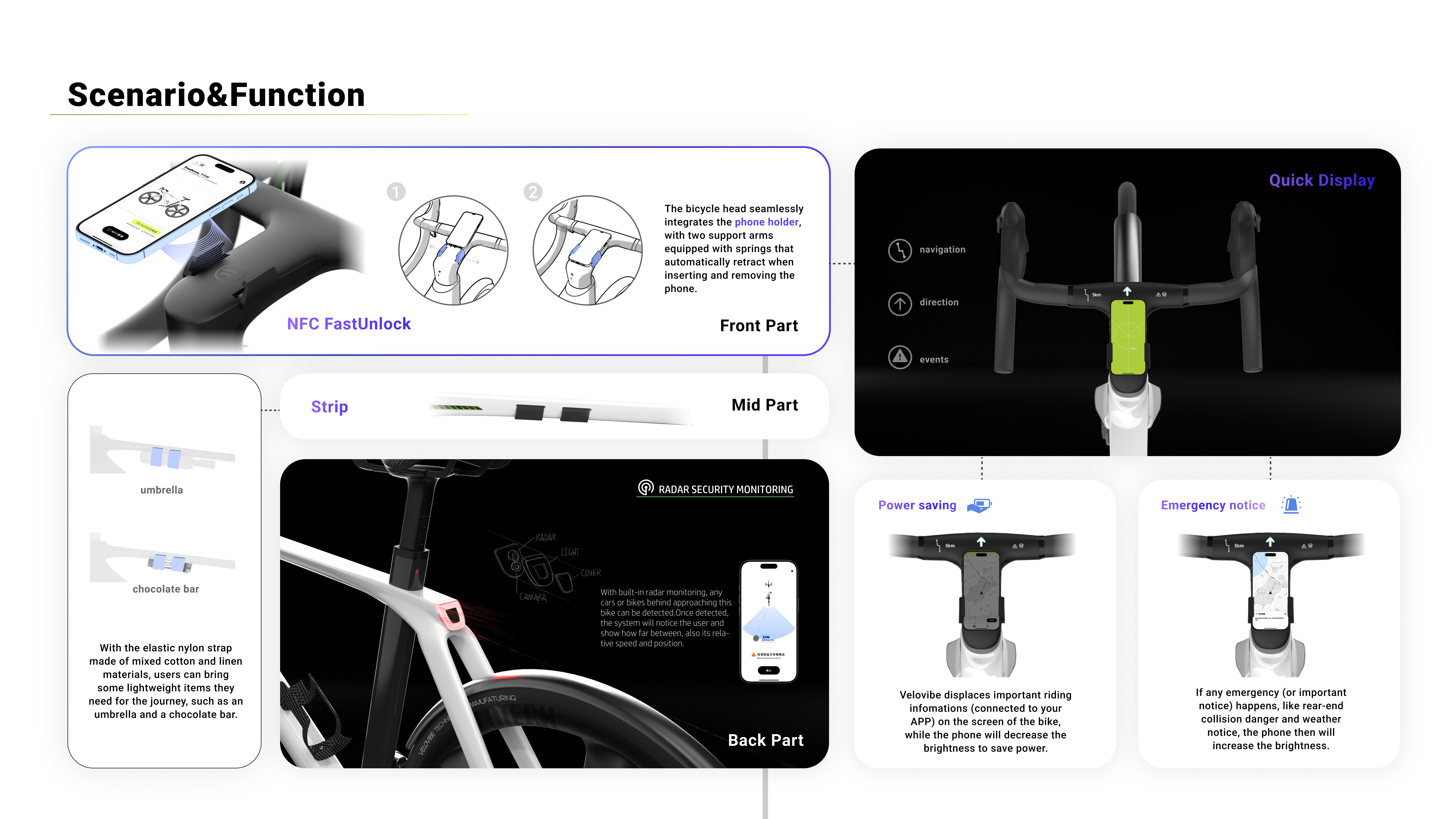 Velovibe is a shared bicycle designed for urban residents based on cycling sports. The overall architecture is designed based on road bikes and mountain bikes, and the bike has been redesigned from the perspective of individual user experience and interactive experience in family riding scenarios. Combined with intelligent systems such as FastNFC unlocking, weather and route prompts, vibration and voice interaction, the overall usage process is smooth and fun, making it more suitable for family cycling sports.