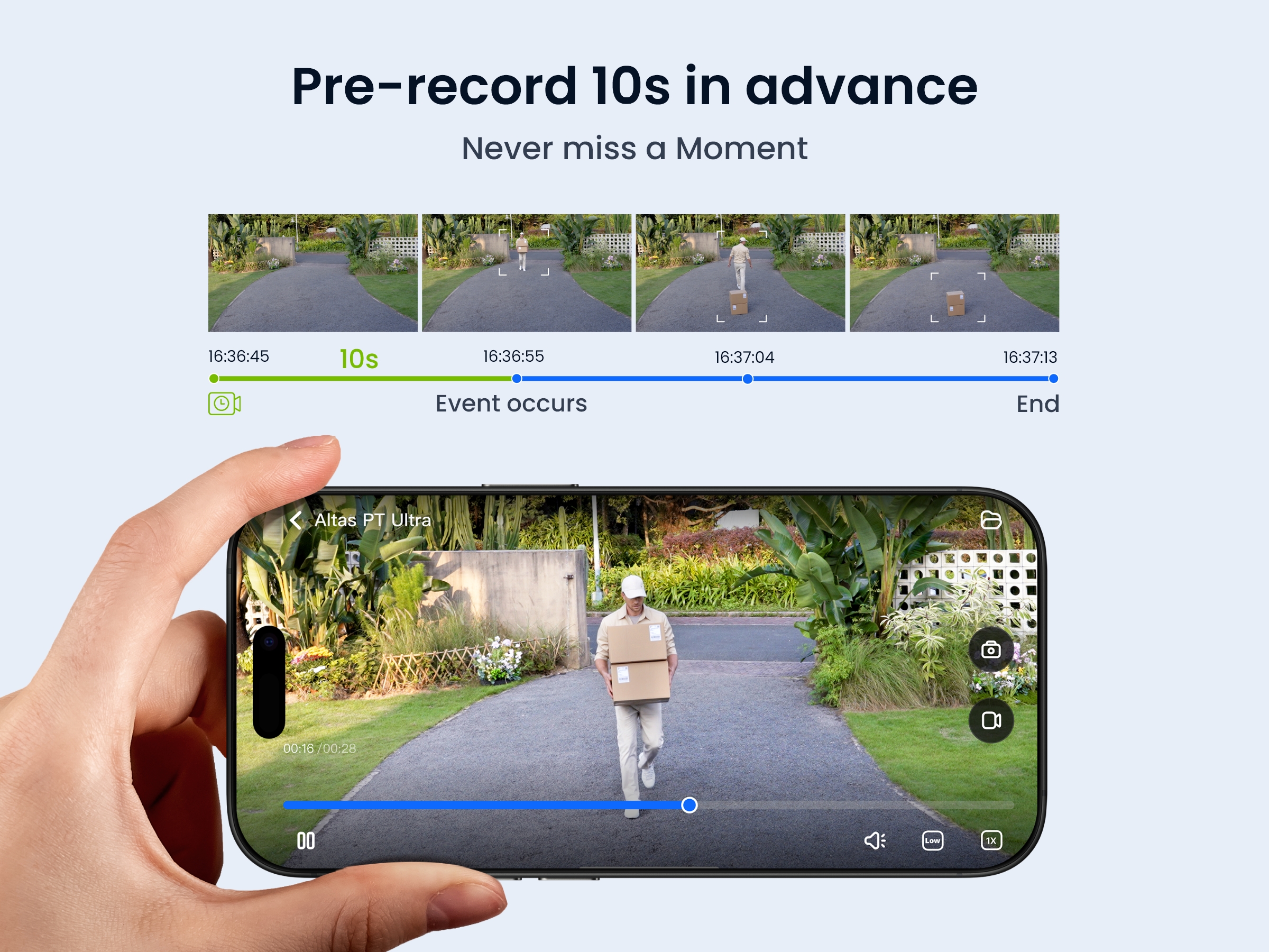The Reolink Altas PT Ultra marks a significant advancement as the world’s first battery camera with the 4K pre-recording feature. By combining groundbreaking pre-recording technology with ultra-long battery life, it effectively solves the problems of traditional PIR battery cameras—preventing critical footage loss due to trigger delays while addressing poor endurance. Its pre-recording feature automatically captures 2-10 seconds of footage before an event is detected, ensuring complete event recording; meanwhile, the device can last up to 500 days on a single charge, which breaks through the endurance limitations of its traditional counterparts, effortlessly enabling continuous monitoring for extended periods. Furthermore, its 4K ultra-clear view, smart detection & auto tracking capabilities, ColorX night vision, and dual-band WiFi 6 connection collectively elevate both performance and user experience to new heights.