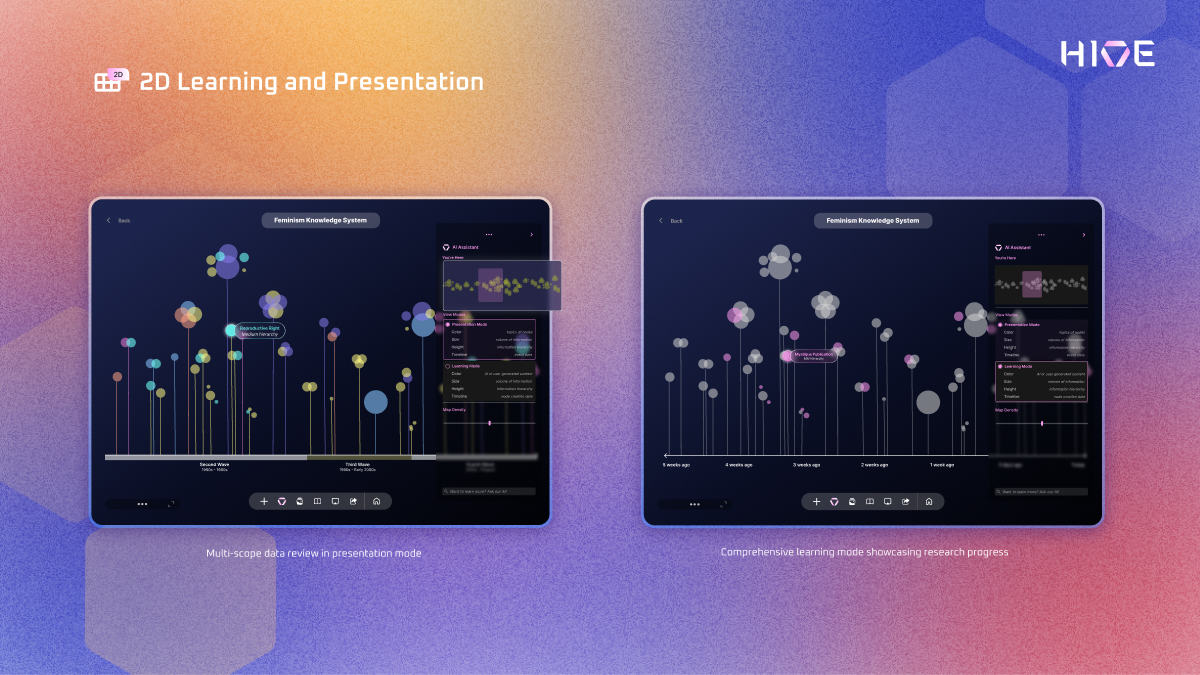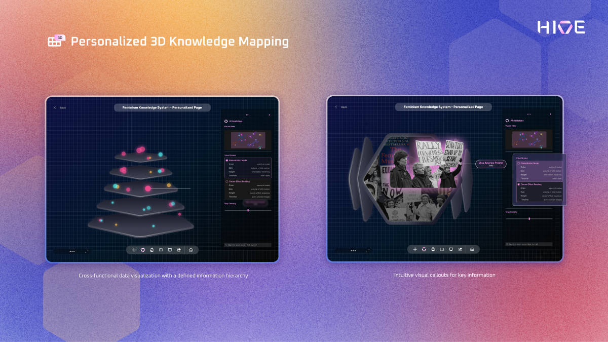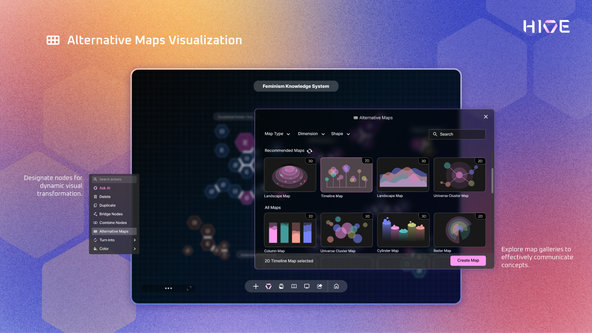Moreover, Hive AI offers a variety of visually engaging and effective data visualization templates, enabling learners to organize and showcase their knowledge in formats tailored to different topics, disciplines, or knowledge types. For instance, a historical timeline can illustrate the evolution of a social ideological trend, while a 3D hexagon template vividly maps the relationships between various topics and central ideas.