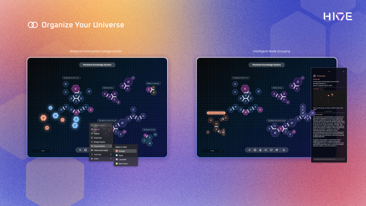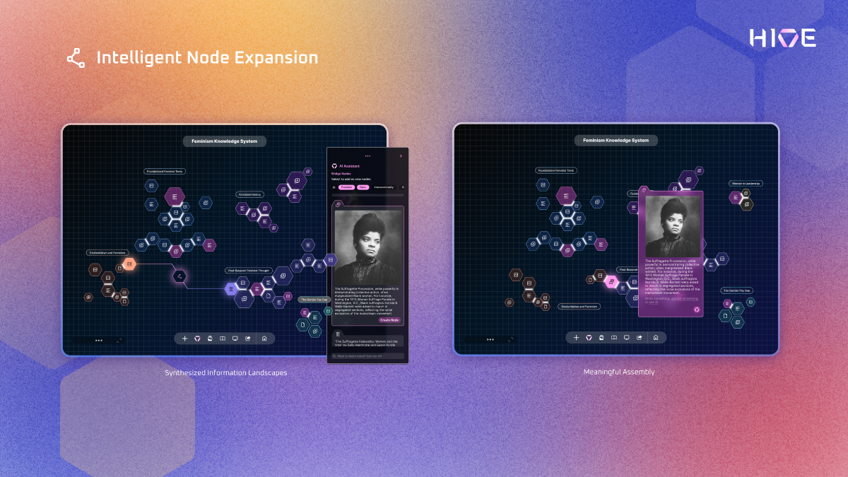 Hive AI breaks through the limitation of traditional AI learning platforms that rely on rigid question-answer formats, limiting autonomy and exploration. It leverages neural networks in machine learning to monitor users' thought processes and organize them into structured knowledge systems. AI facilitates nonlinear exploration, transferring into node-based structures, learners can upload and organize information in various formats, such as text, videos, and images, while AI assists in expanding connections and identifying knowledge gaps. Hive AI can help users expand these nodes based on their interests, bridge gaps between different nodes, and organize them into labeled groups for easier memorization and comprehension.