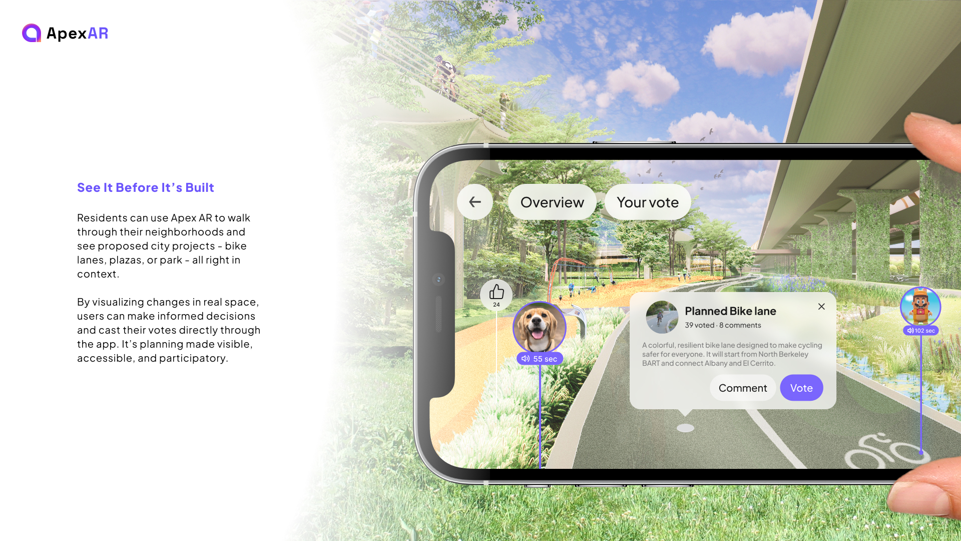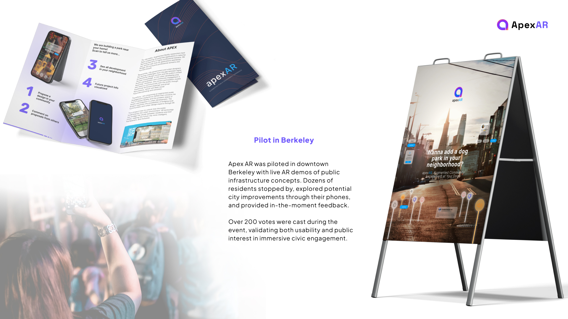 Traditional civic processes are often bureaucratic, opaque, and disconnected from the public. Apex AR tackles this problem by putting visual, place-based decision-making directly into people’s hands. A pilot program was successfully conducted in downtown Berkeley in 2024. Participants interacted with AR visualizations of proposed urban upgrades and voted via the app. The response was overwhelmingly positive, with users praising its ease of use and sense of empowerment. The full version of Apex AR is currently under development, with plans for wider deployment across several city districts.