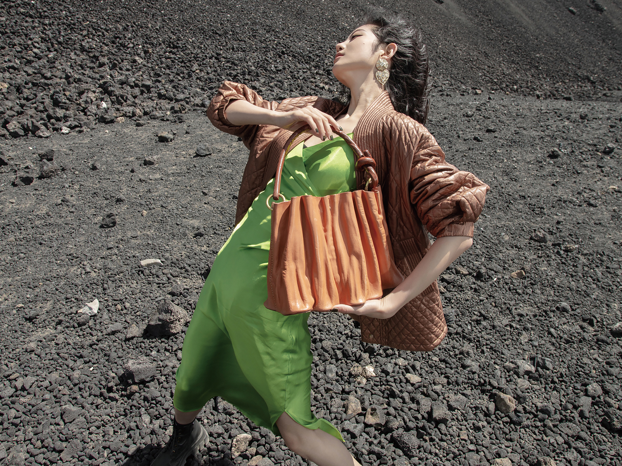 The bottom is designed and cut in a three-dimensional way, resembling the shape of a mountain. The space inside the bag can hold daily necessities and a small tablet computer. The magnetic clasp with a leather patch attached to the bag opening makes the space more practical.