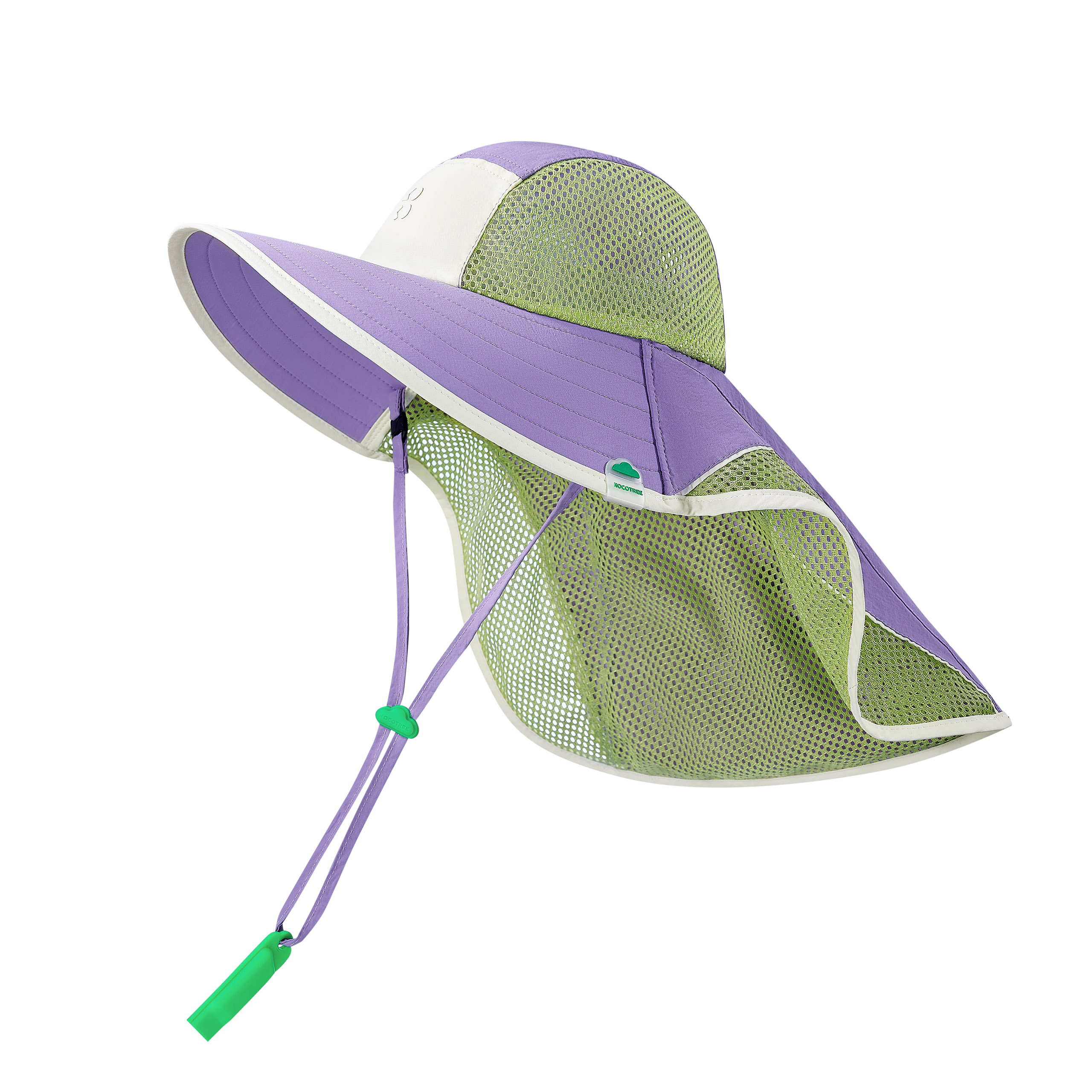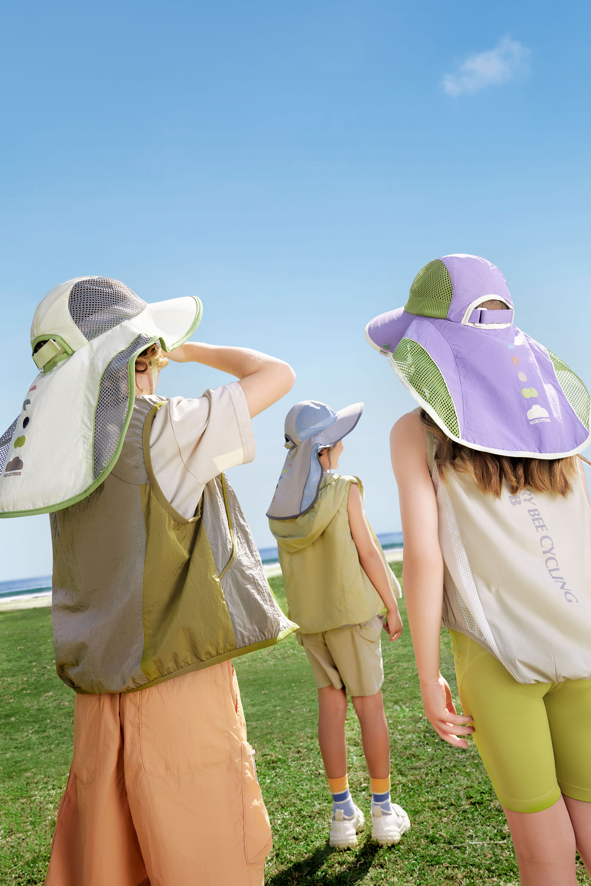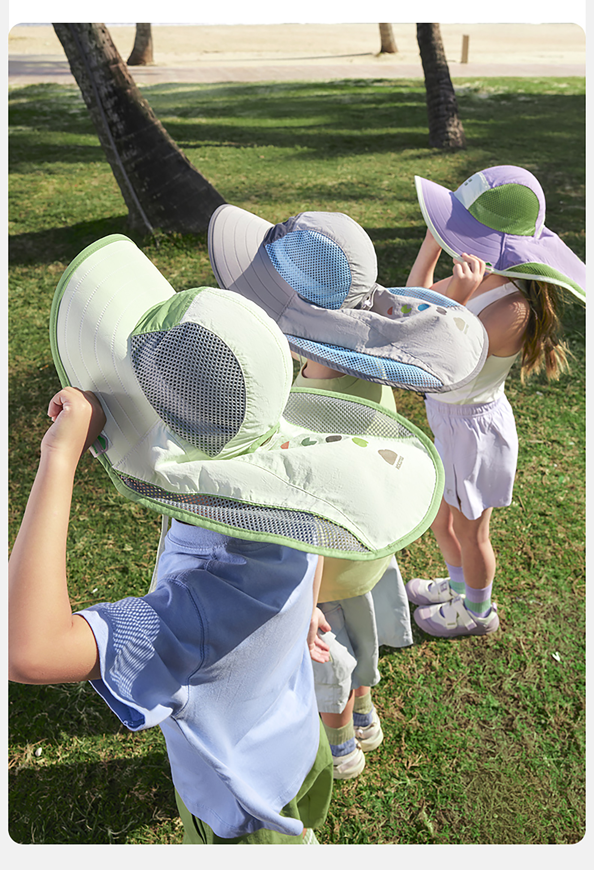 The product adopts an integrated oversized brim and full-coverage shawl, utilizing UV-sensitive color-changing materials to visually indicate sunlight intensity levels. The vibrant color-block aesthetics and breathable mesh panels provide 360° head-to-shoulder physical protection while infusing a sporty, fashion-forward style. Adjustable features including the head circumference system, cloud-shaped toggle buckle, and detachable windproof strap ensure customized fit for children aged 3 to 12, offering exceptional comfort and stability. Reflective trim printing enhances nighttime visibility, while the detachable safety whistle completes an all-weather outdoor protection system.