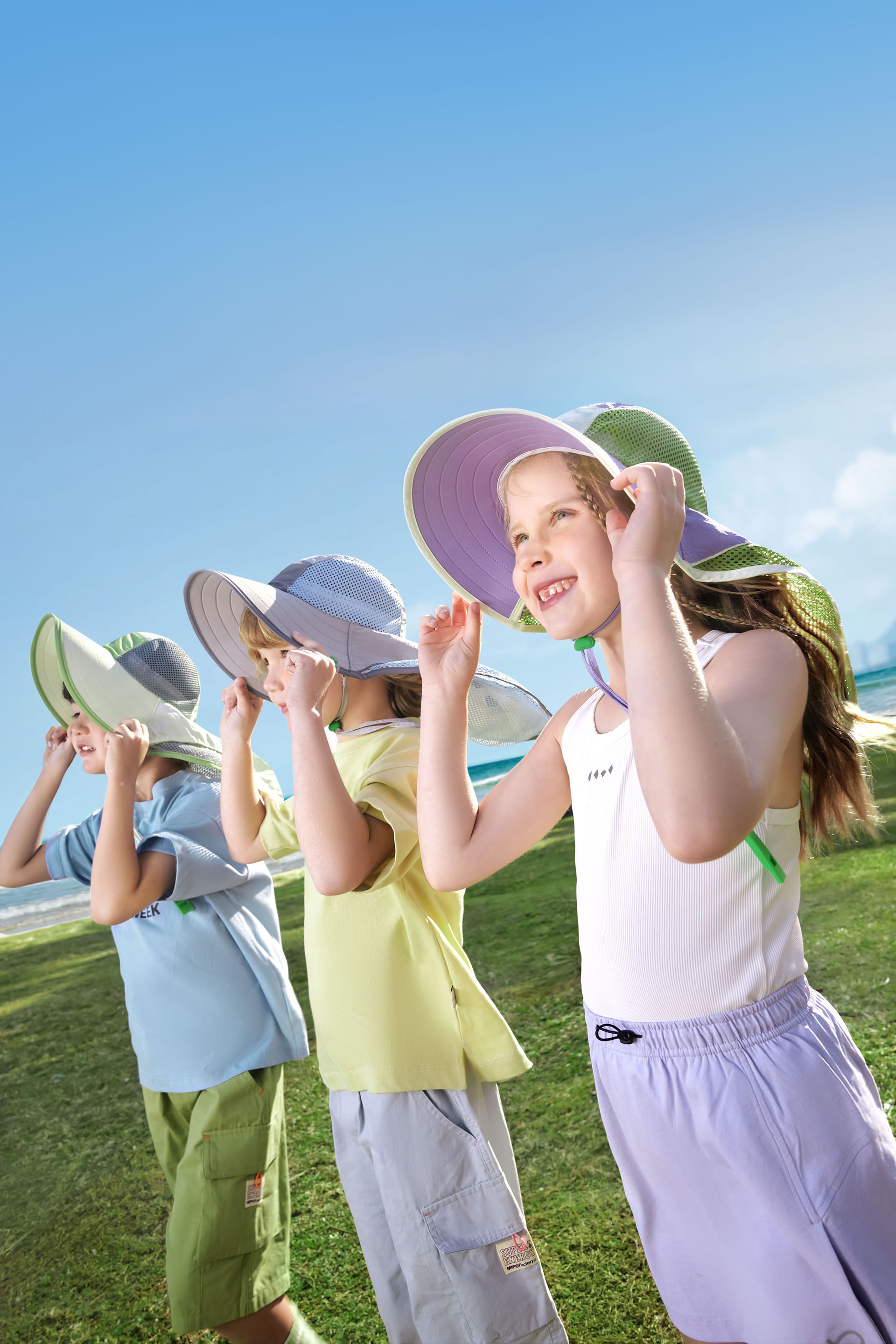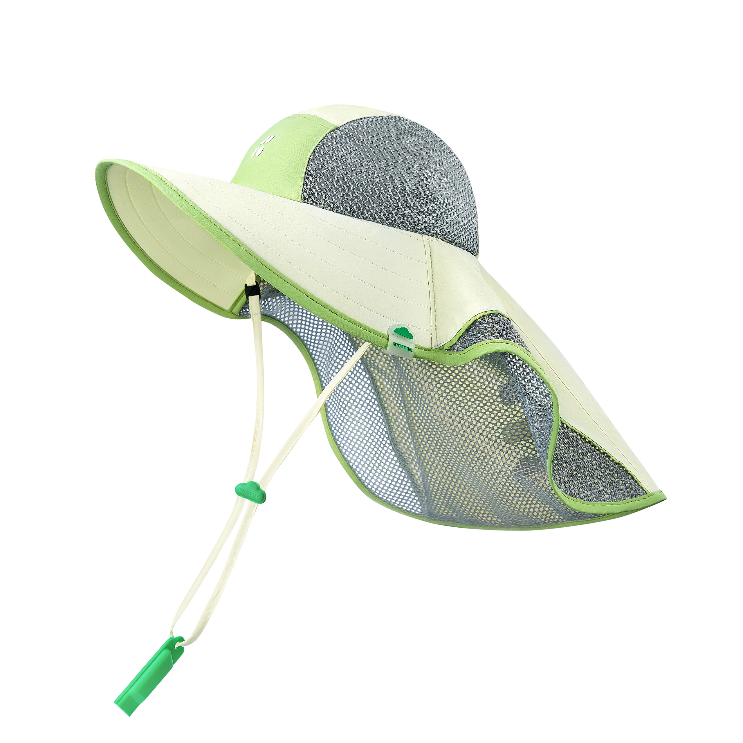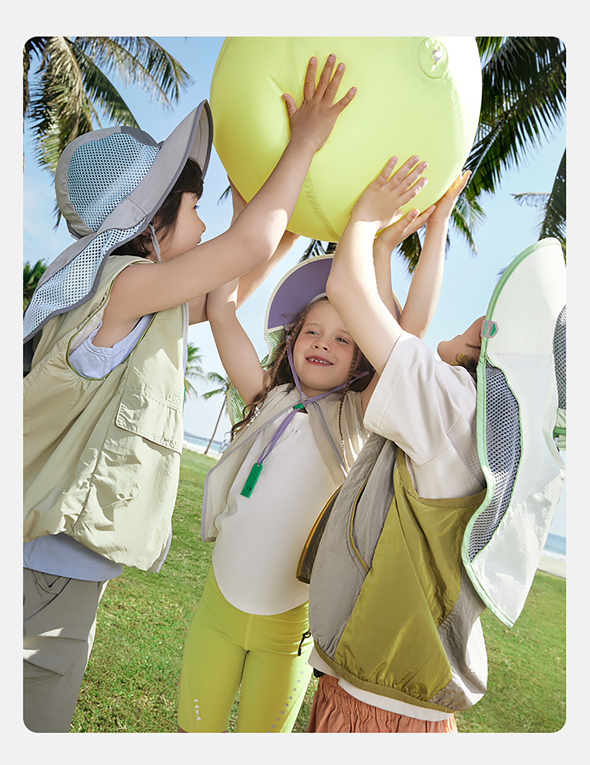 The product adopts an integrated oversized brim and full-coverage shawl, utilizing UV-sensitive color-changing materials to visually indicate sunlight intensity levels. The vibrant color-block aesthetics and breathable mesh panels provide 360° head-to-shoulder physical protection while infusing a sporty, fashion-forward style. Adjustable features including the head circumference system, cloud-shaped toggle buckle, and detachable windproof strap ensure customized fit for children aged 3 to 12, offering exceptional comfort and stability. Reflective trim printing enhances nighttime visibility, while the detachable safety whistle completes an all-weather outdoor protection system.