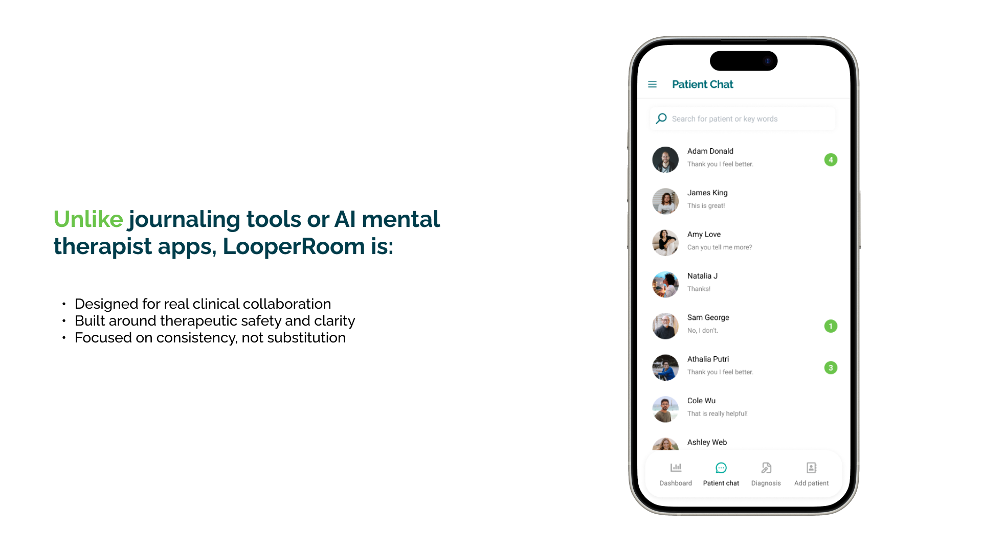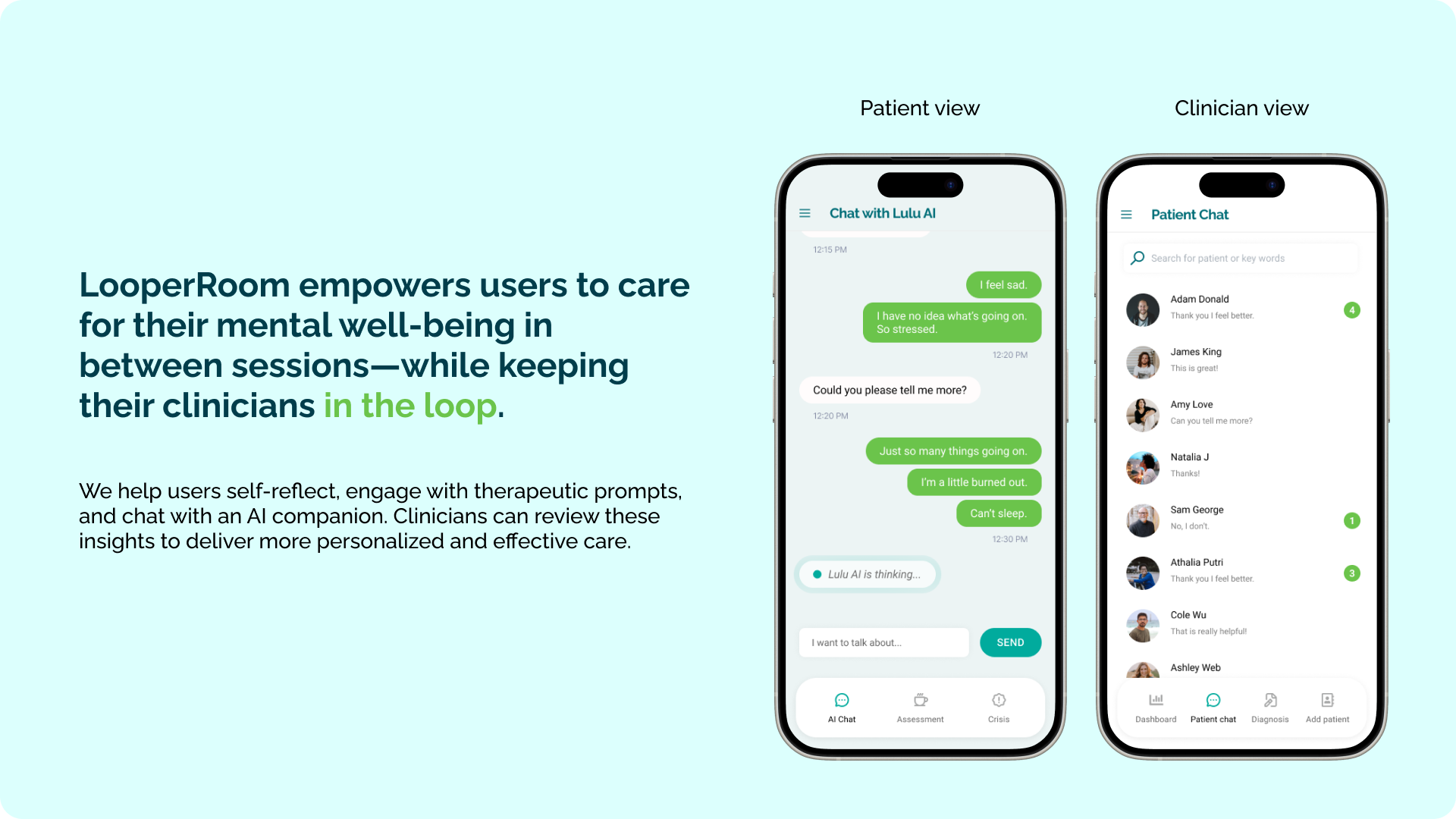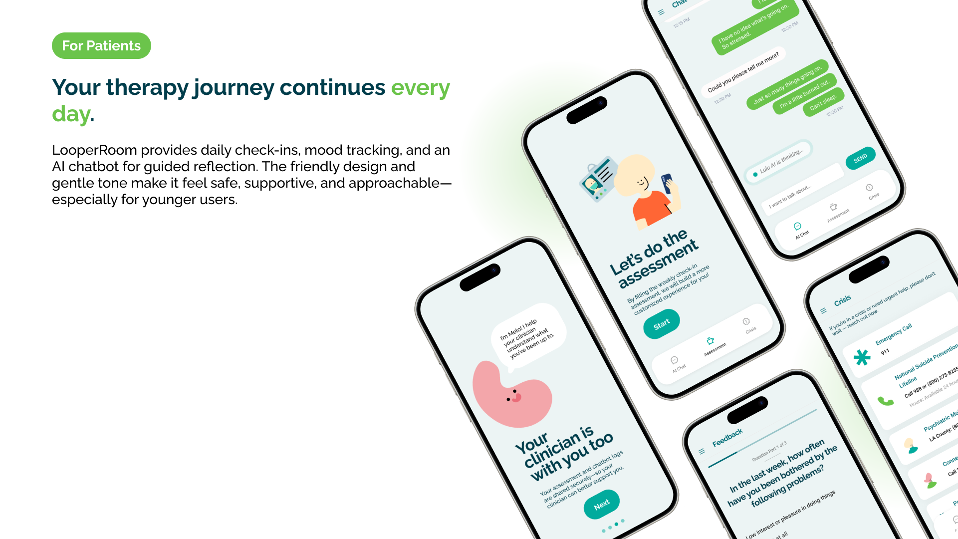 LooperRoom is a mental health support platform that connects patients and clinicians between therapy sessions—bridging one of the most overlooked gaps in care.