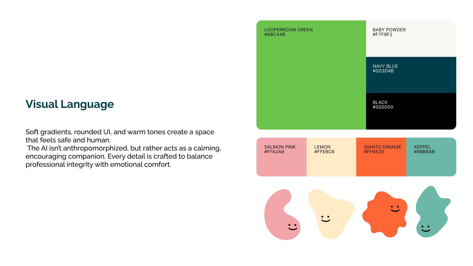 By offering AI-guided reflections and daily emotional check-ins, patients feel supported in their everyday life, not just during appointments. Clinicians can access summarized insights to monitor progress and deliver more personalized support. Designed with empathy and clarity, LooperRoom strengthens therapeutic relationships and helps reduce drop-out in an overburdened care system.