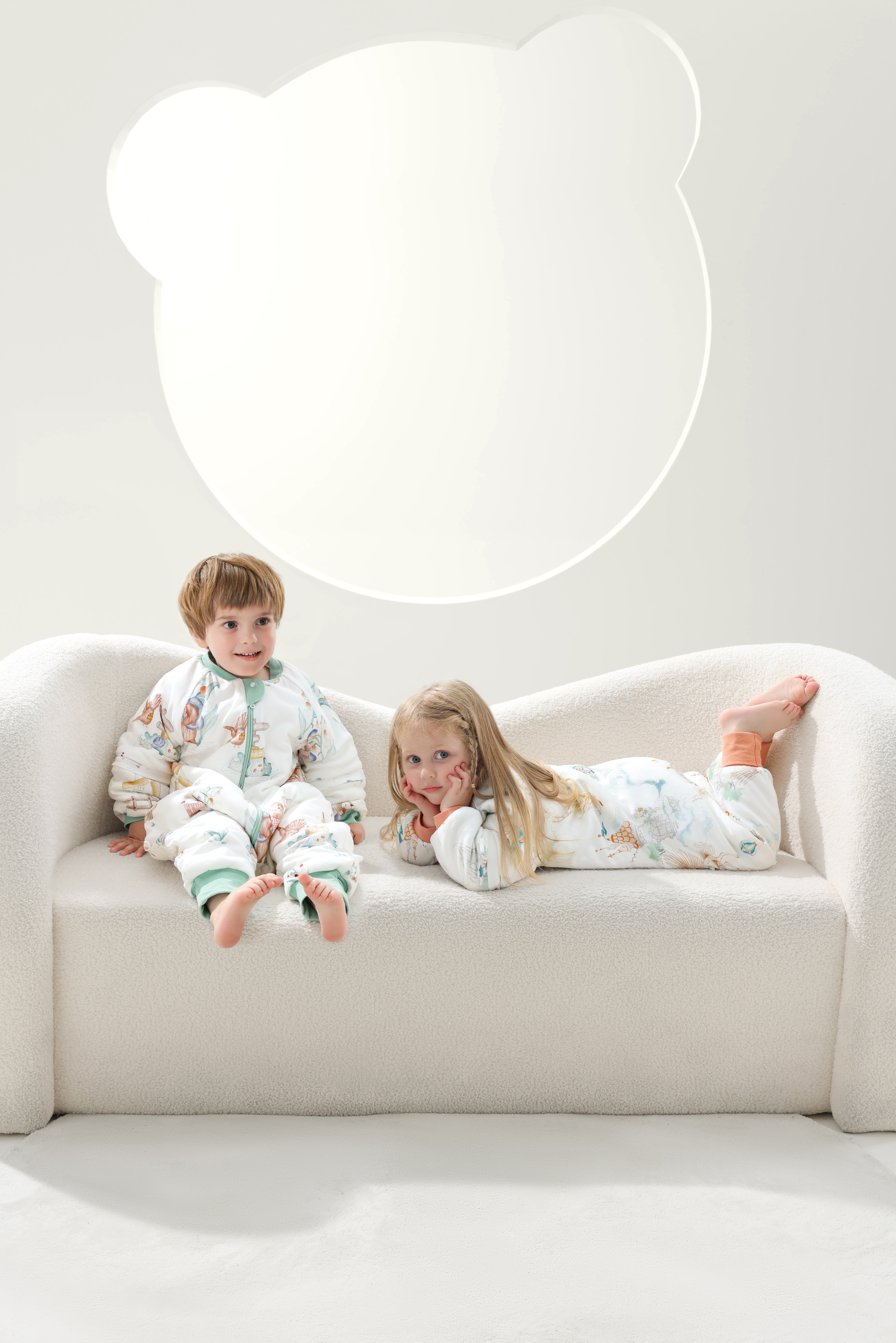 The dynamic, activity-friendly design introduces a split-leg cut, breaking away from conventional restrictive sleep sacks. This allows babies to kick, crawl, and move freely, making it suitable for both sleep and everyday activities.