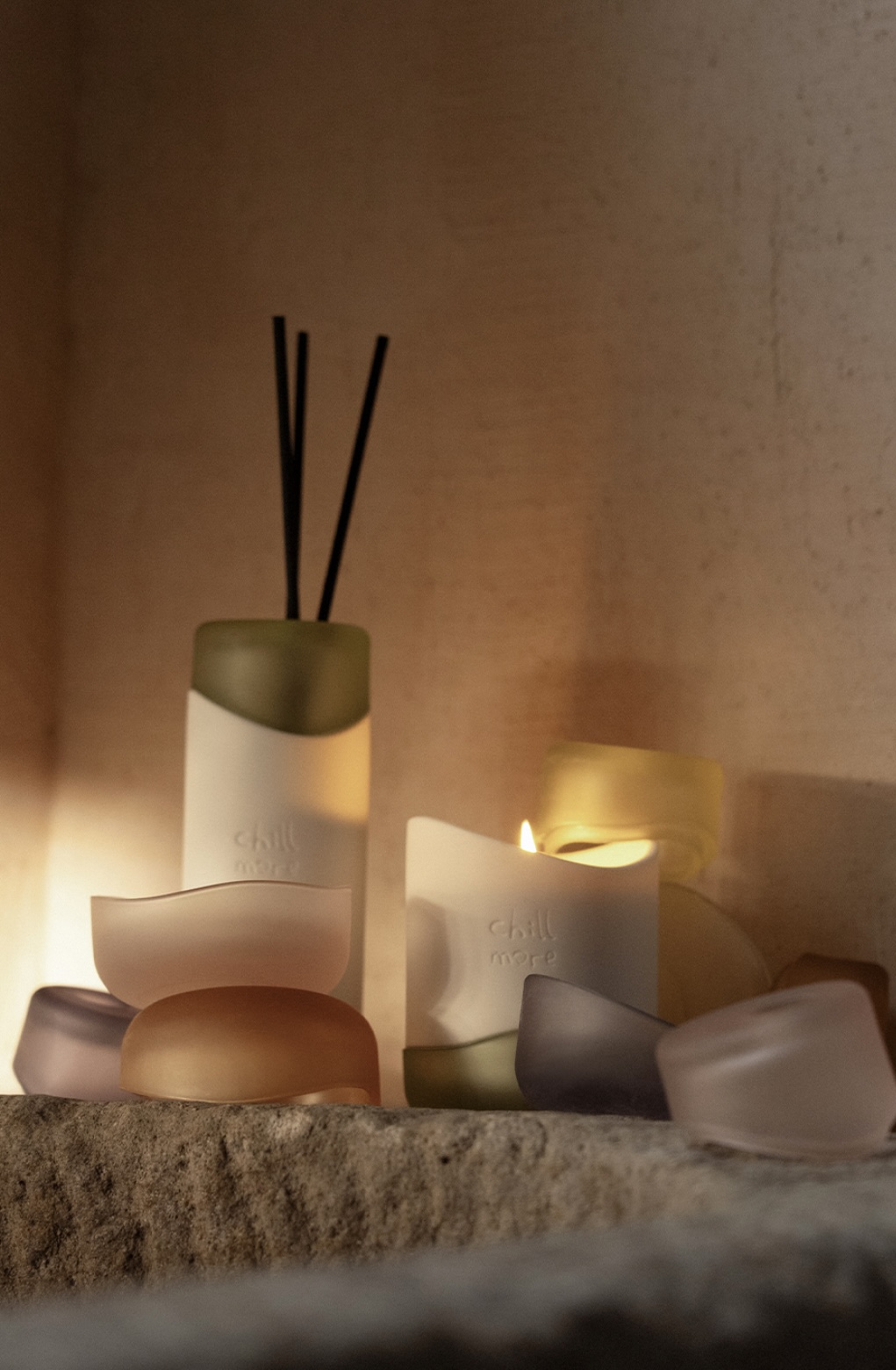 The design centers around sensory calm and emotional minimalism. Its soft matte texture, muted color palette, and elegantly restrained packaging are all intended to reduce visual noise and support a feeling of stillness. Each scent name and visual detail reinforces the experience of quiet presence, without loud self-care messaging or performative luxury.