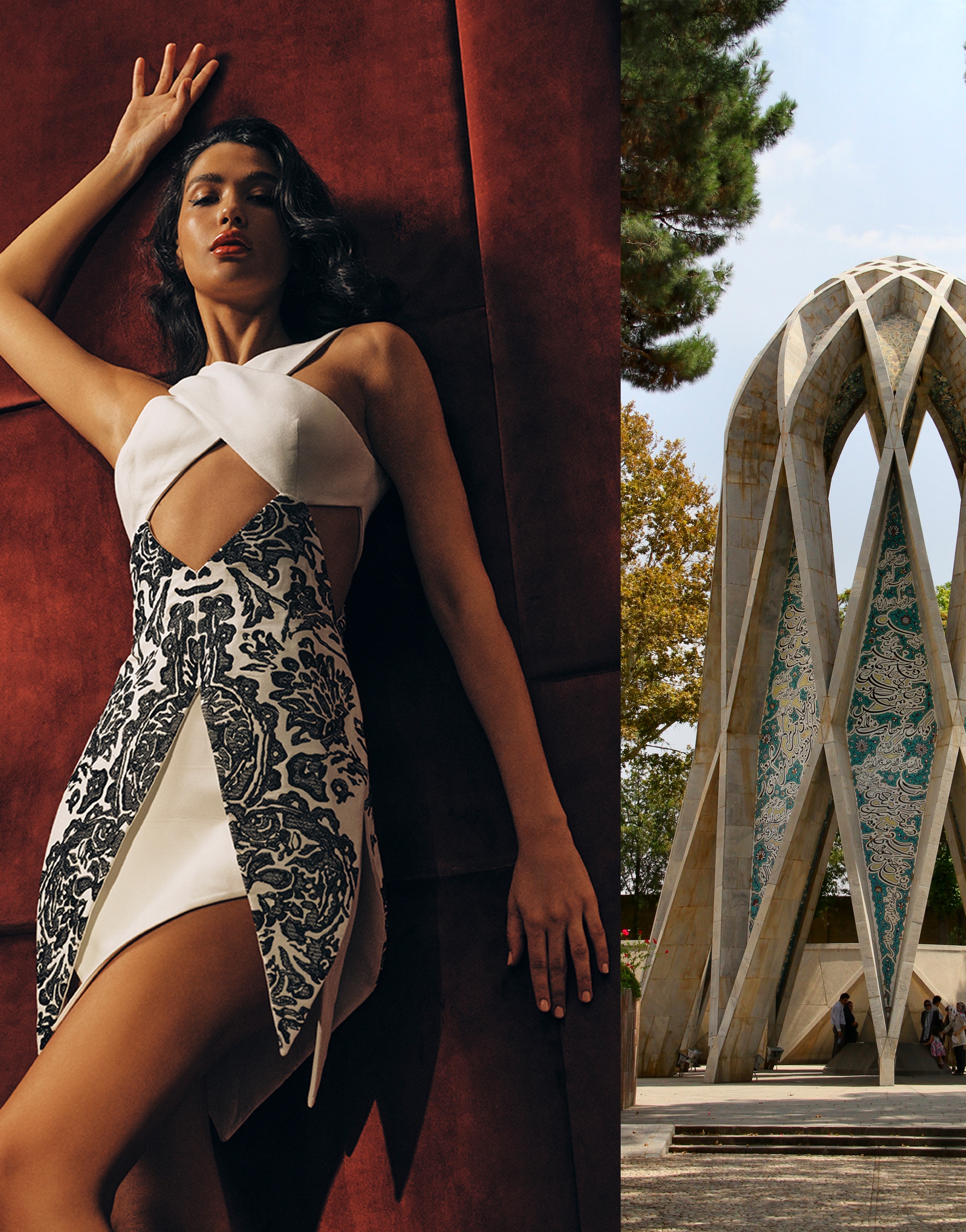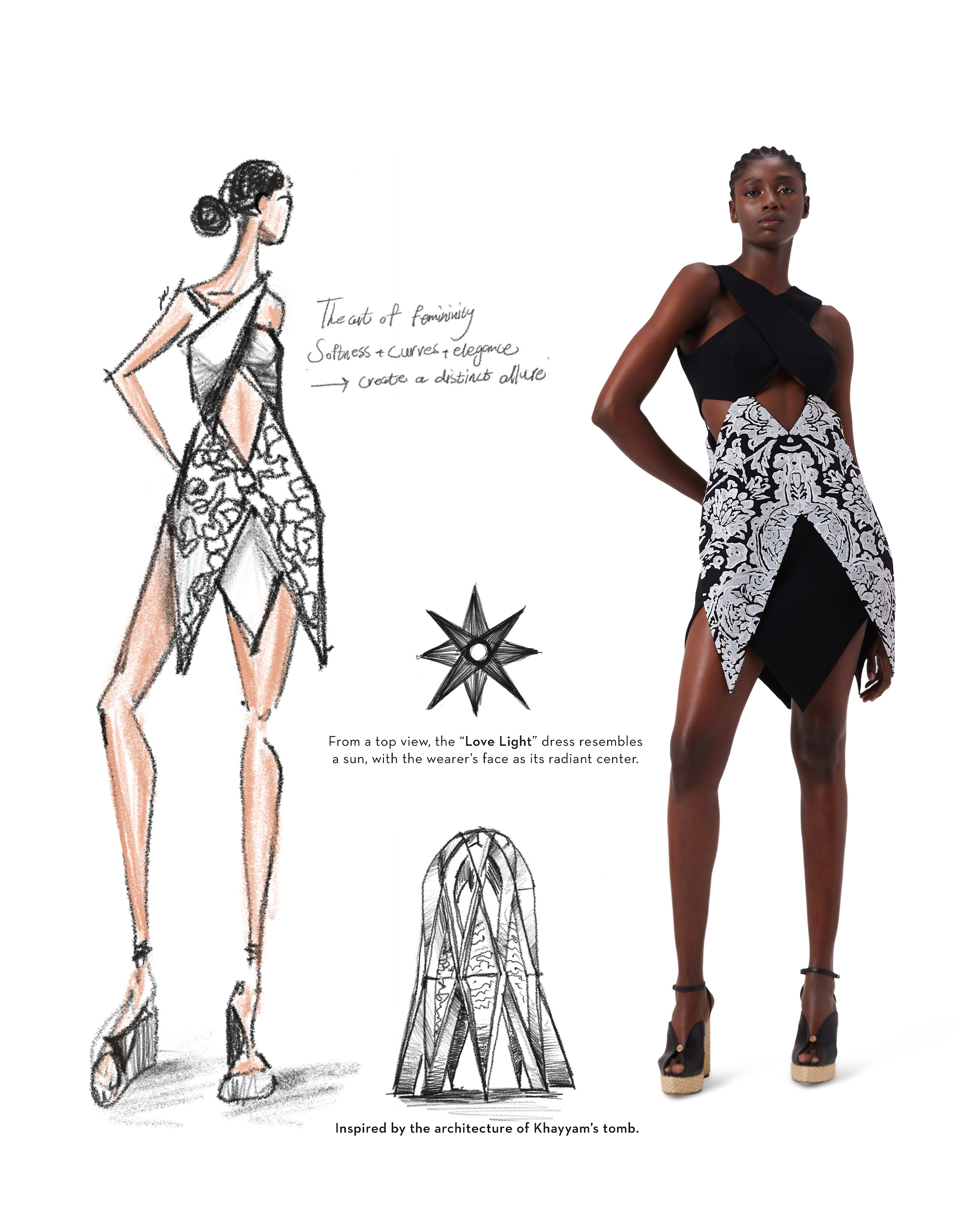 The Lovelight Dress is a halter neck design that embodies the poetic presence of light through geometric rhythm and symbolic resonance. Its structure draws inspiration from the iconic architecture of the tomb of Omar Khayyam, designed by architect Hooshang Seyhoun, where intersecting lines and celestial geometry create a timeless dialogue between space and light. In this dress, each panel acts like a shard of light, forming a body in motion, a sacred geometry worn rather than built.