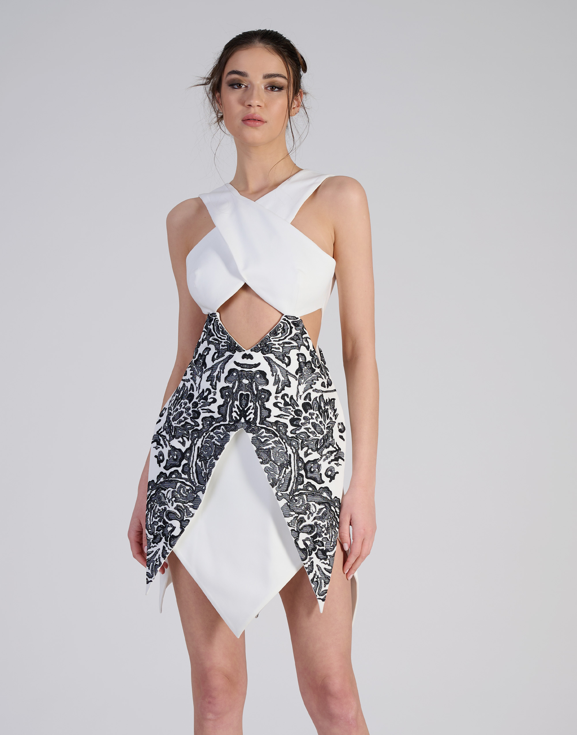 Crafted from NOUSHELLA’s custom woven jacquard, the textile carries divine motifs that echo ancient cosmologies. As the wearer moves, the panels shift like sunlight through a lattice, playing between concealment and revelation. The interplay of light and shadow becomes both a garment and a metaphor, transforming the body into a shrine of grace and clarity.
