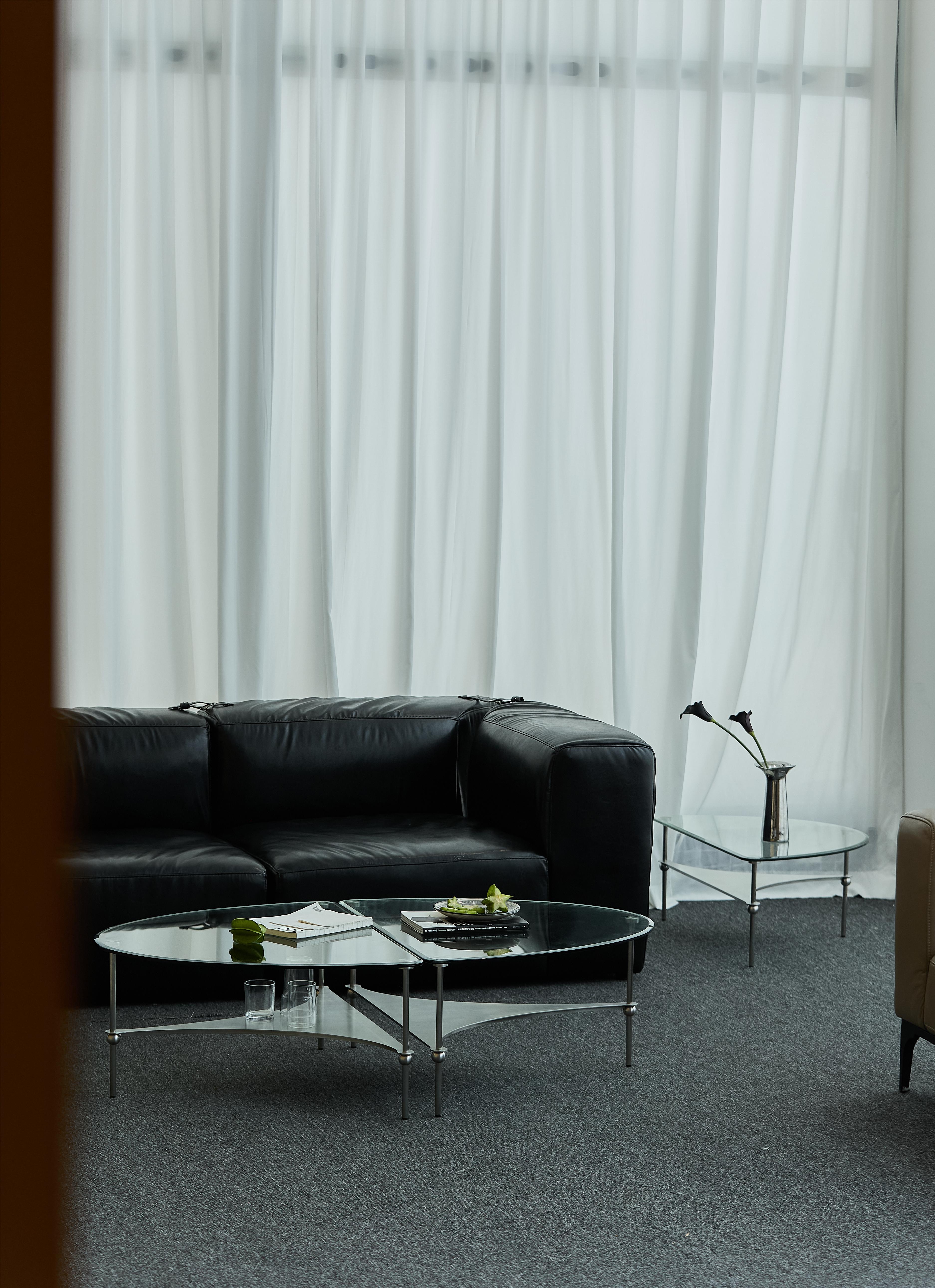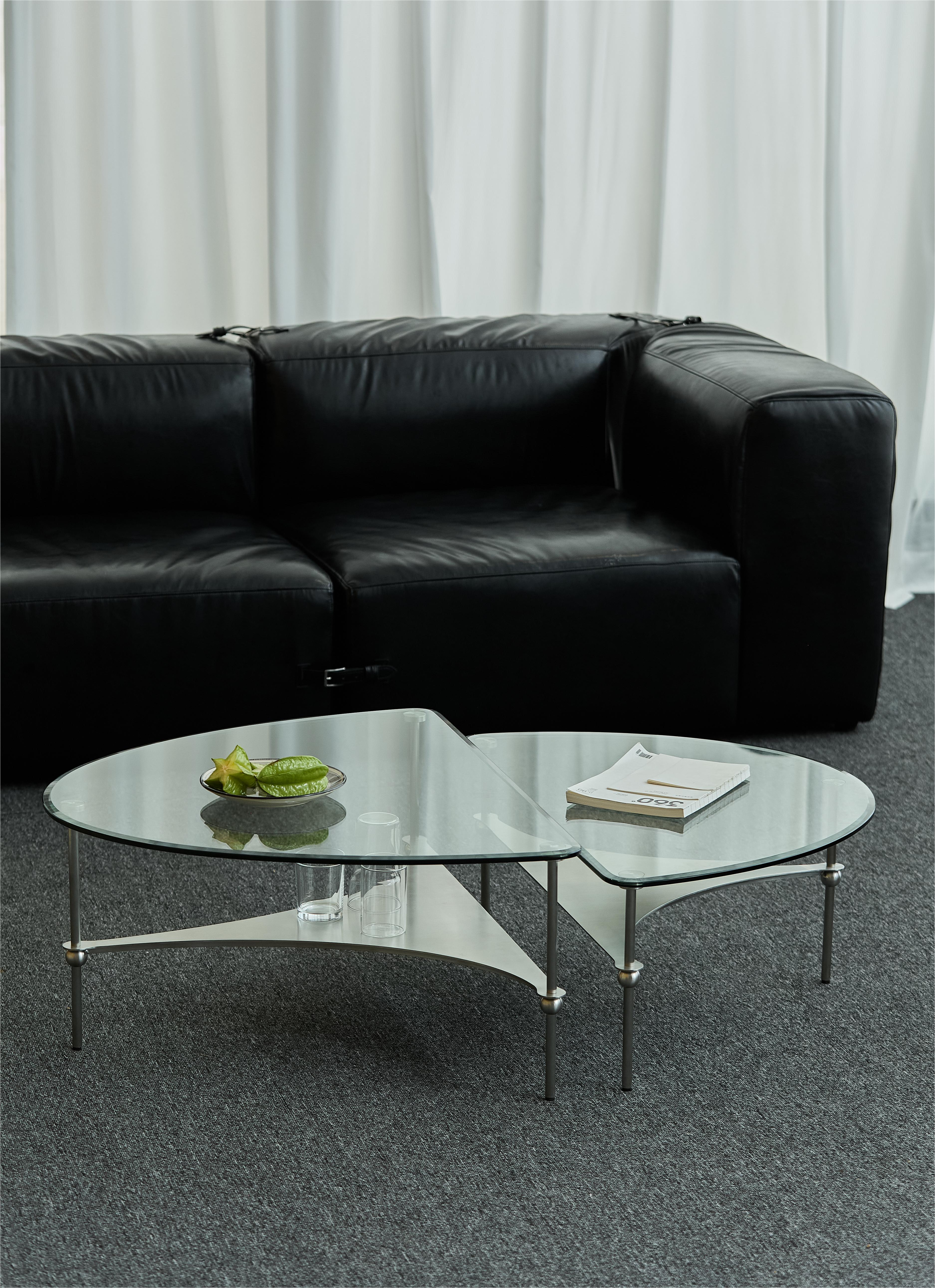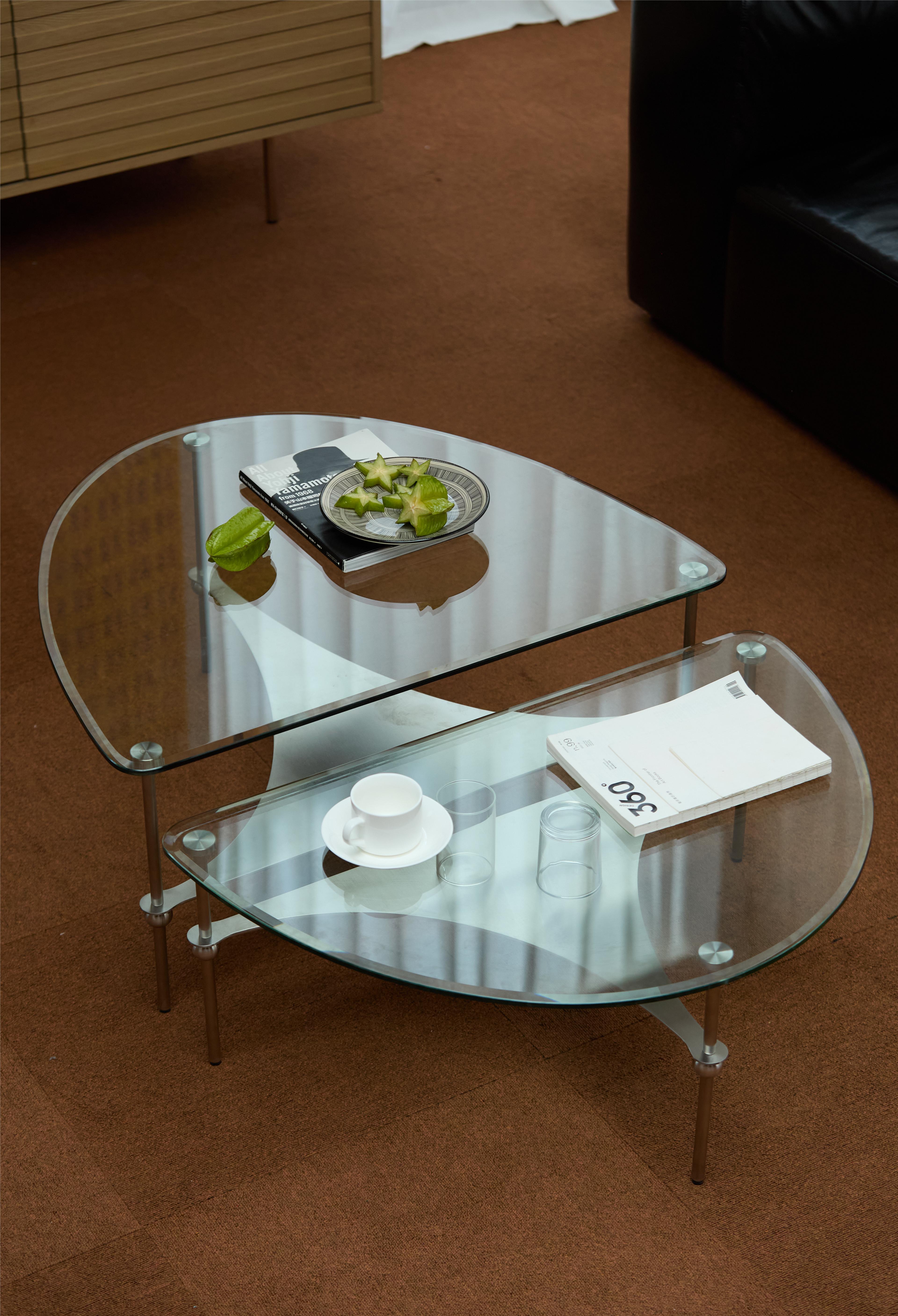 Beyond its flexible configuration, the table also delivers a distinctive aesthetic language. Breaking free from conventional circular or rectangular shapes, the tabletop adopts an asymmetric, droplet-like form that adds playfulness and artistic appeal to the home environment. The lower storage layer takes the shape of stars radiating outward to create a sense of dynamism while visually softening the table’s edges. A highly transparent glass top is paired with a brushed stainless steel storage layer to lighten the visual weight and achieve a harmonious balance between lightness and stability. The dual-layer structure prioritizes both aesthetic form and function, providing ample space to store or display magazines, teaware, and other daily items—maximizing spatial efficiency while contributing to a clean, organized atmosphere.
