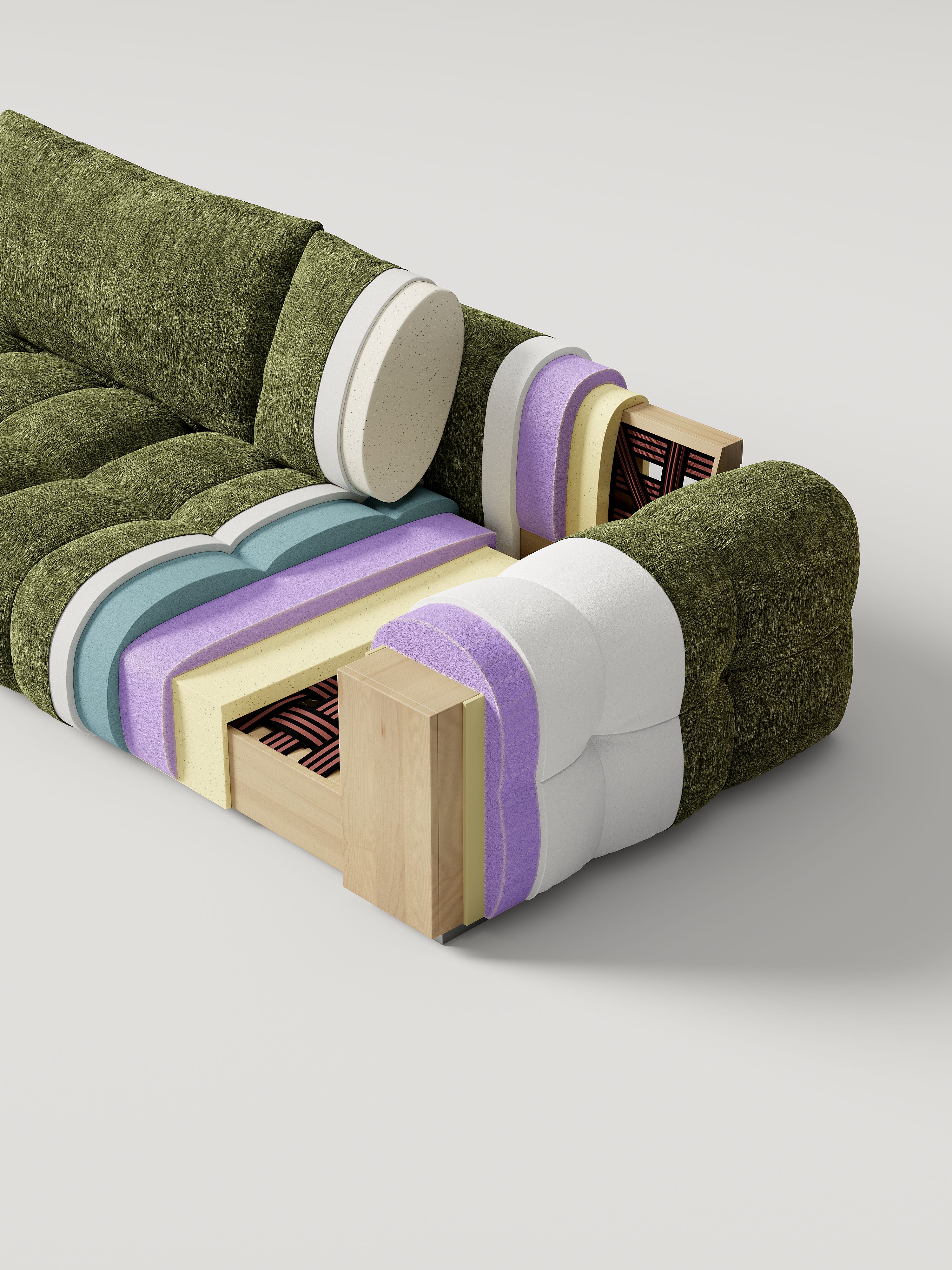 This sofa is inspired by a design philosophy rooted in the aesthetic of leisurely living. It achieves a harmonious balance between minimalism and expressive vitality. Its full, rounded silhouette and extra-deep seating create an inviting presence, offering both visual elegance and physical comfort.