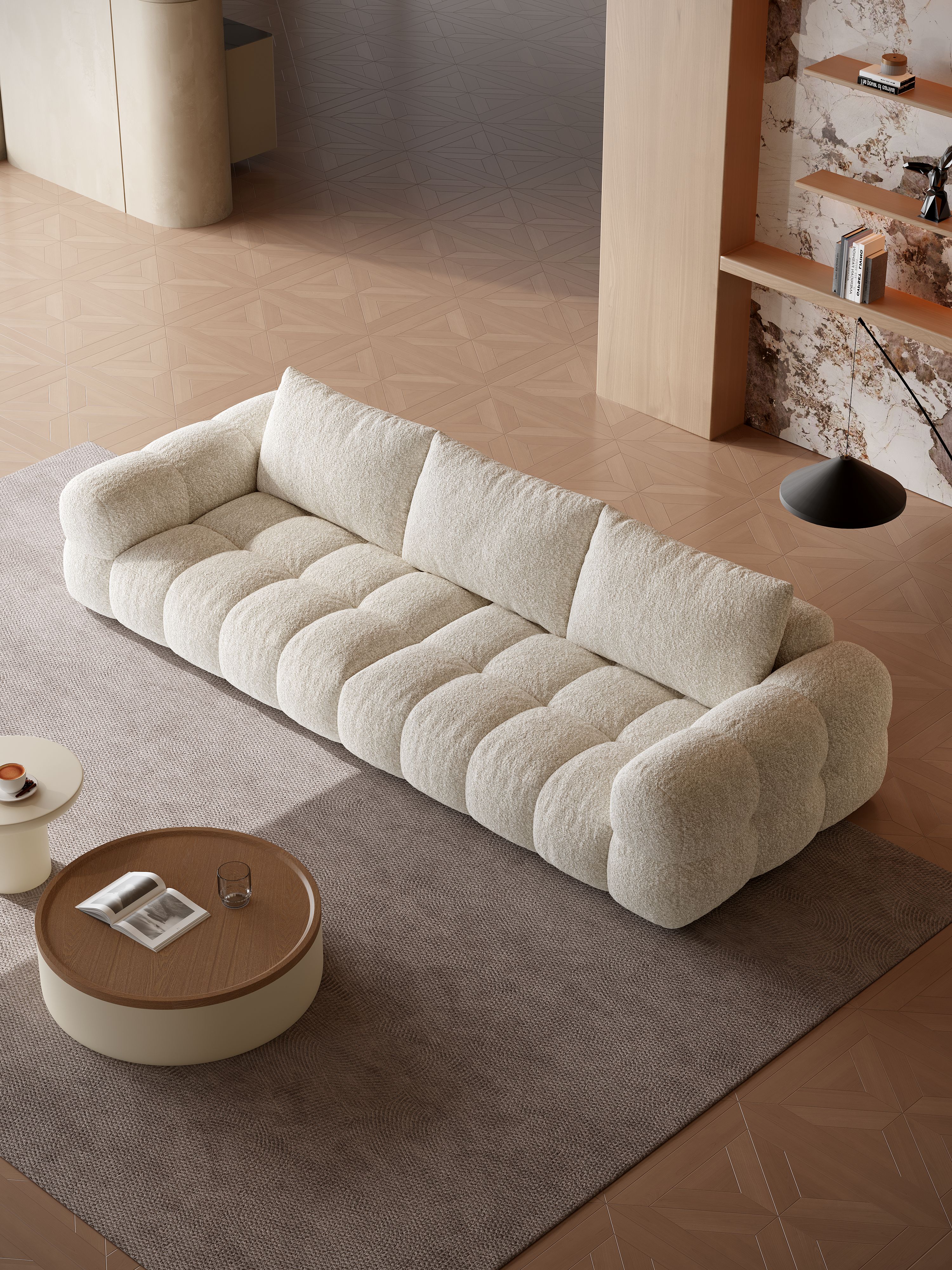 Equally important is the careful selection of materials and craftsmanship. The frame is constructed from premium Russian pine wood, carefully chosen for its strength, stability, and durability. This ensures not only structural integrity but also a quiet, solid base for restful relaxation. The surface fabric features high-quality Chenille Velvet, which performs as beautifully as it looks. Inspired by the self-cleaning and water-repellent properties of lotus leaves, the fabric excels in stain resistance, enhanced by 5A-level long-lasting antibacterial protection and superior breathability for both comfort and wellness. To elevate the user experience even further, multiple purification processes are applied throughout manufacturing, effectively removing formaldehyde and microbial residues. From core to cover, the sofa is designed to create a clean, healthy environment—an essential response to the growing emphasis on health-conscious living.