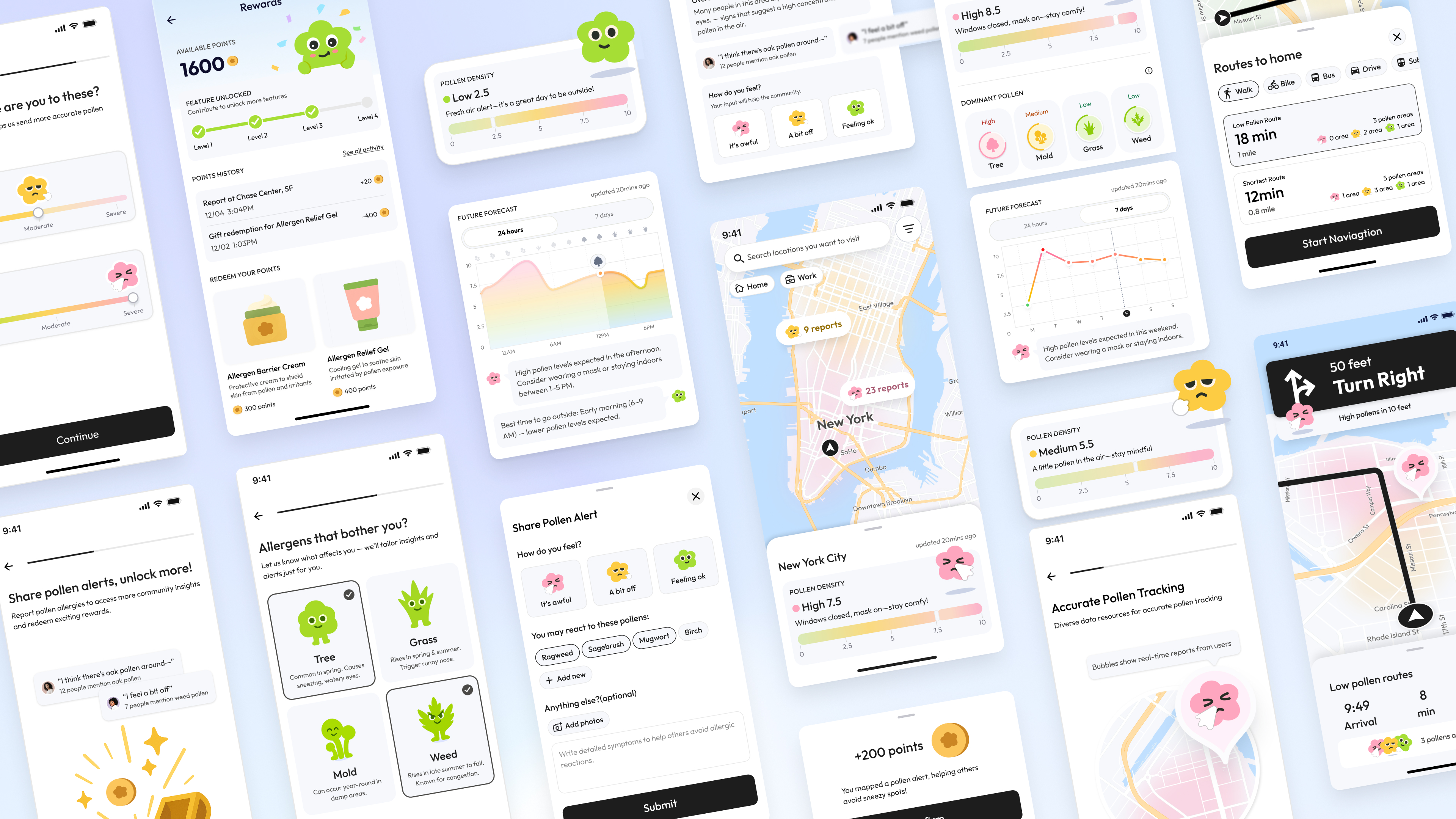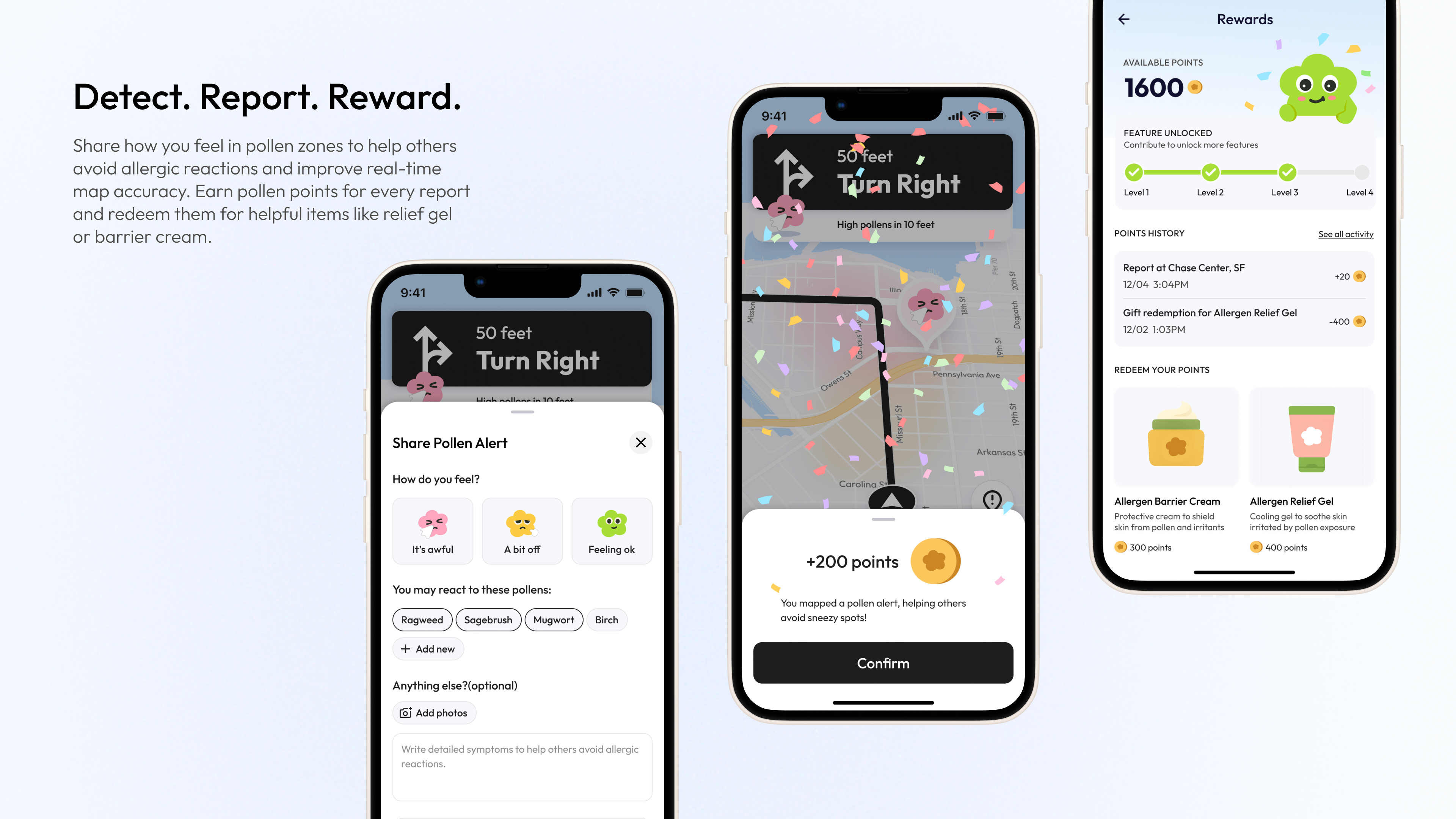 Reward System: Users earn pollen points for reporting alerts. These points can be redeemed for practical items like protective creams or relief gel, and can also be used to unlock more features in the app.