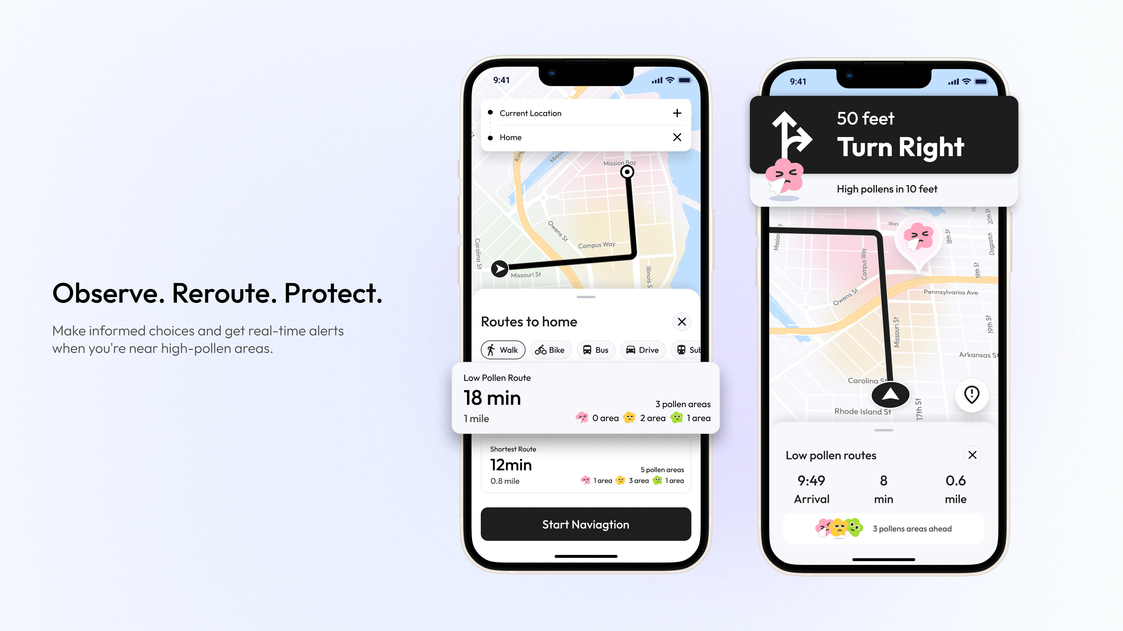 PollenNav is a navigation app designed for individuals with pollen allergies. It empowers them to move freely in urban environments while minimizing allergen exposure. By providing real-time pollen data, optimized low-pollen routes, and community-driven insights tailored to users’ specific allergy types and sensitivities, PollenNav helps people make safer, informed travel decisions and manage their health more effectively.