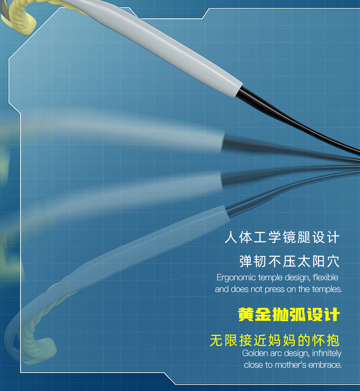 The temple ear hooks feature a split-structure design, with soft silicone used near the ear for comfort, and a spiral shape forming a channeled sweat-wicking groove to improve shock absorption and localized breathability. Similarly, the inner side of the nose pads includes micro-textured drainage grooves, enabling scientific sweat and moisture management across the frame, better meeting the demands of children’s daily activities.