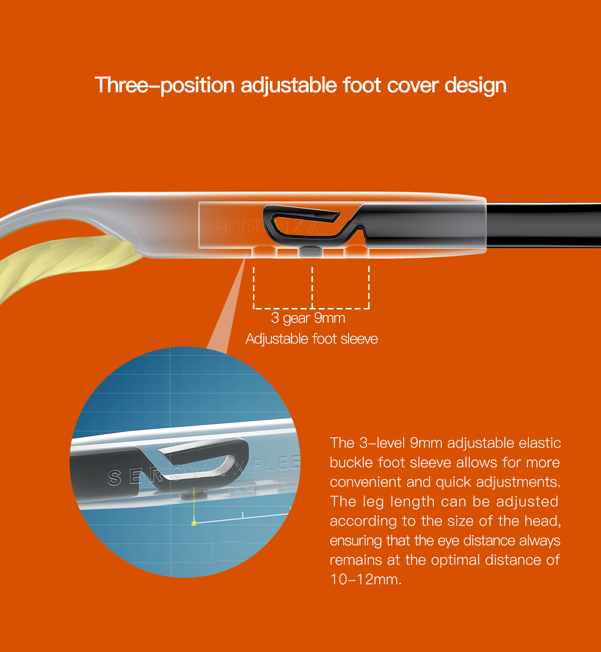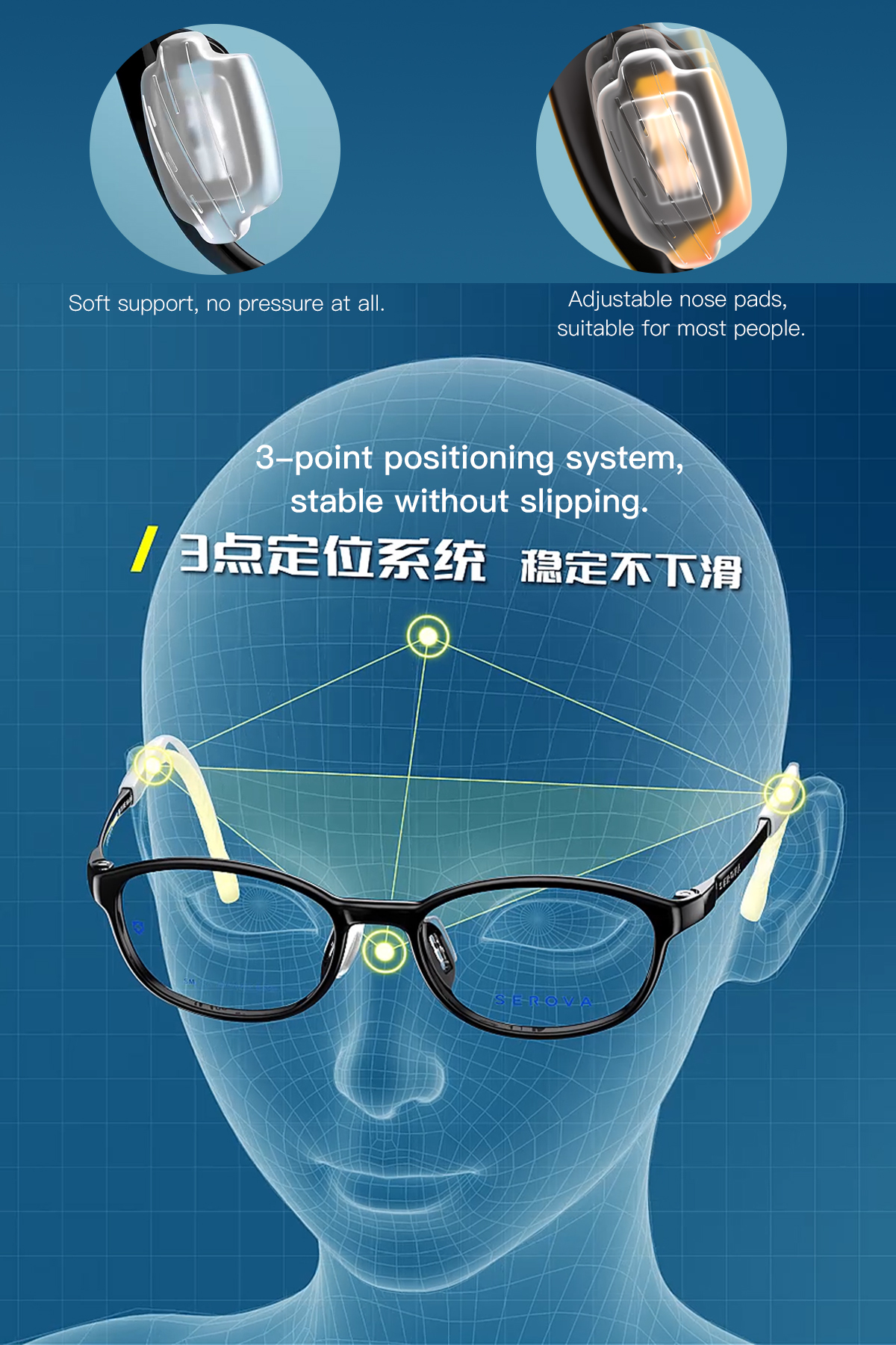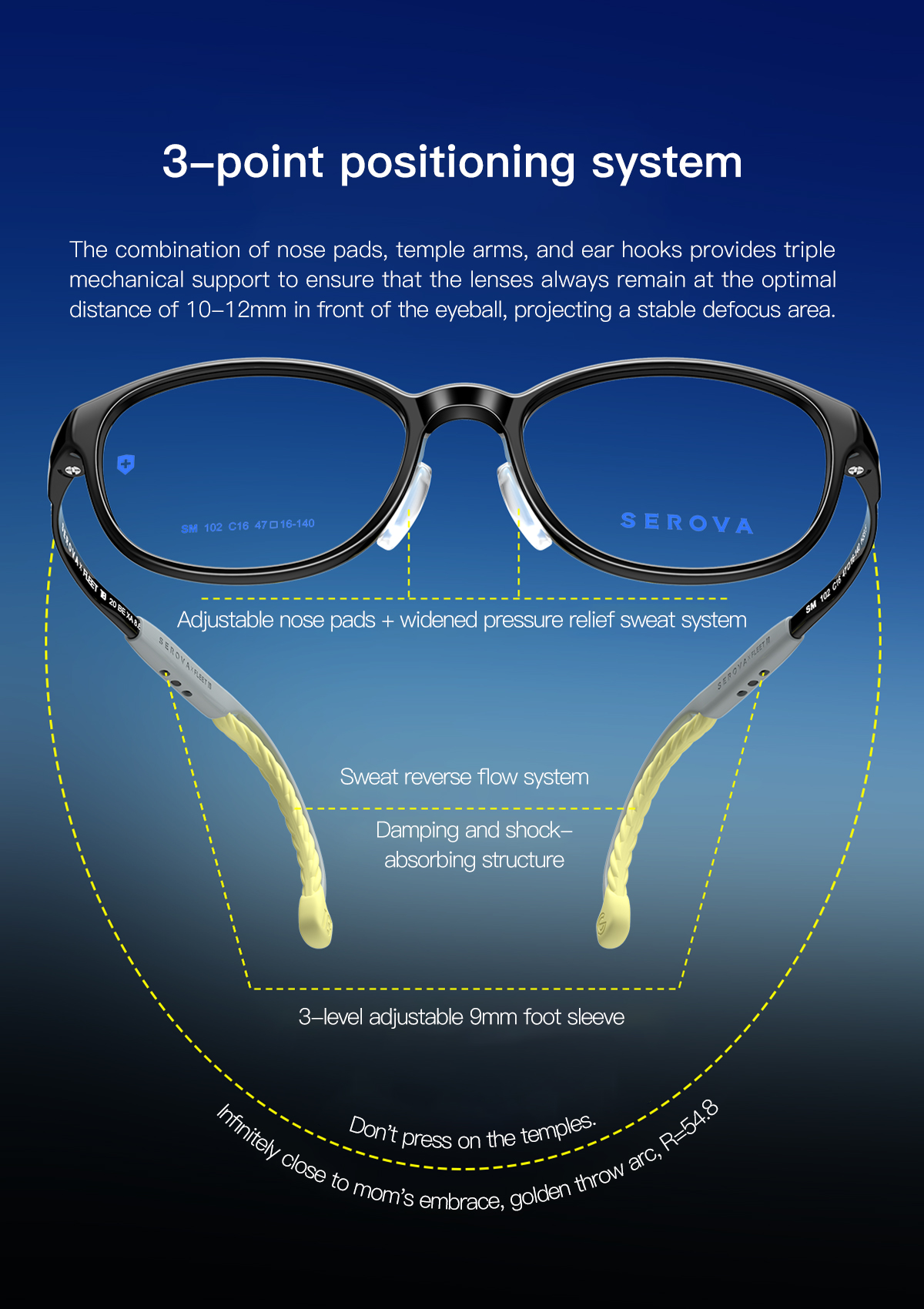 SEROVA introduces the pioneering concept of a triple mechanical support system in frame design, encompassing the nose pads, temples, and ear hooks, to maintain the lens at an optimal distance of 10 to 12 millimeters directly in front of the eyeball, ensuring stable defocus zone projection. Additionally, the temple-to-sleeve connection features a three-level, 9-mm adjustable elastic clasp, allowing children to customize the fit based on head shape to maintain a consistent eye-lens distance. The nose pads support a 4-mm vertical micro-adjustment to keep the pupil aligned with the lens’s optical center.