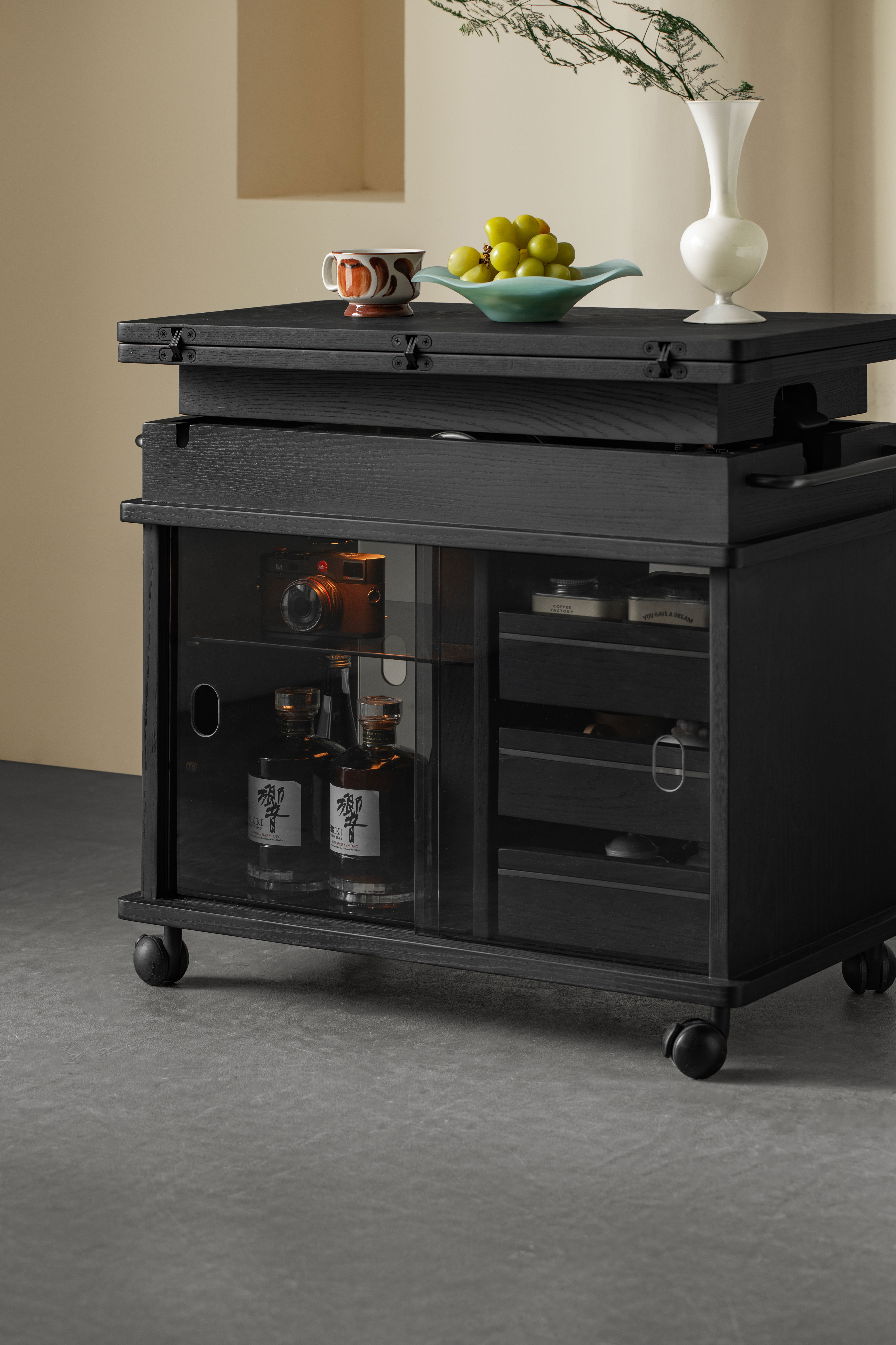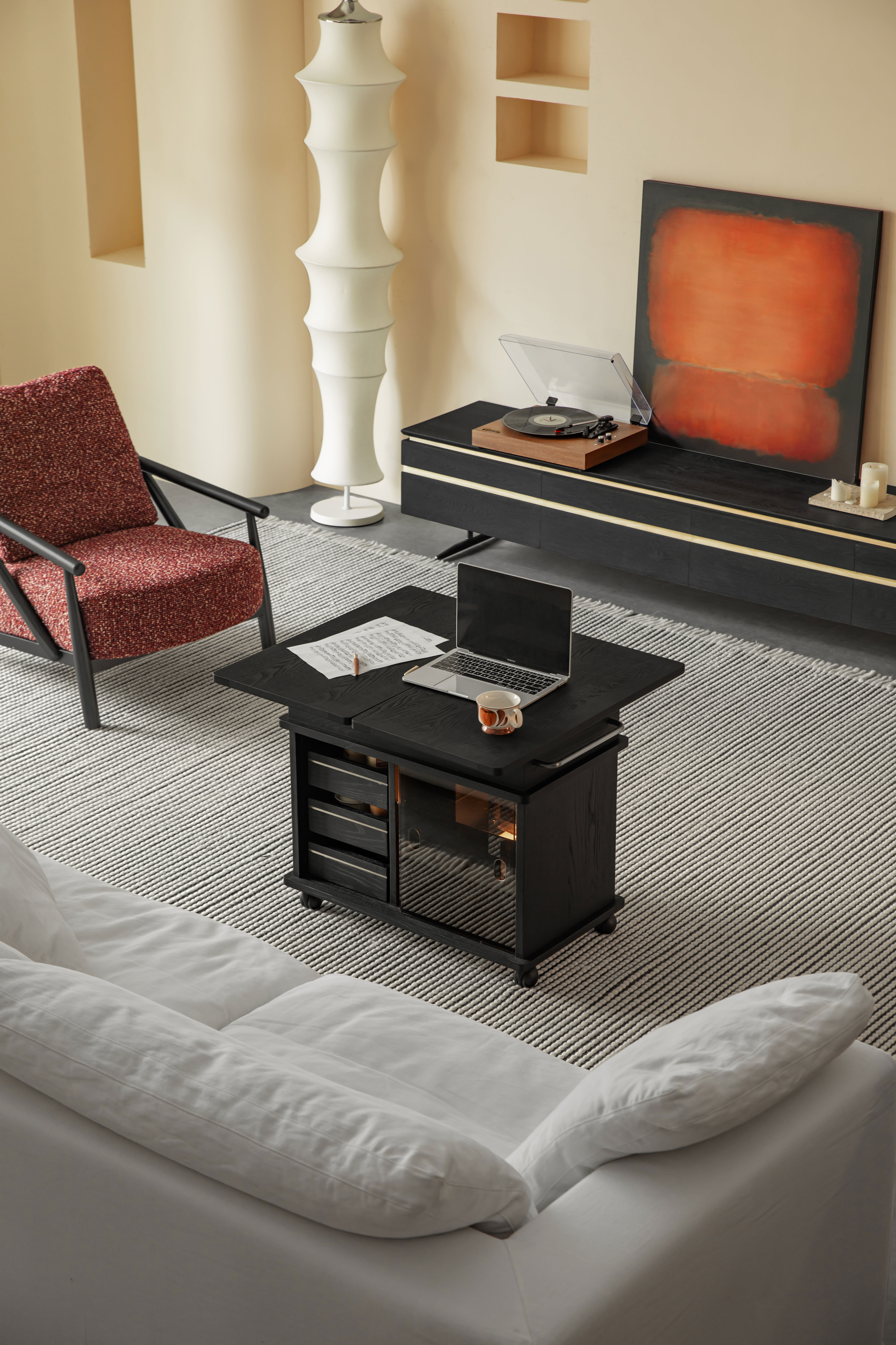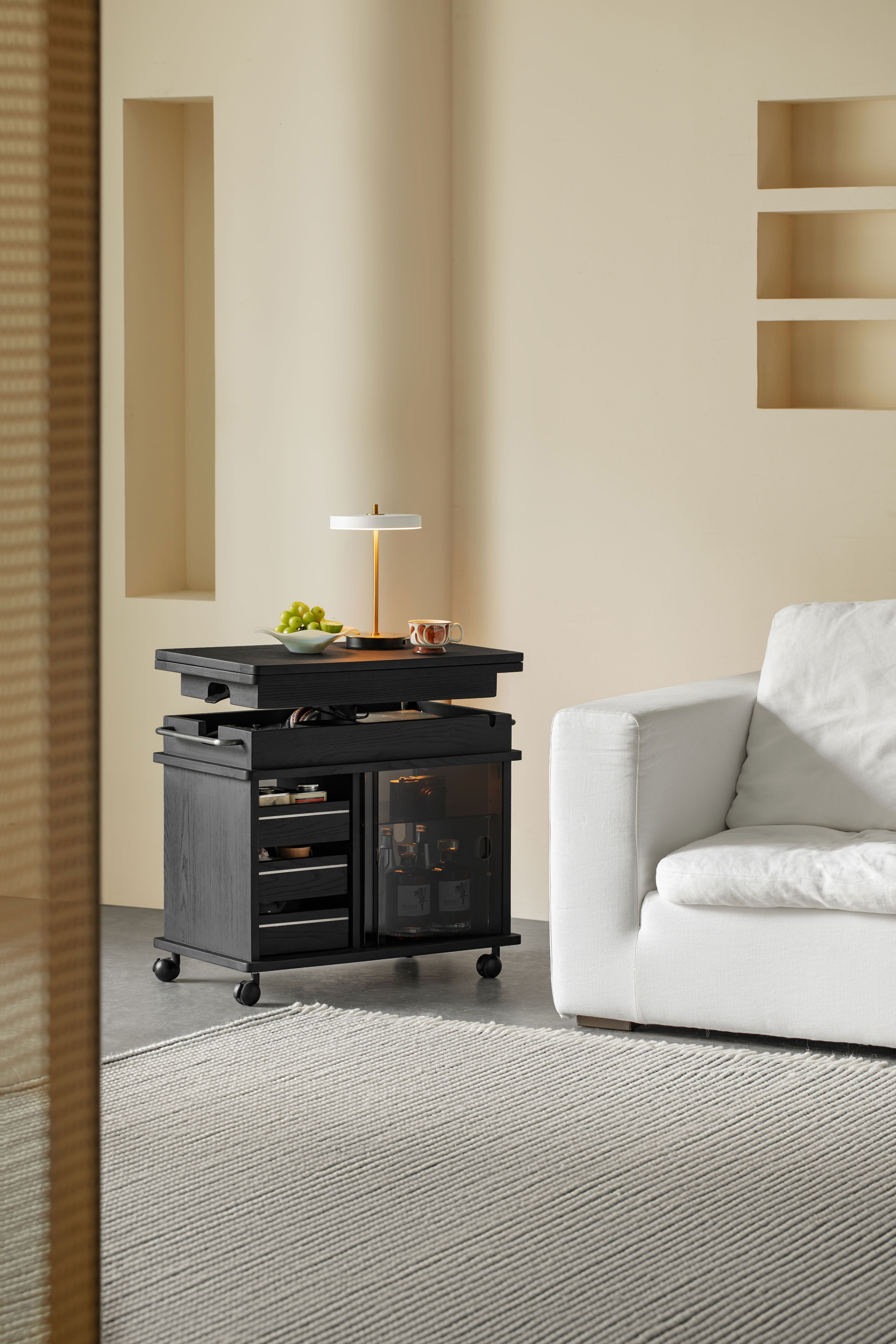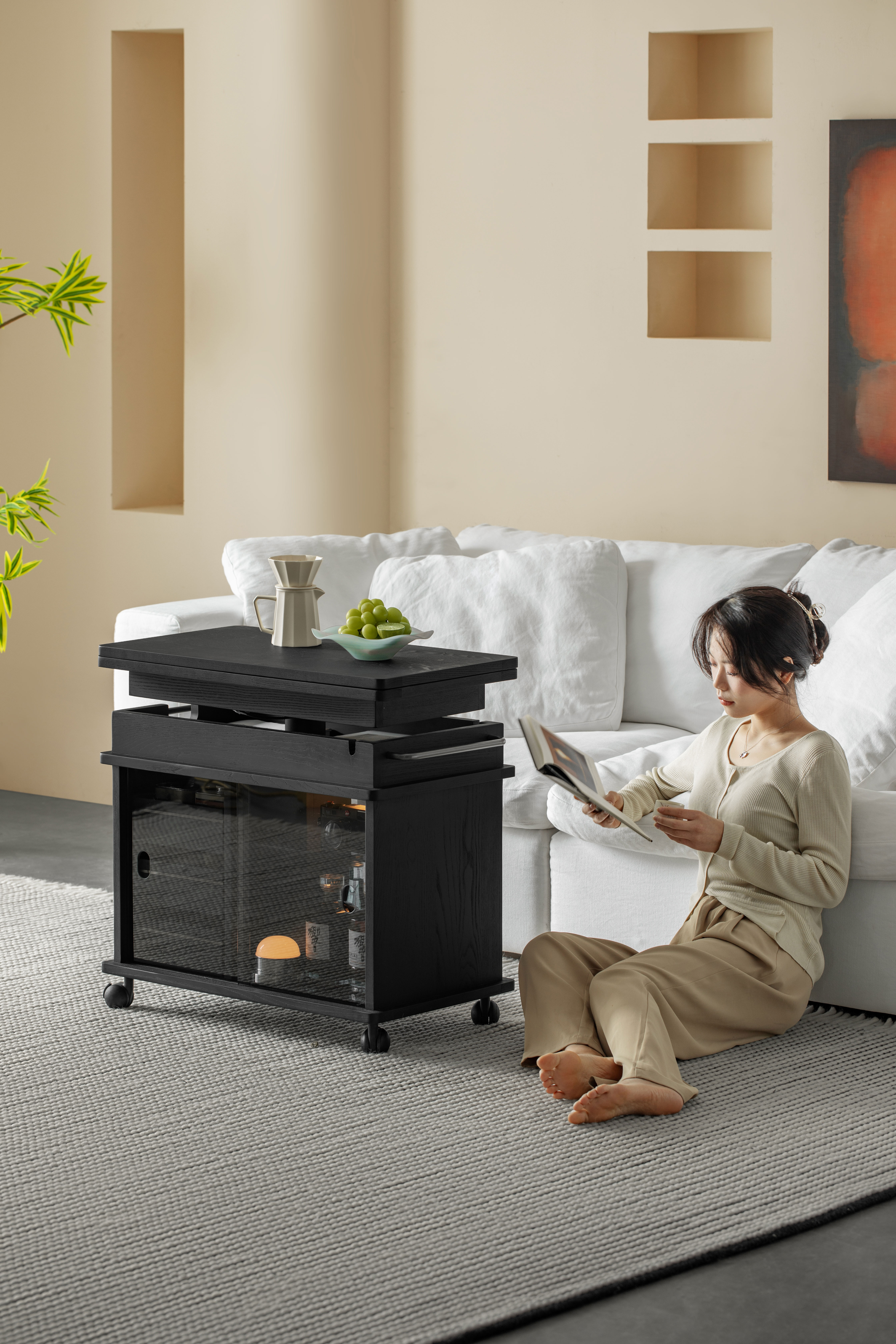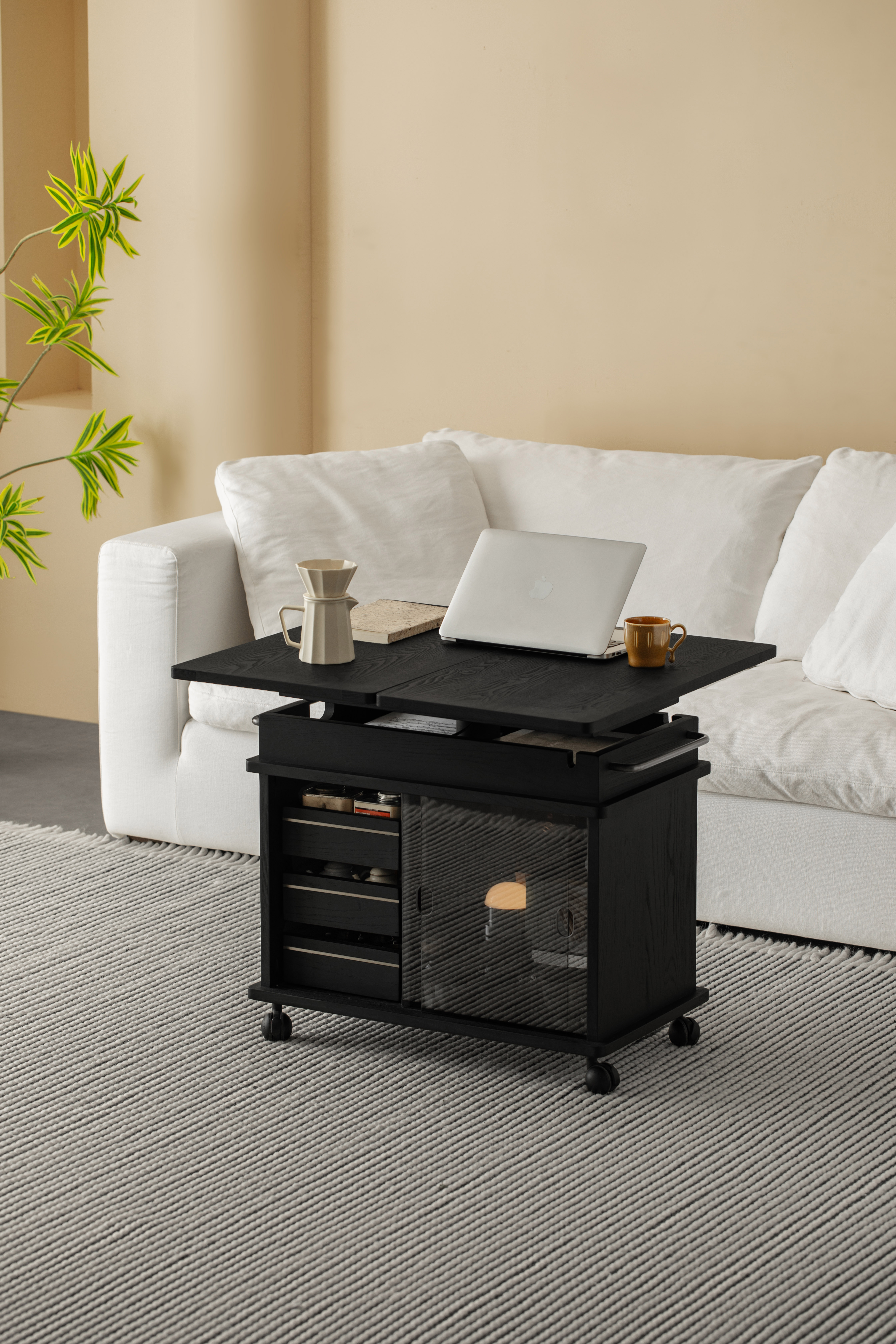 This innovative coffee table redefines flexibility in modern living. A precision lift system transforms it effortlessly into a work desk or tea station. Foldable panels adapt to space needs, while lockable wheels ensure easy mobility. Crafted from carbonized ash wood and grey glass with gunmetal steel accents, it balances natural texture and industrial aesthetics. Inside, modular drawers and adjustable shelving support multifunctional storage. Hidden compartments and sliding doors enhance utility while preserving minimalist form.