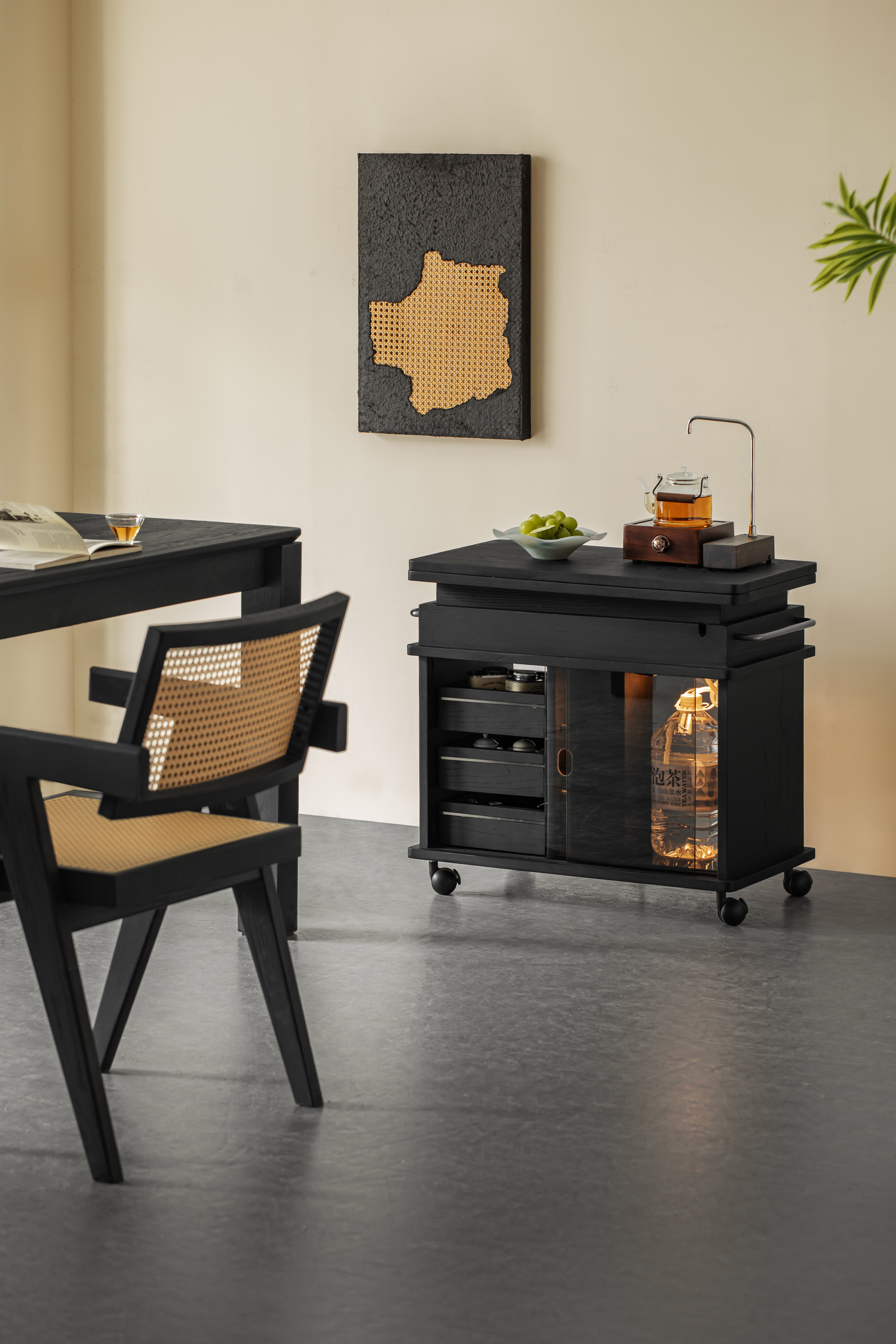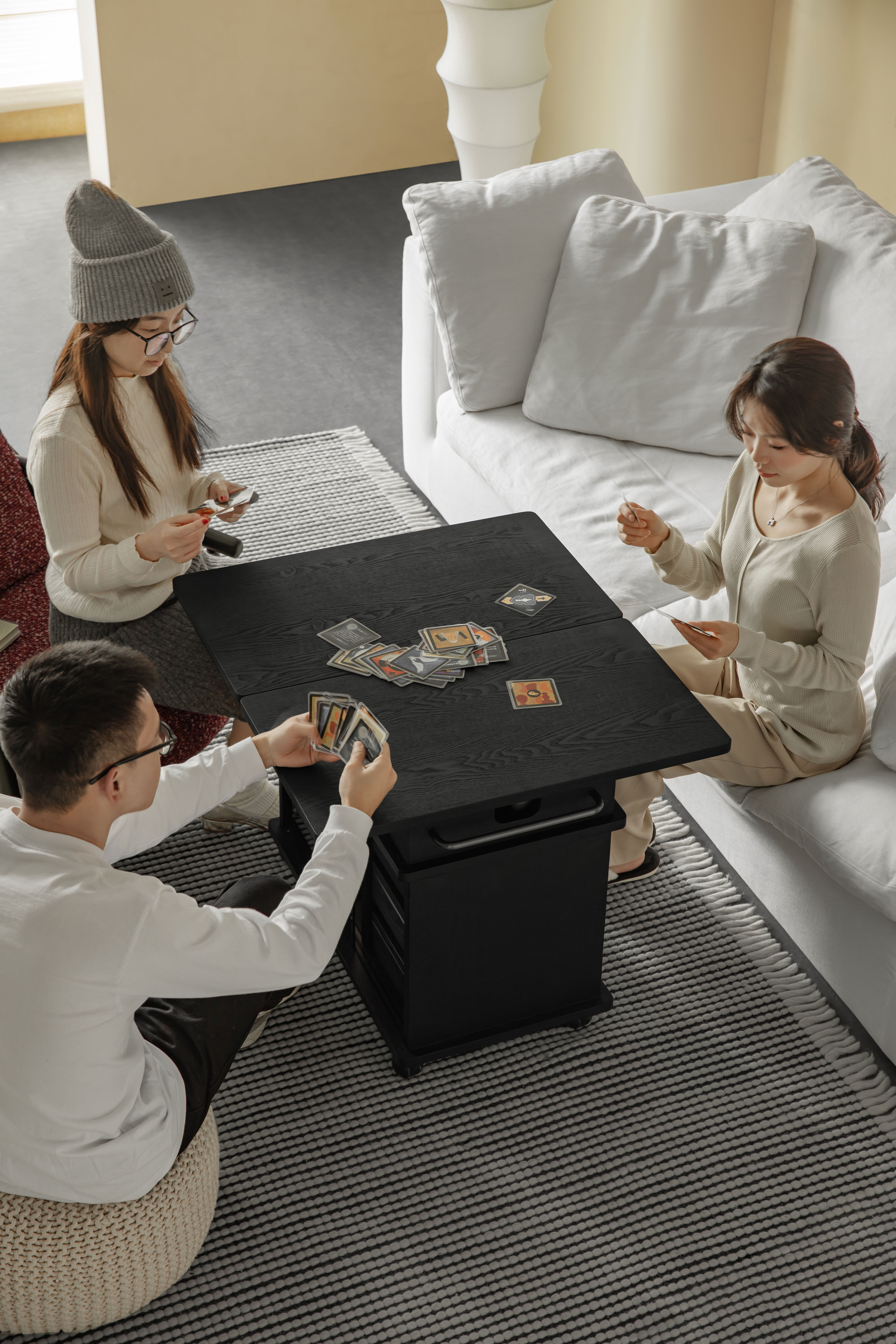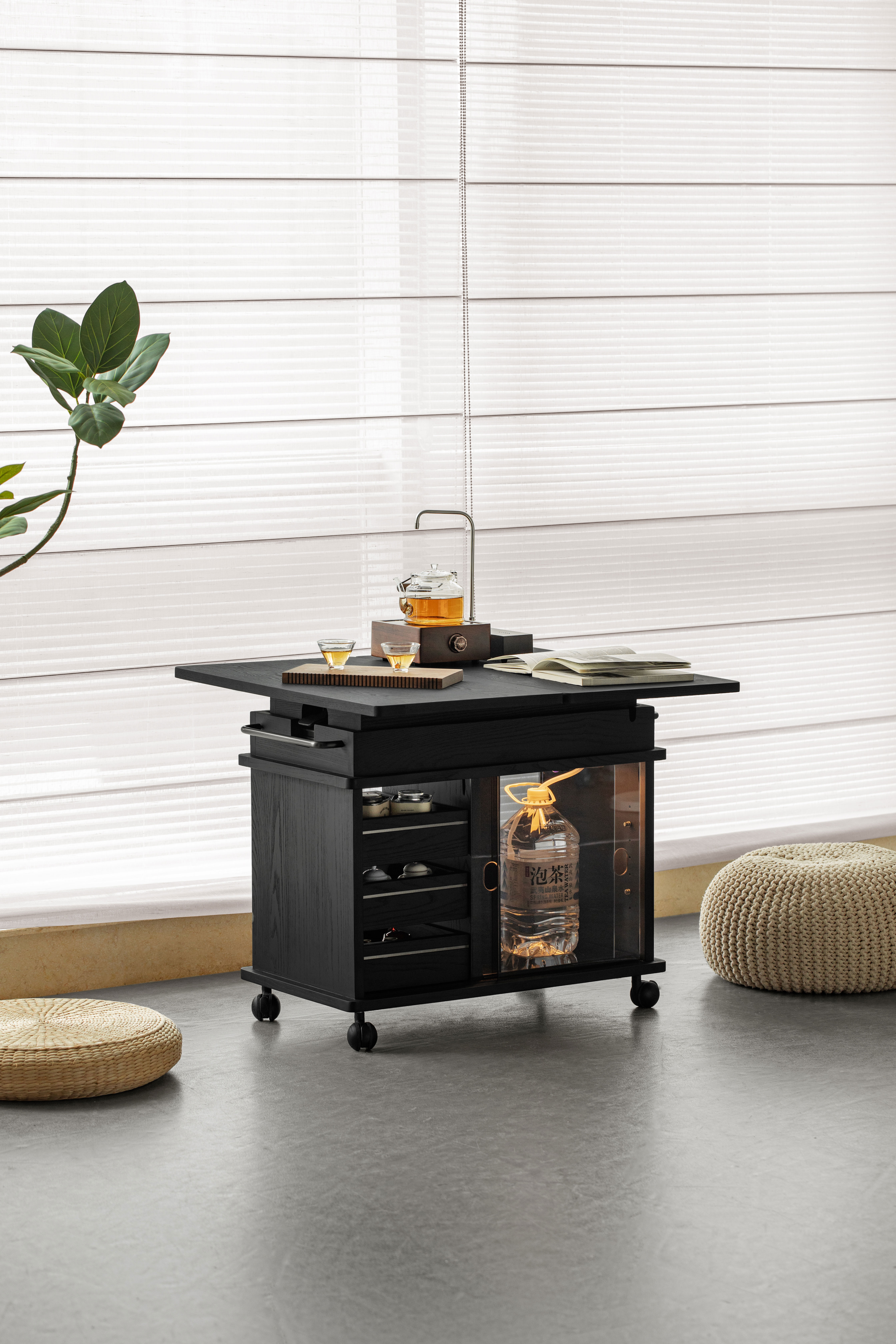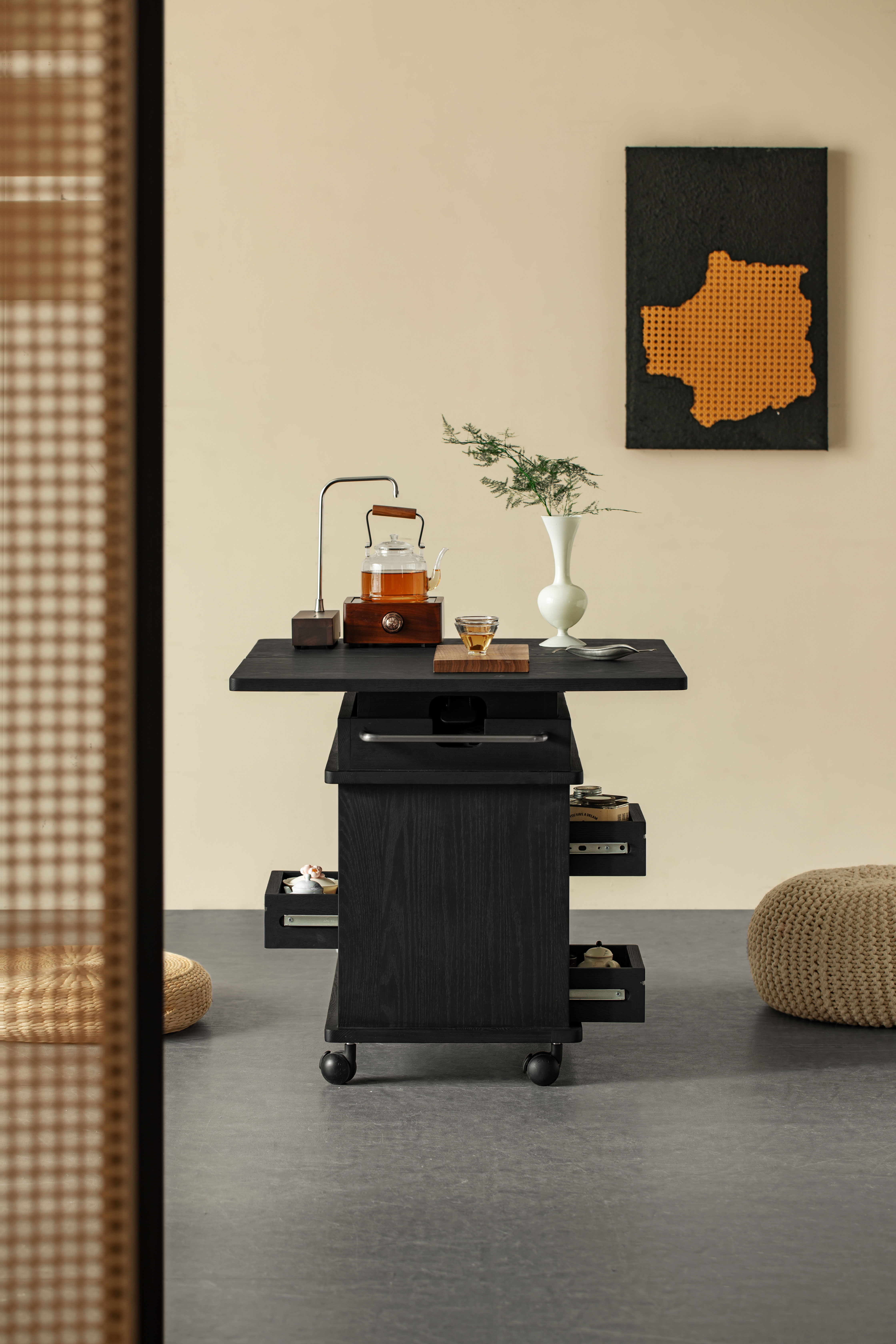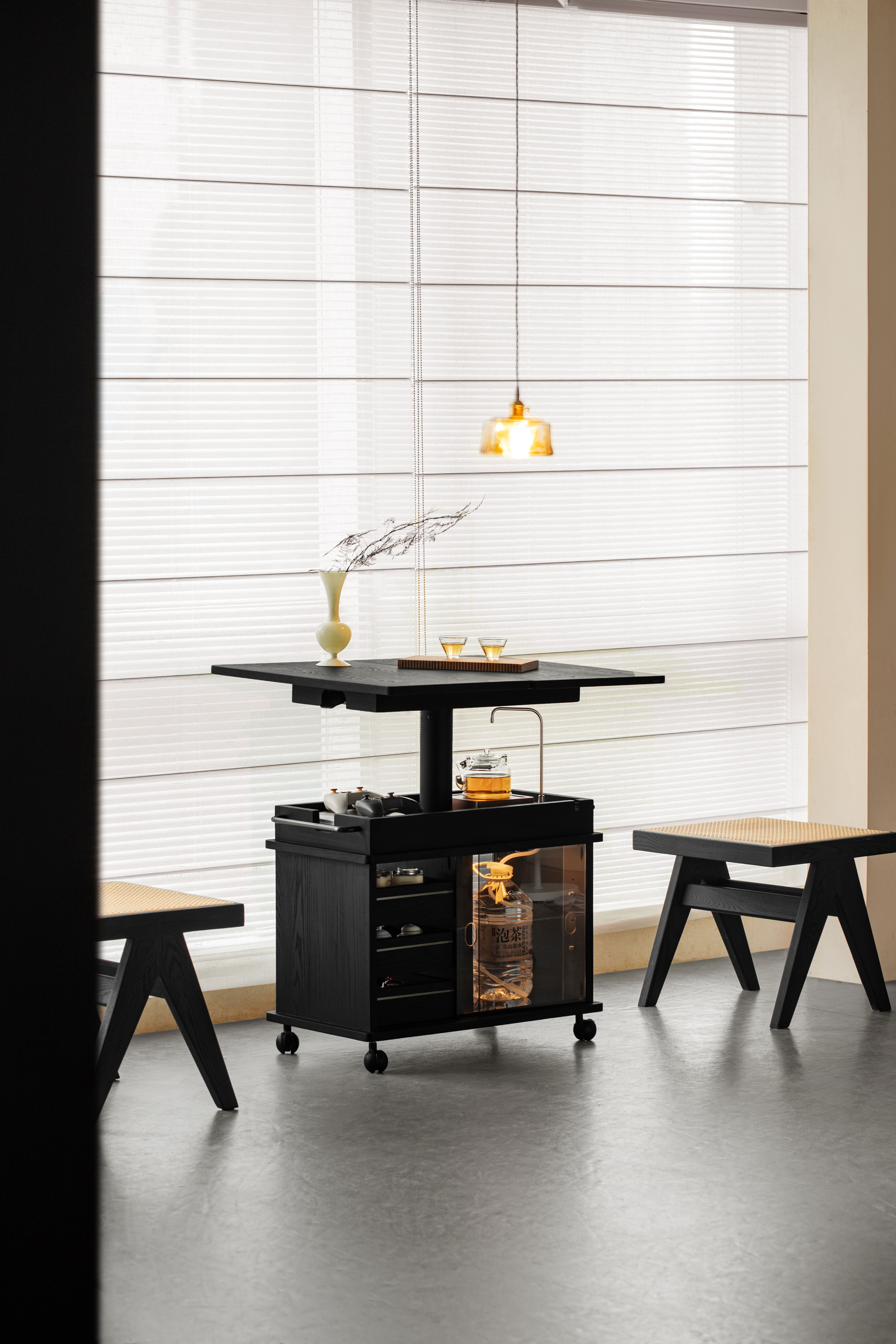 This innovative coffee table redefines flexibility in modern living. A precision lift system transforms it effortlessly into a work desk or tea station. Foldable panels adapt to space needs, while lockable wheels ensure easy mobility. Crafted from carbonized ash wood and grey glass with gunmetal steel accents, it balances natural texture and industrial aesthetics. Inside, modular drawers and adjustable shelving support multifunctional storage. Hidden compartments and sliding doors enhance utility while preserving minimalist form.