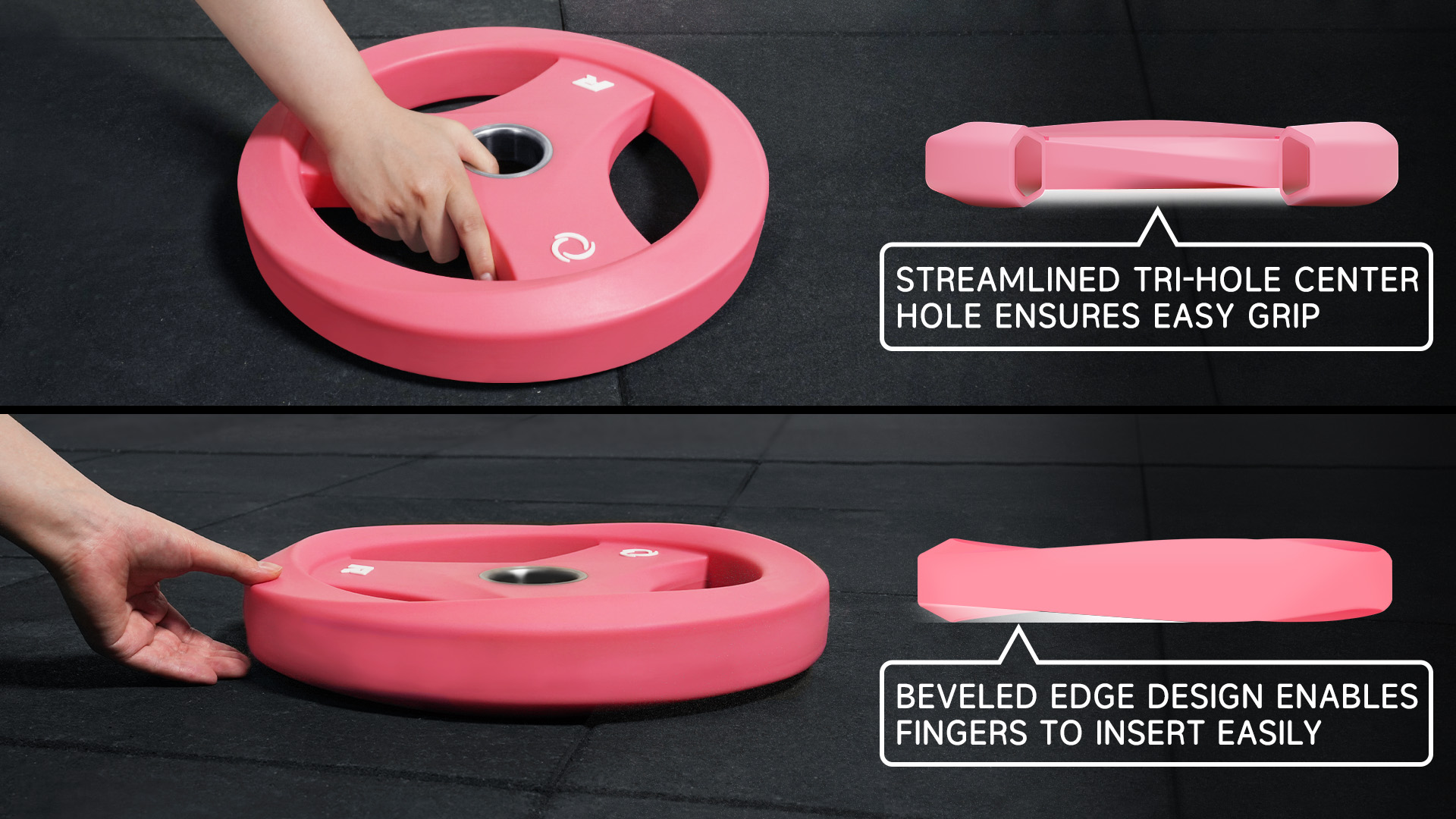 From a functional innovation perspective, the form is seamlessly integrated with utility. The twisted surface structure of the plate naturally elevates it by 7–10mm, allowing for easy grip access. The beveled edge design enables users with manicured nails to insert their fingers effortlessly for easy lifting. The ergonomic curve connecting the 4 grip holes fits the natural shape of the hand and enable a stable hold from the center. And the weight distribution has been designed to maintain a centered balance during movement, which helps reduce the risk of wrist strain.This all-dimensional easy-grip and balanced design unlocks a variety of dynamic exercise—such as kettlebell and dumbbell movements that are typically difficult with conventional plates.