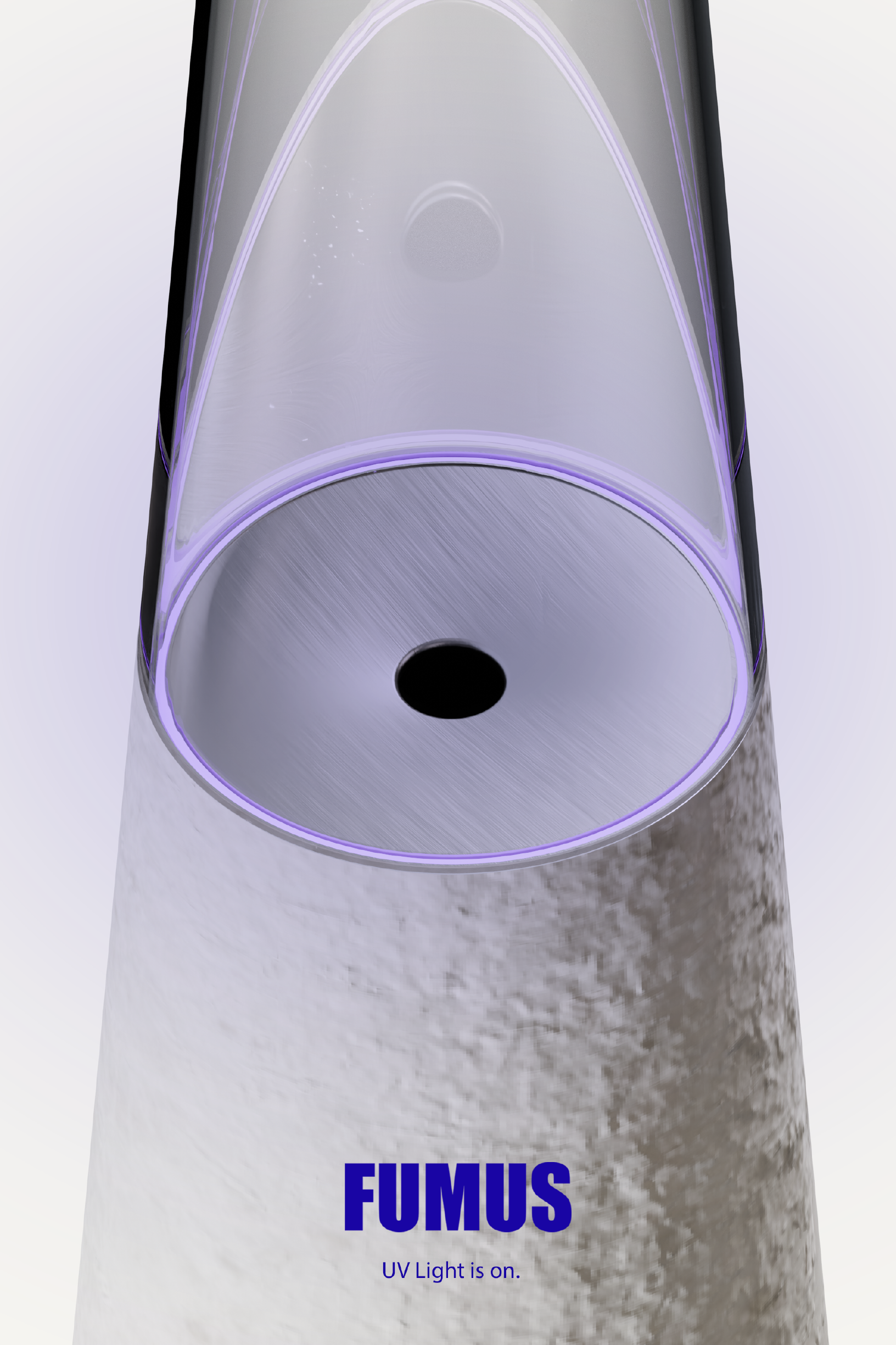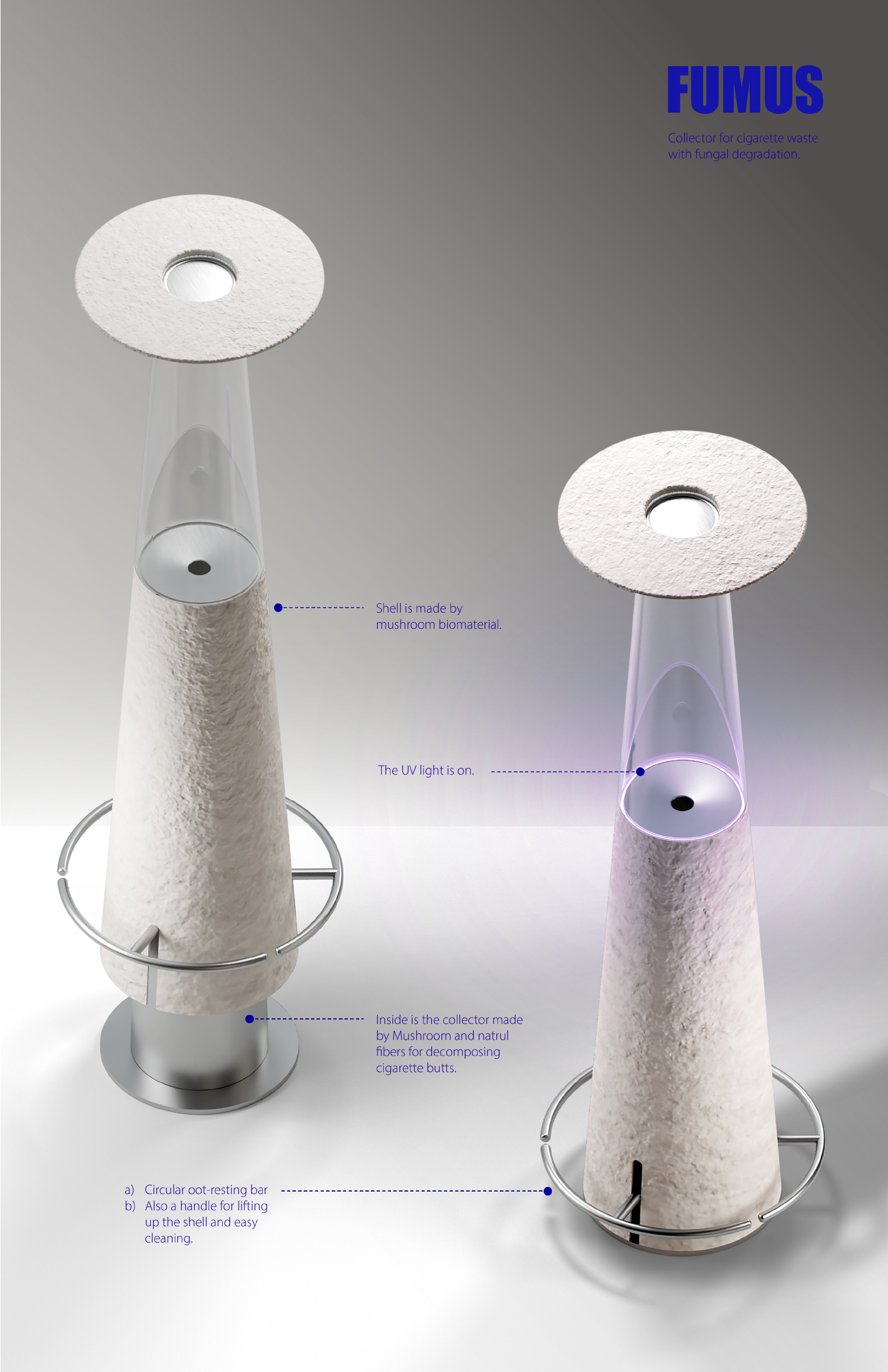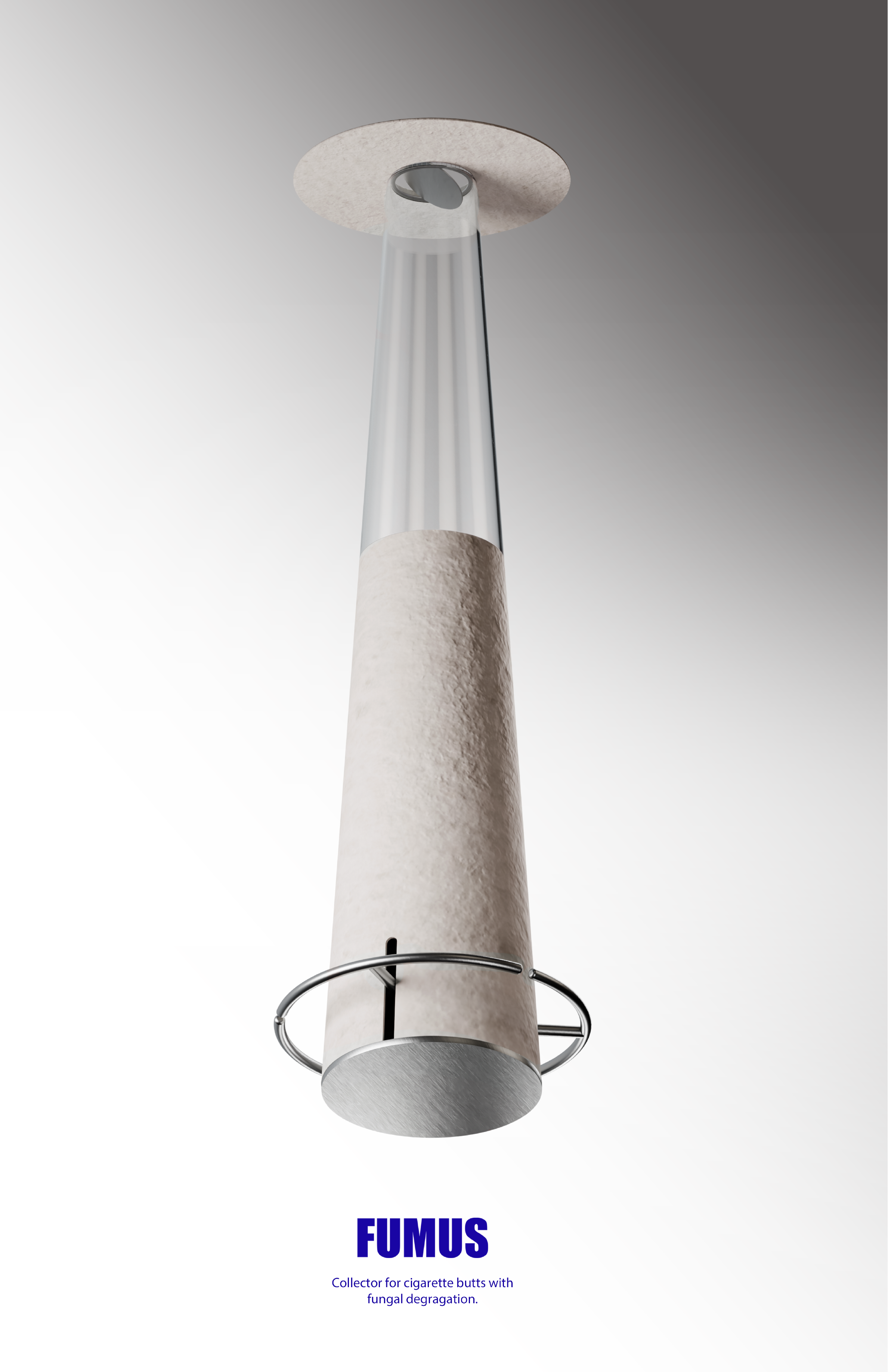Standing 91 cm tall, the FUMUS collector is built from renewable biomaterials: a durable shell cultivated from mushrooms. Users put their cigarette butts into the central opening—where the glass layer offers UV light and sun light pretreatment. The cigarette butts are then funneled downward into a chamber filled with nutrient-rich soil and mycelium, initiating the decomposition process.