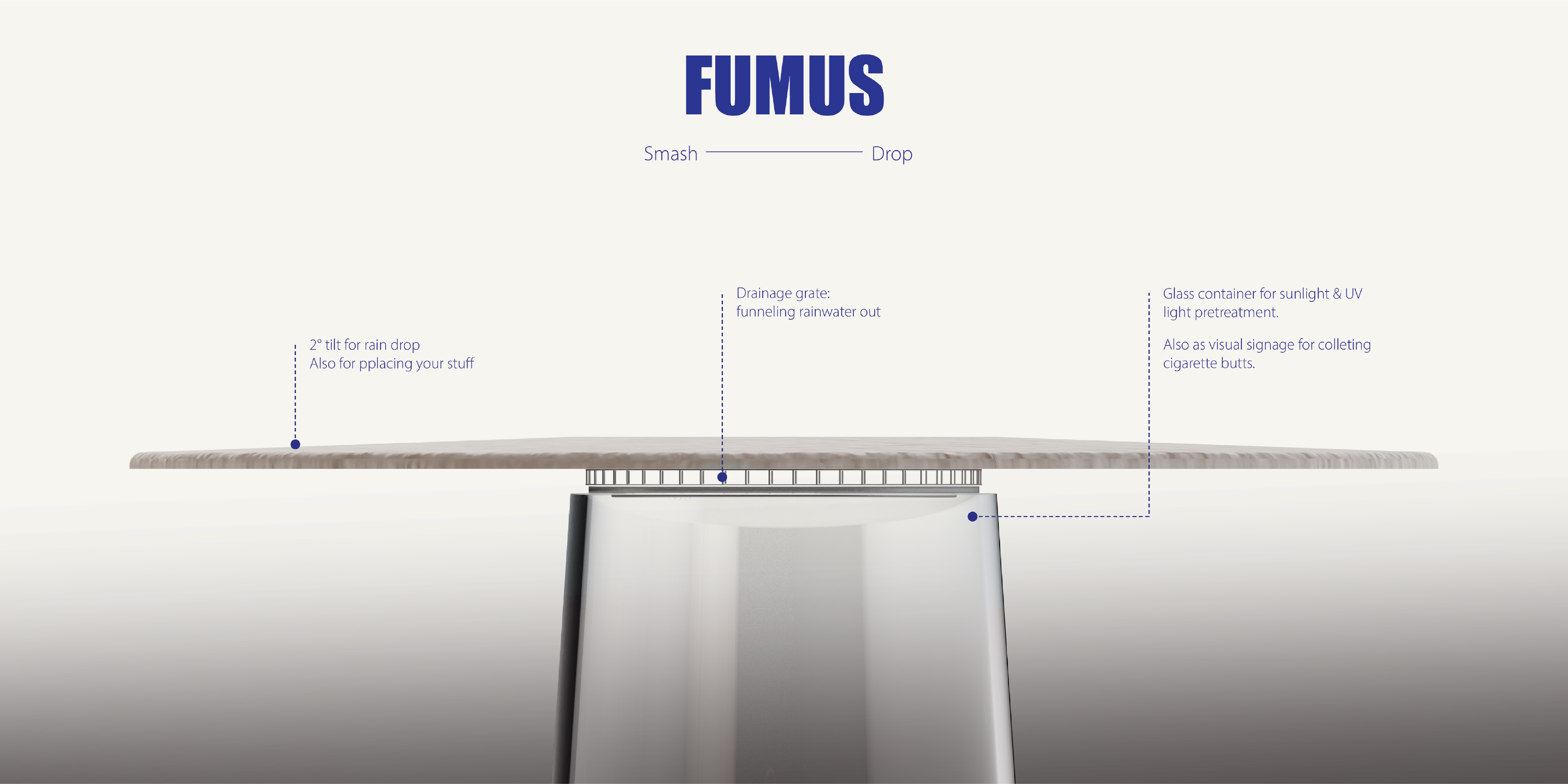 More than functional infrastructure, FUMUS is also a public art piece. The accumulation of cigarettes butts within the transparent section makes the invisible visible—transforming waste into a shared reflection of our collective habits. Its presence in public space serves not only as a solution, but as a symbol of community responsibility, sustainability, and change.