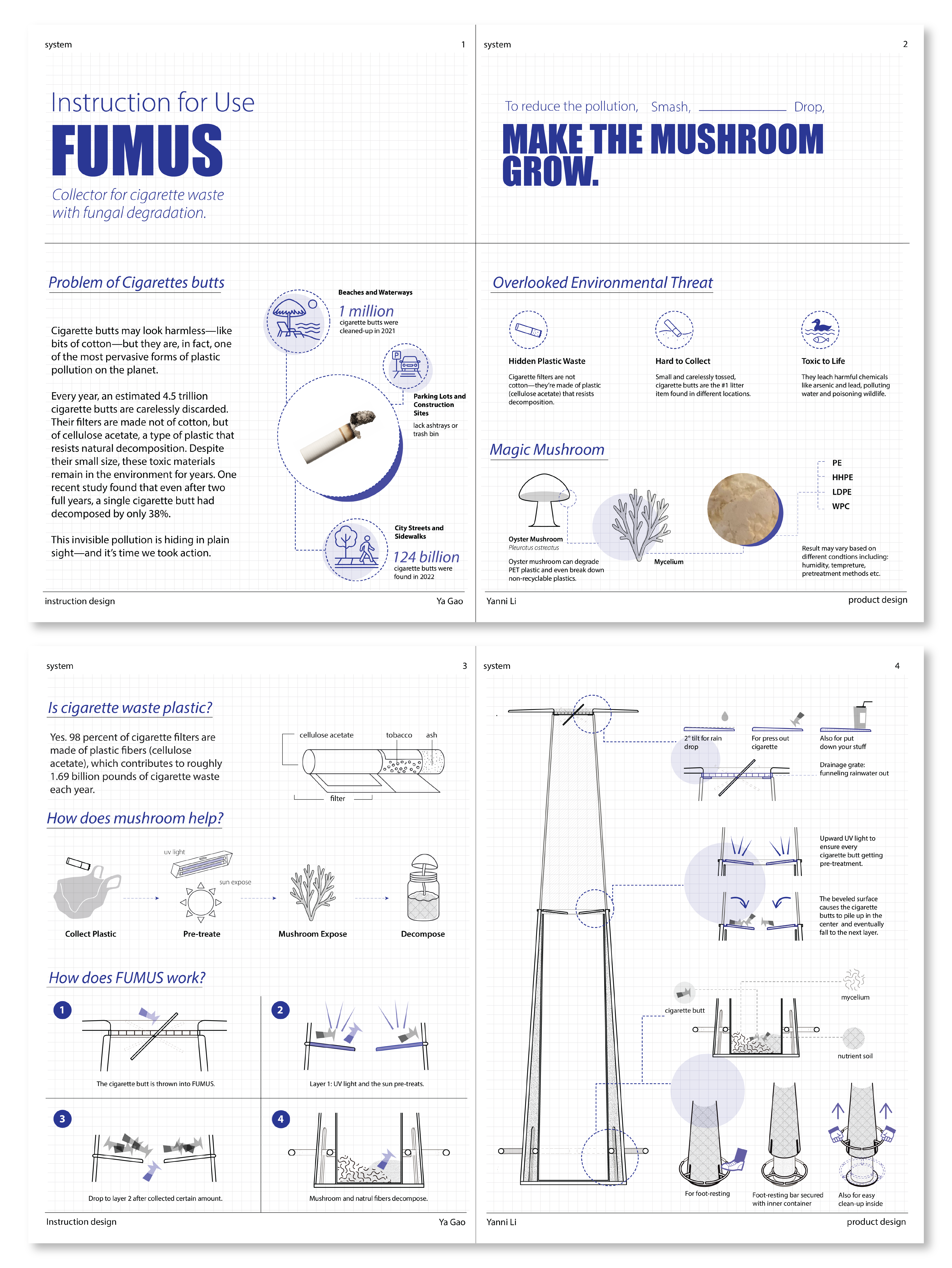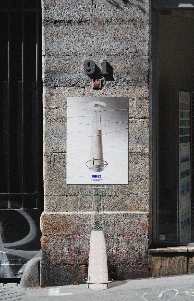 Named after the Latin word for "smoke," FUMUS offers a novel, biomaterial-based solution to one of the world’s most overlooked urban pollutants: the cigarette butt. Though small in size, cigarette butts are, in fact, the most frequently discarded waste item globally. Their filters, made of cellulose acetate—a form of plastic—are often mistaken for organic matter due to their soft appearance. This misconception has led to massive, invisible pollution. Worse still, the casual habit of flicking cigarette butts onto the ground makes collection and separation from general waste extremely difficult.