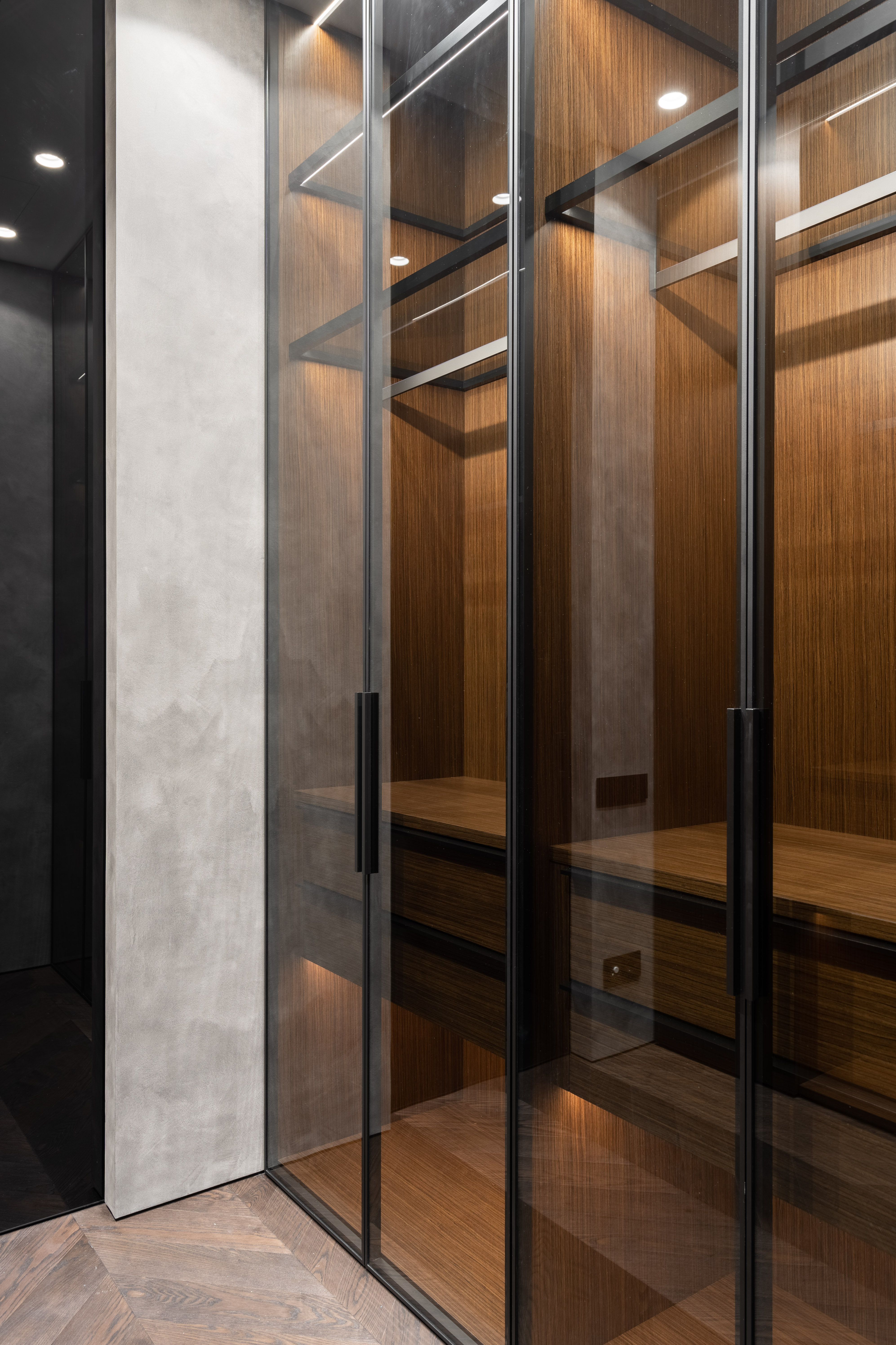 Surrounding this innovation is a composition of natural walnut veneer and matte black aluminum. Integrated architectural lighting adds atmospheric depth, emphasizing the wardrobe’s sculptural quality and inviting interaction.