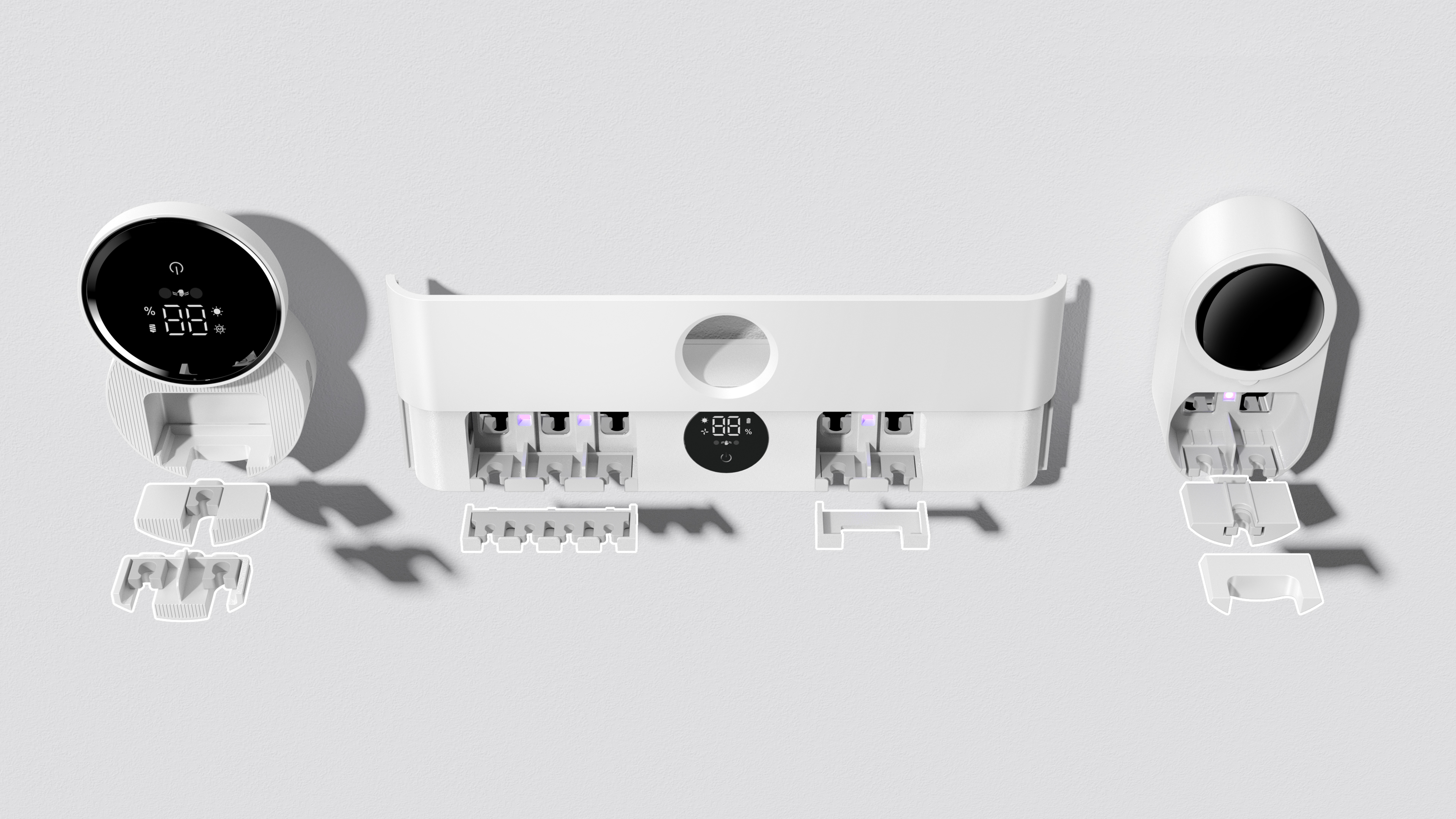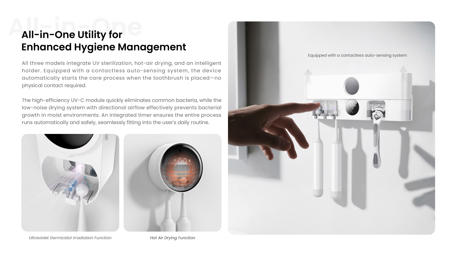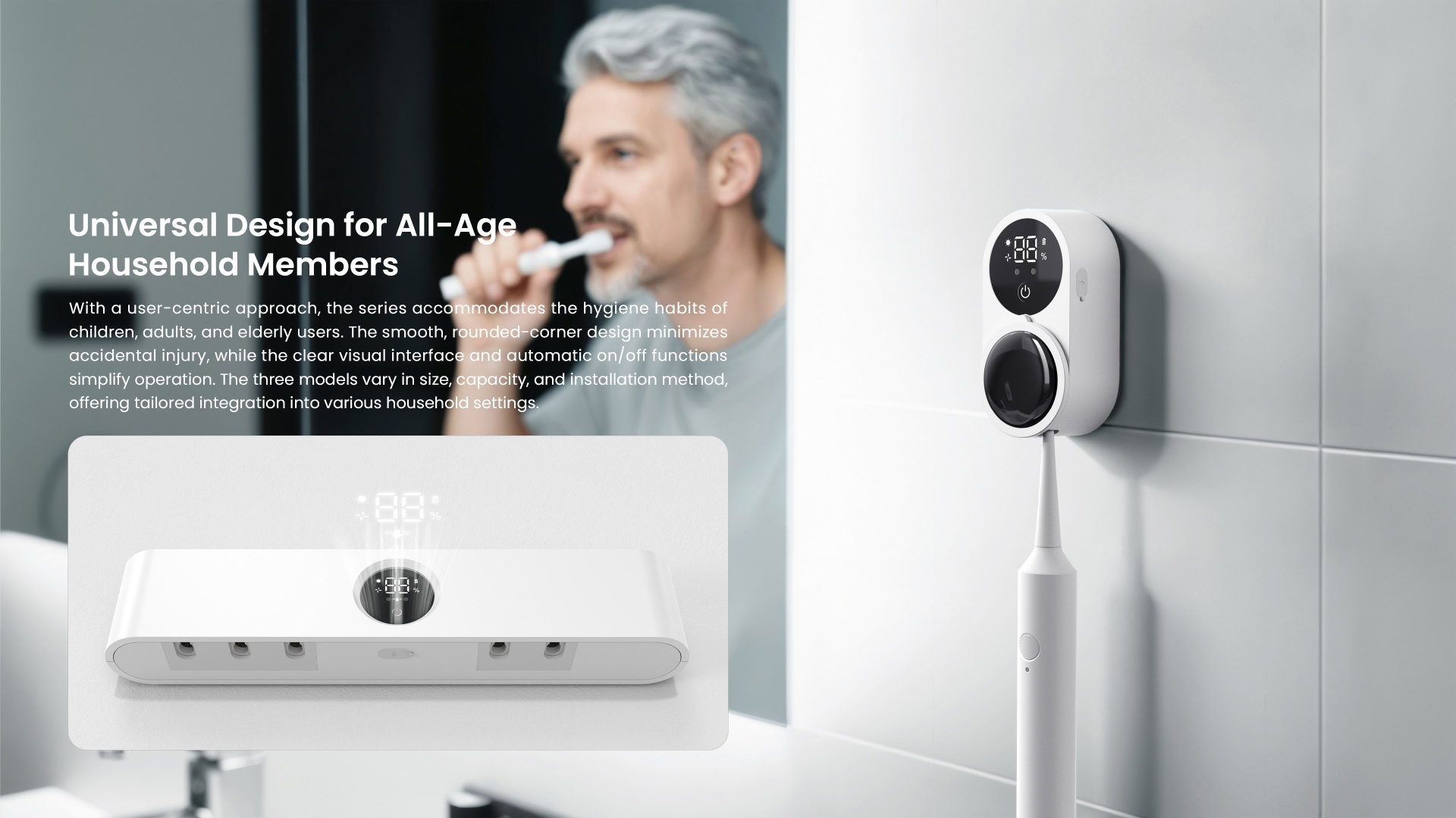 The X114Z, X122Z, and X131Z Automatic Toothbrush Smart Care Cabin Series are advanced personal hygiene appliances that integrate UV sterilization, warm-air drying, and intelligent storage in a compact form. Designed for contemporary households, they address common issues of toothbrush hygiene—such as bacterial growth and moisture—with an efficient, safe, and energy-saving smart system. Featuring a minimalist industrial aesthetic and a highly modular architecture, the series supports both electric and manual toothbrushes, meeting the needs of diverse family users. With three distinct size configurations, the series offers flexible solutions to fit various bathroom layouts while maintaining visual coherence and elegance.