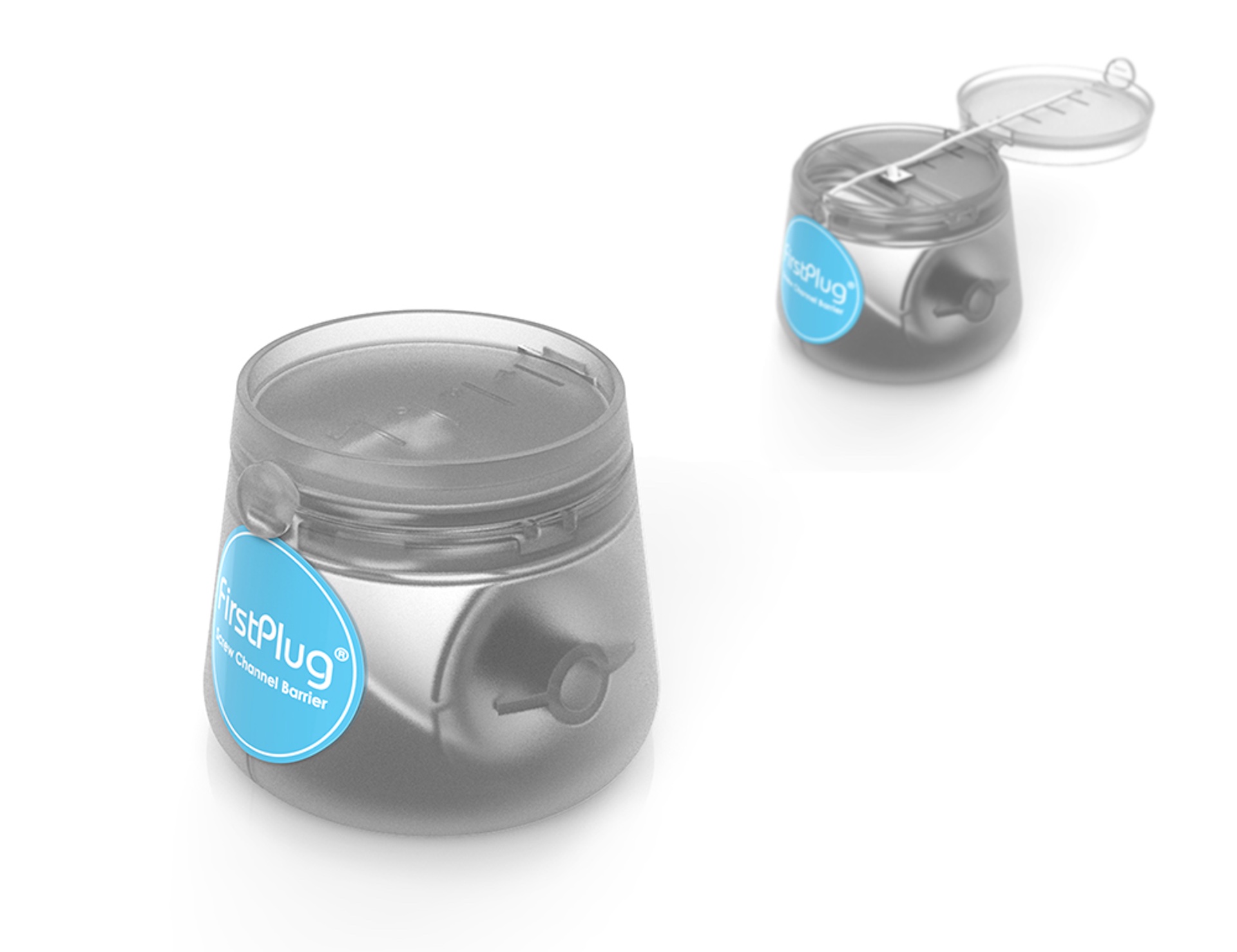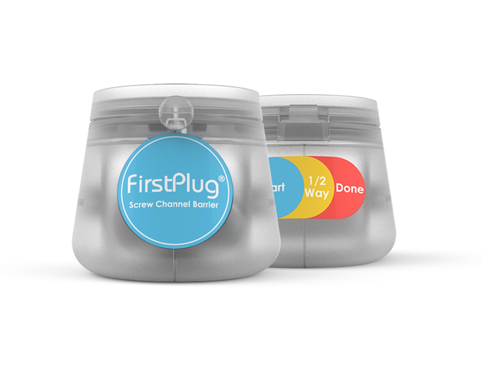 With dental implant procedures dentists have the issue of later accessing the abutment screw. After a tooth is connected to the screw, it is capped with a filler which ends up clogging the screw head. Ad hoc remedies, such as plumber's tape, are often used as a barrier which leads to bacterial growth and infections. FirstPlug is biocompatible, bacteria impervious, expunges moisture, and is made in the USA. The dispenser design is airtight, allows one handed opening, prevents material fall back, includes finger recess, cutter, measuring strip, volume indicator, and is made from recyclable PP.
