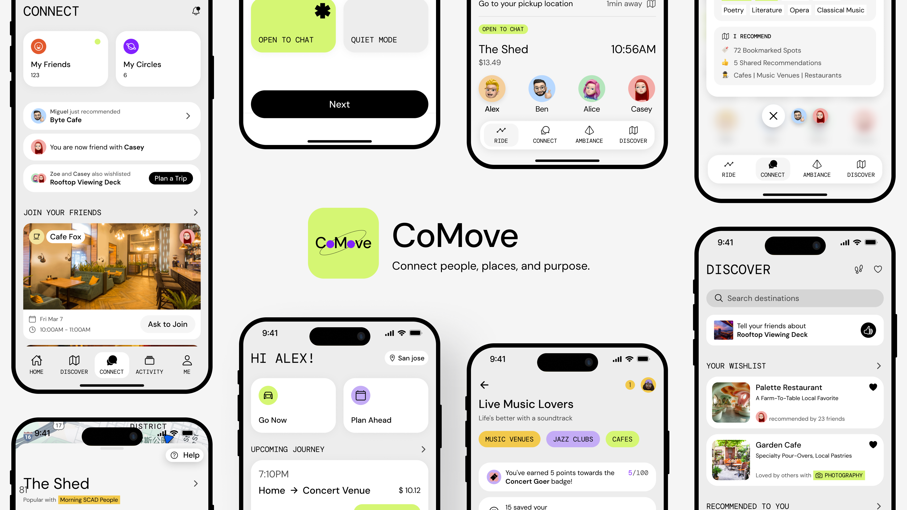 CoMove is a ride-share platform that transforms everyday transits into opportunities for connection and discovery. While traditional services focus solely on utility, CoMove creates a social ecosystem centered around destinations and shared interests.