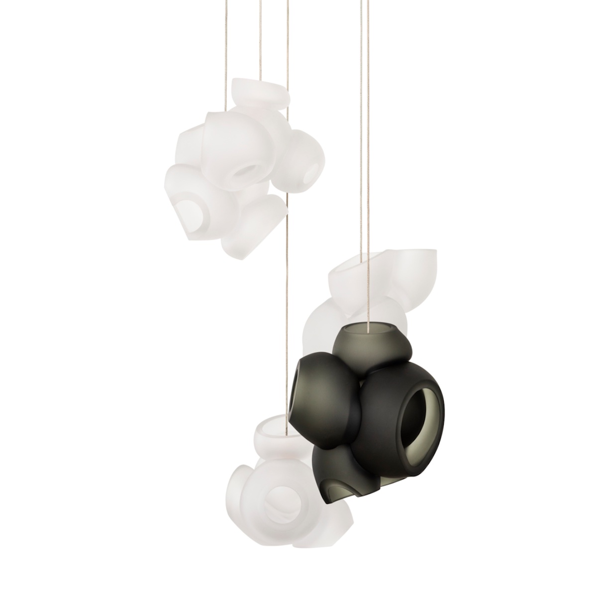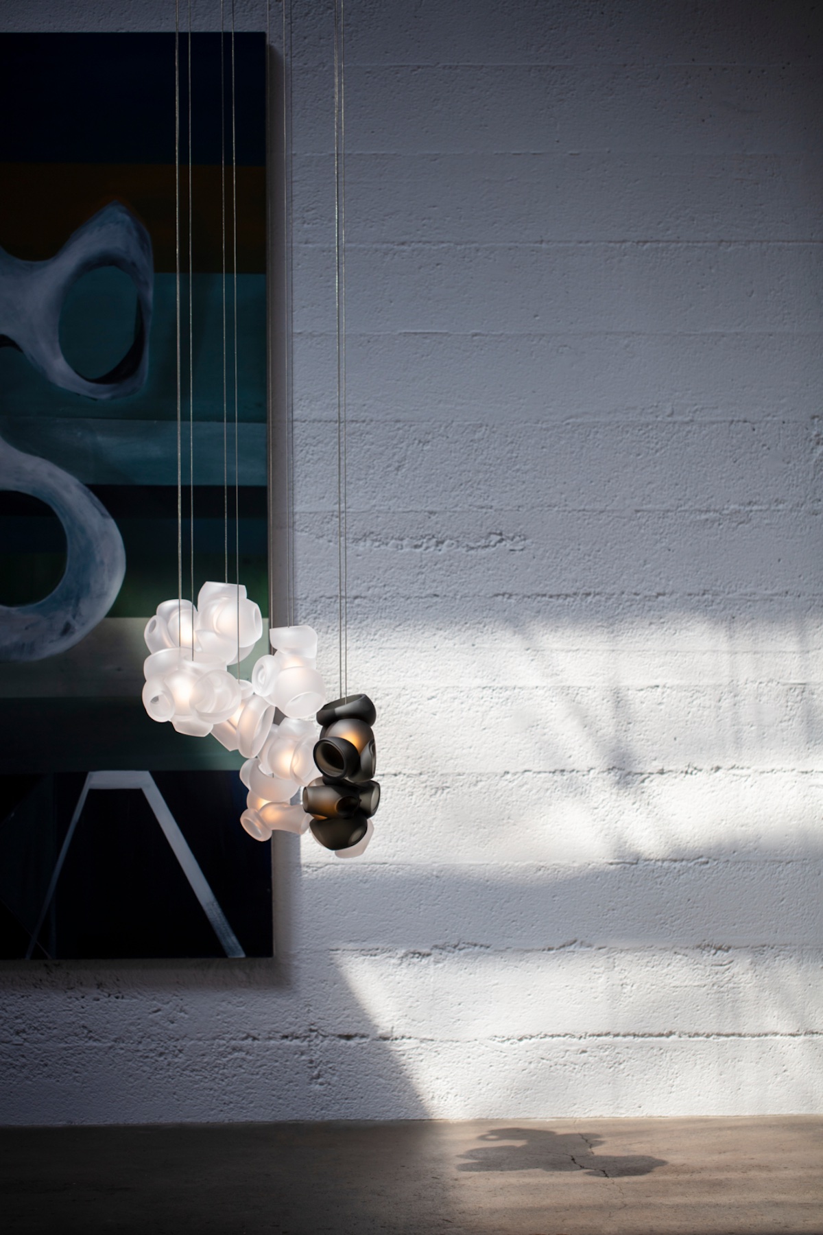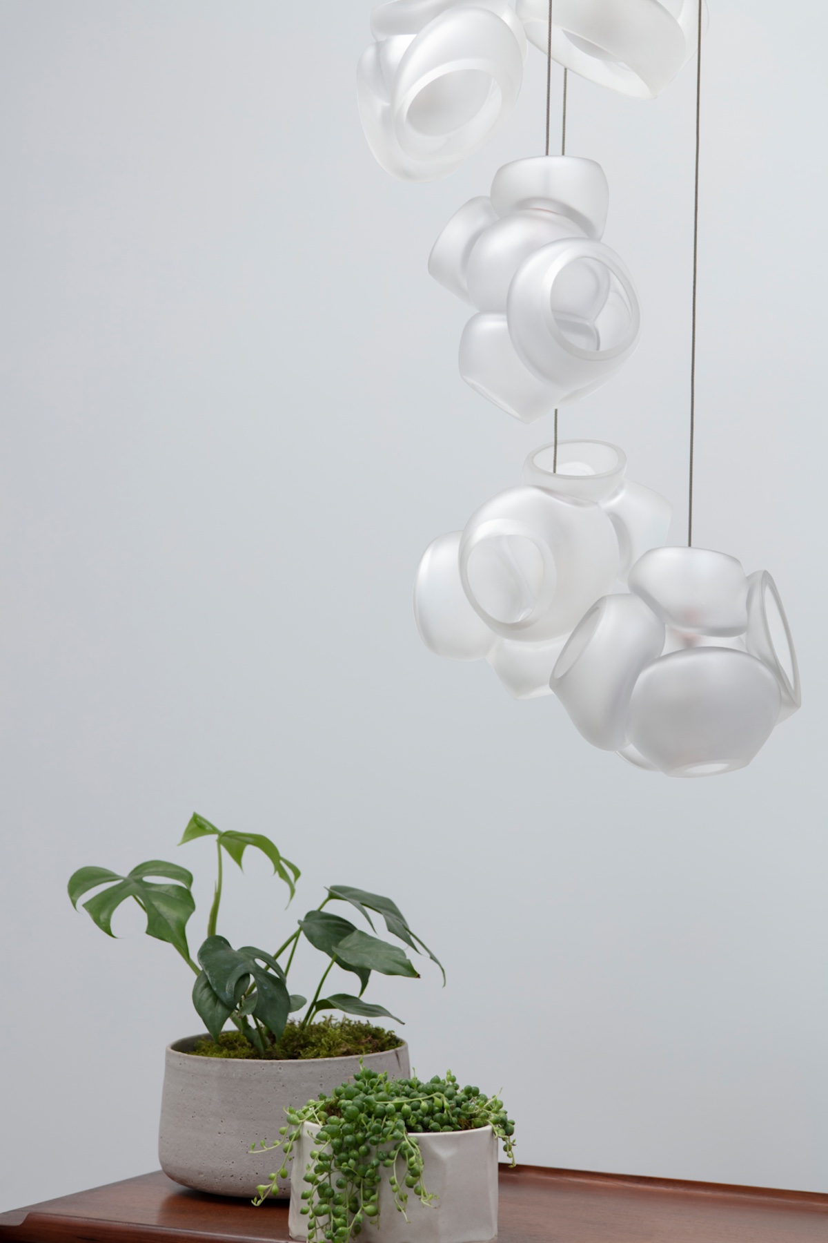 100 brings multiple glass artists together in a performative act. Molten glass bubbles are prepared by each, then smashed together to produce unpredictable interlocking glass forms. “We developed a method to make fascinating shapes but realized the most interesting complexity remains hidden inside the volume;” explains Omer Arbel, Bocci’s co-founder and creative director. “We’ve been developing new methods for making form for many years and routinely cutting prototypes to learn about what’s happening inside... but it occurred to us that the act of cutting itself can be part of the work, not just a learning exercise. For 100, we use a diamond saw to cut swaths off the bubble amalgamations after they cool, exposing the most fascinating parts of the geometry."