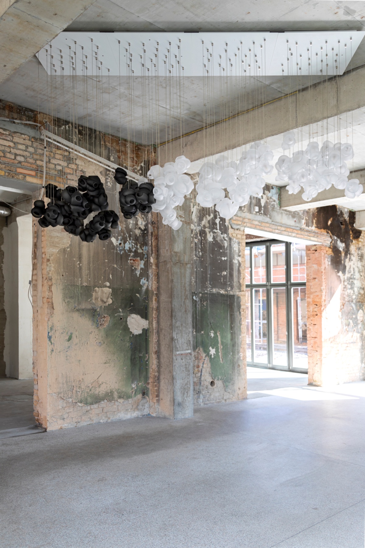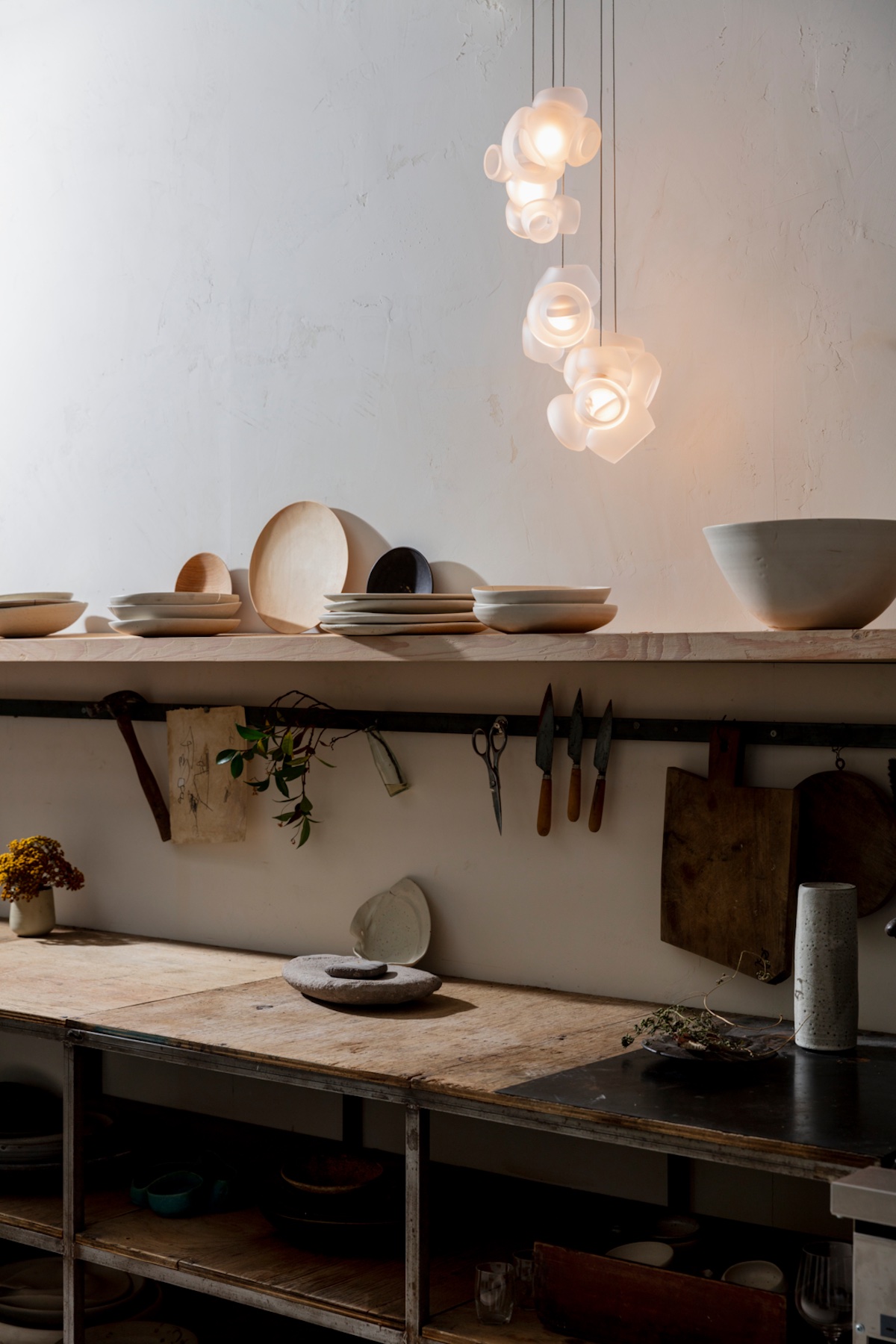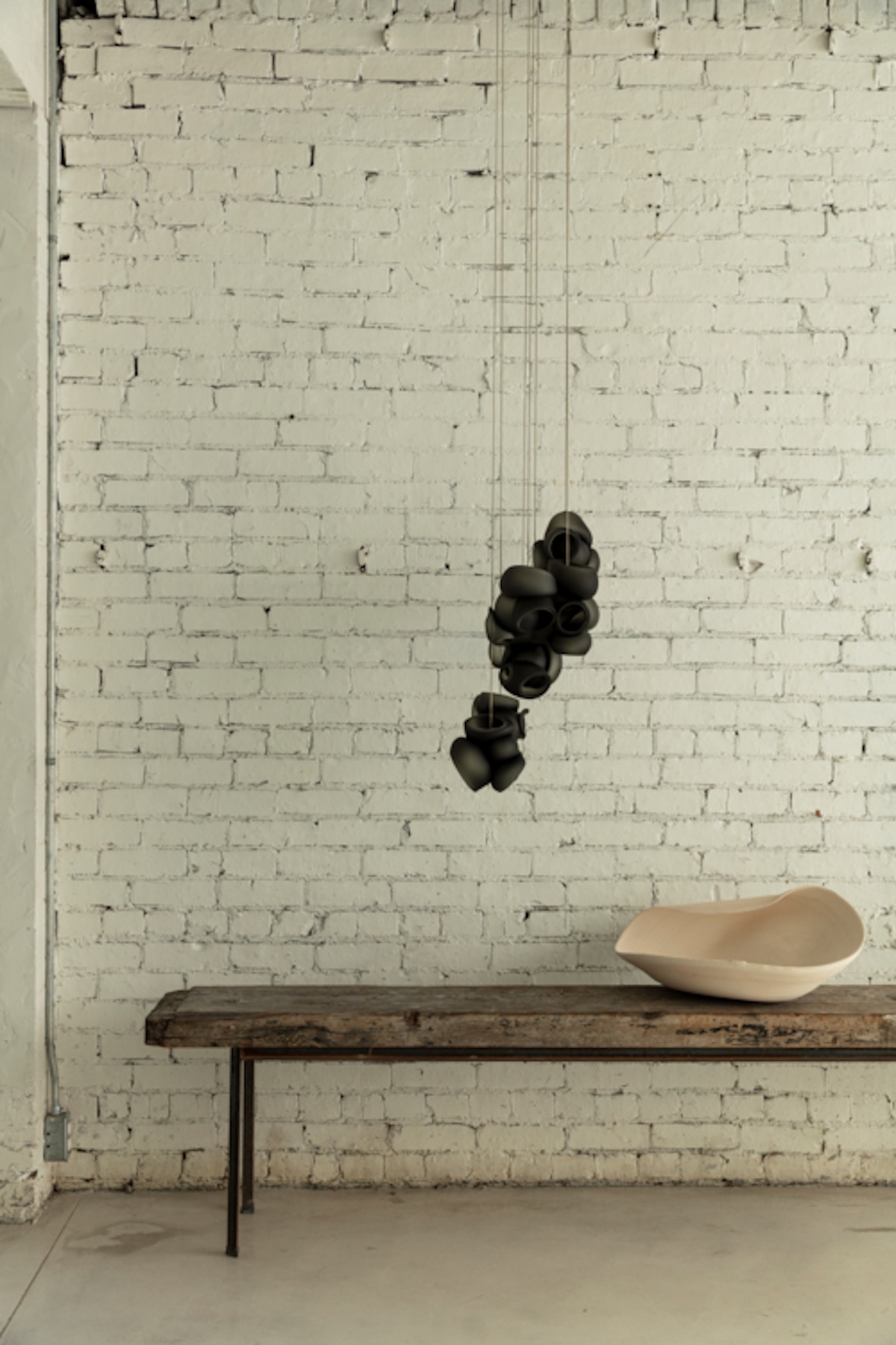 100 brings multiple glass artists together in a performative act. Molten glass bubbles are prepared by each, then smashed together to produce unpredictable interlocking glass forms. “We developed a method to make fascinating shapes but realized the most interesting complexity remains hidden inside the volume;” explains Omer Arbel, Bocci’s co-founder and creative director. “We’ve been developing new methods for making form for many years and routinely cutting prototypes to learn about what’s happening inside... but it occurred to us that the act of cutting itself can be part of the work, not just a learning exercise. For 100, we use a diamond saw to cut swaths off the bubble amalgamations after they cool, exposing the most fascinating parts of the geometry."