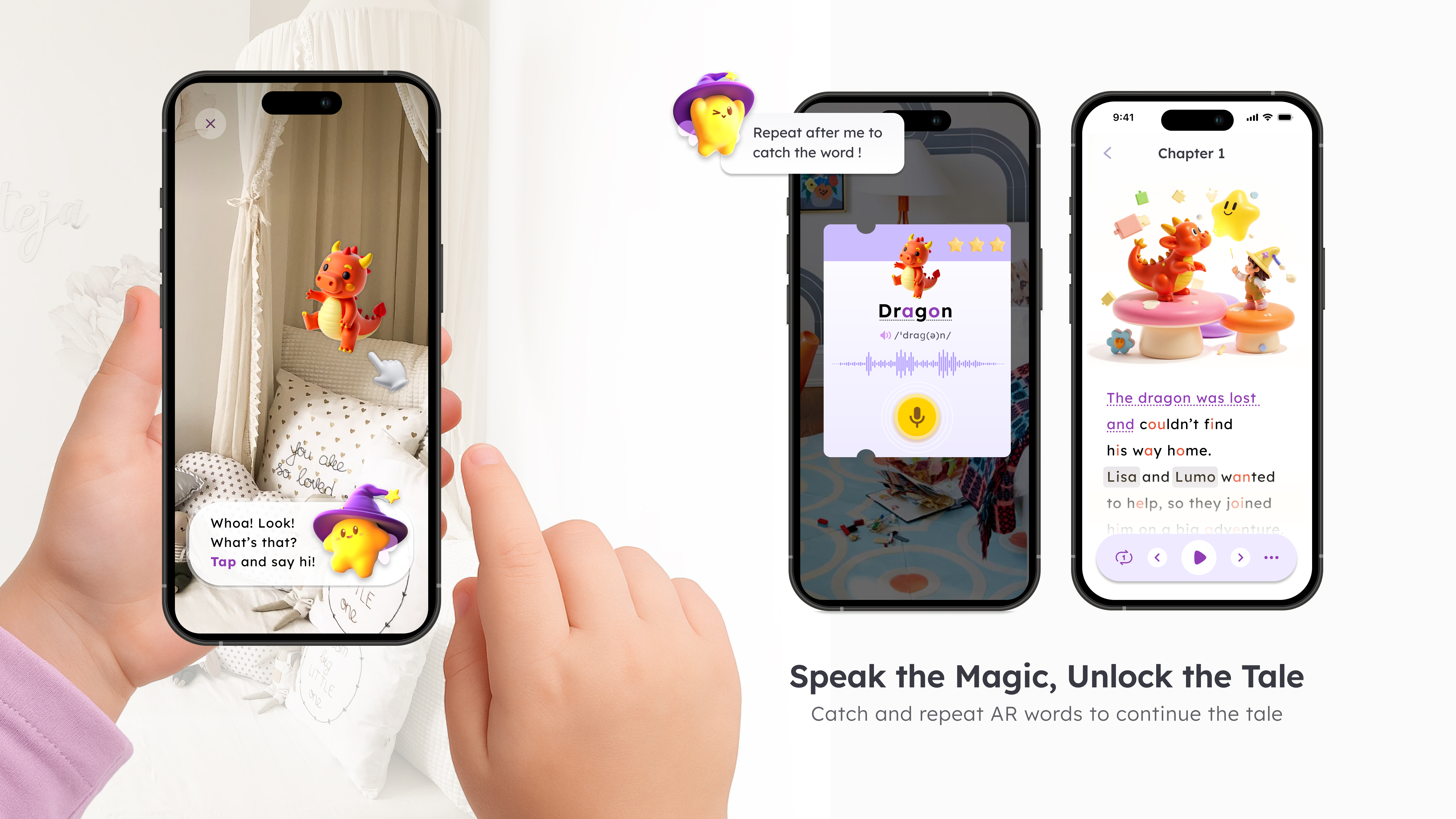 Lumo is a mobile language app designed to help children with dyslexia improve reading and spelling through an immersive, multi-sensory experience. Using augmented reality (AR), children explore story worlds where they tap on 3D object images and say the corresponding word out loud to collect it as a card. These cards can be reviewed and repracticed, reinforcing word recognition and pronunciation. As more cards are collected, new story chapters are unlocked—motivating continued engagement and learning. Children can also speak with Lumo to build emotional connection and confidence in using language. Lumo blends gamification, augmented reality (AR) and voice input to transform language learning into a magical, self-paced journey—helping every child find joy in words.