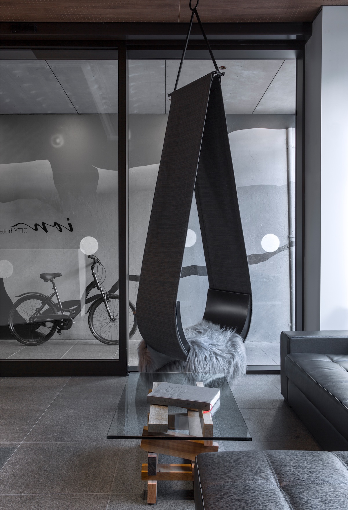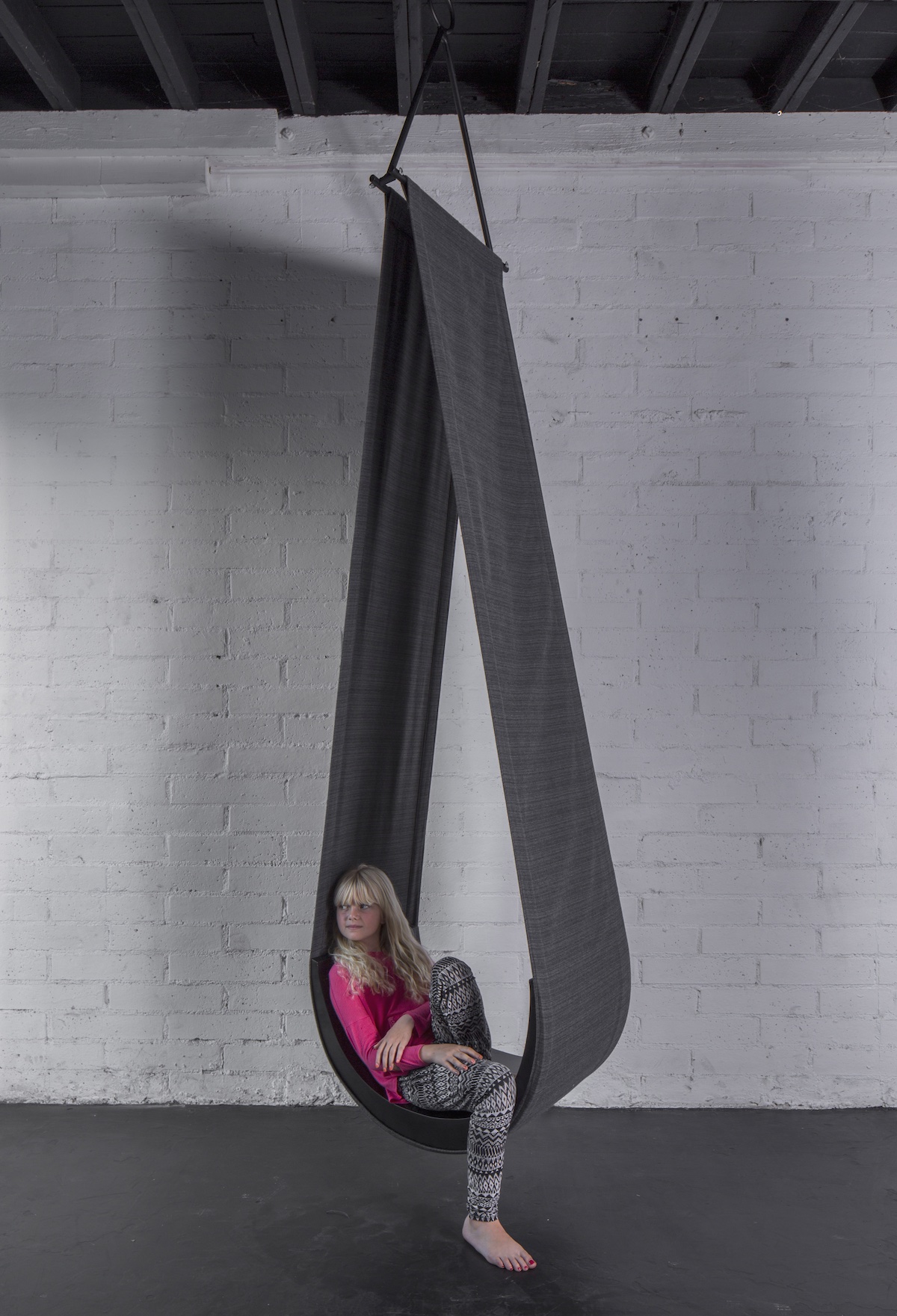 Like a solitary drop of ebony rain, the DROPi by Minarc appears to descend in a free fall from the heavens, showered by yards of fabric that gently cradle the softly curved seat of molded metal.