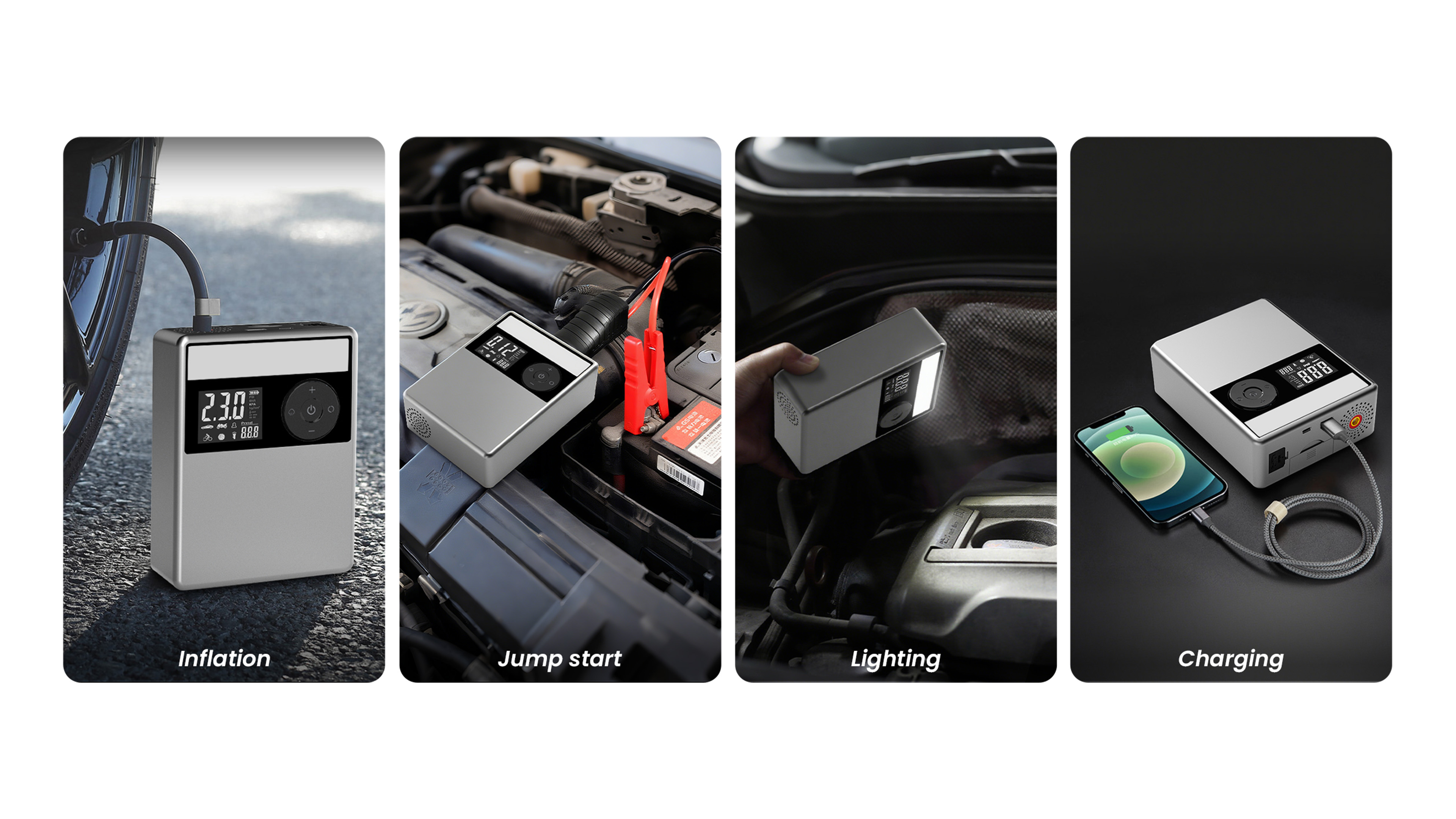 This product redefines convenience by merging the air pump, inflation assembly, battery pack, and even power bank functionality into a single, cohesive unit, overcoming the complexity of traditional multi-part setups. Compared to conventional inflators and jump starters that require manual assembly, it offers unmatched portability and instant usability—ideal for emergency starting, tire inflation, etc., and charging mobile devices such as phones and tablets, delivering a truly versatile solution for everyday and roadside use.