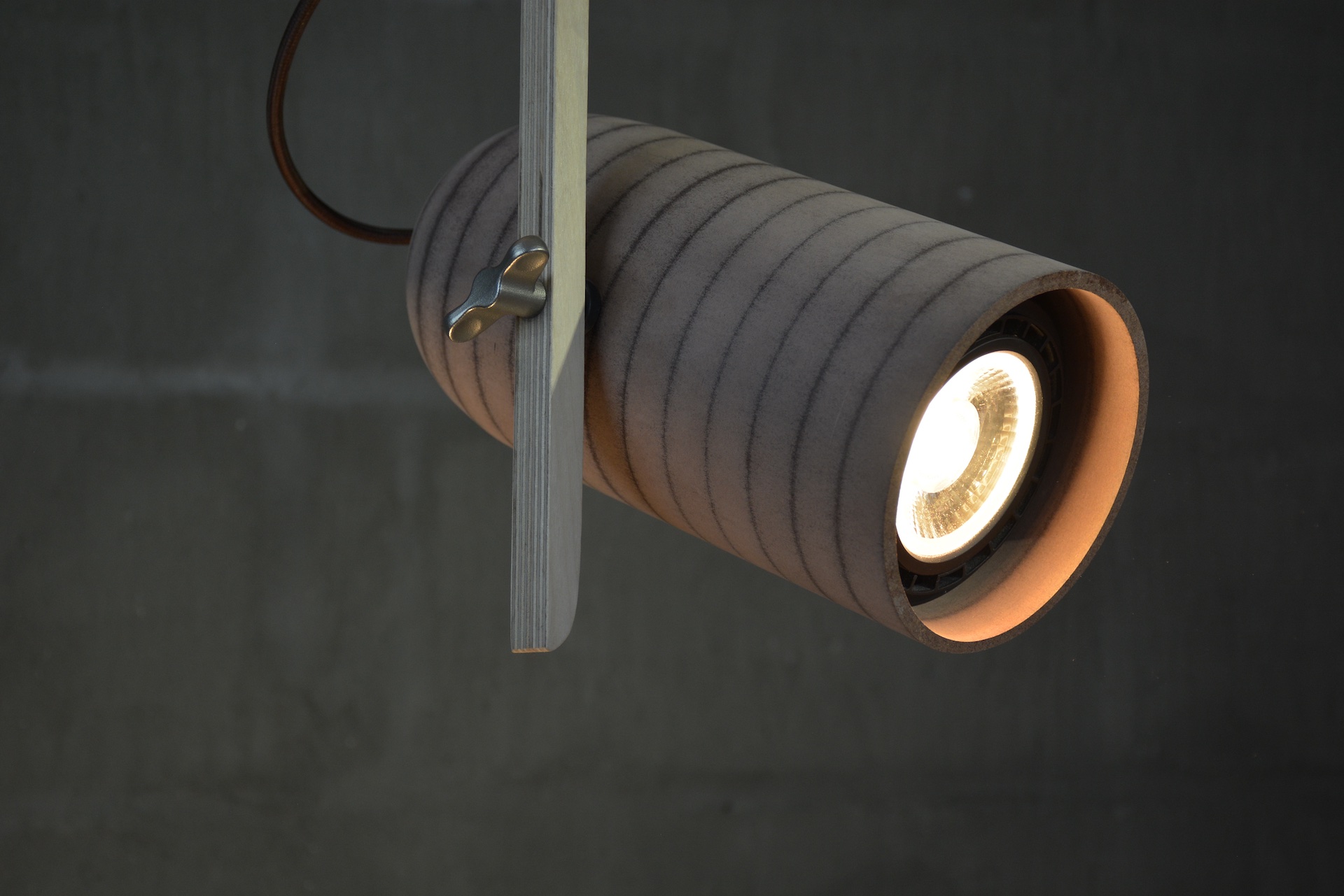 'Erosono' is a directional spotlight that must be mounted on the ceiling or wall. The lamp holder is made from wood waste that has been reprocessed into a new high-quality product. The support is made of plywood.