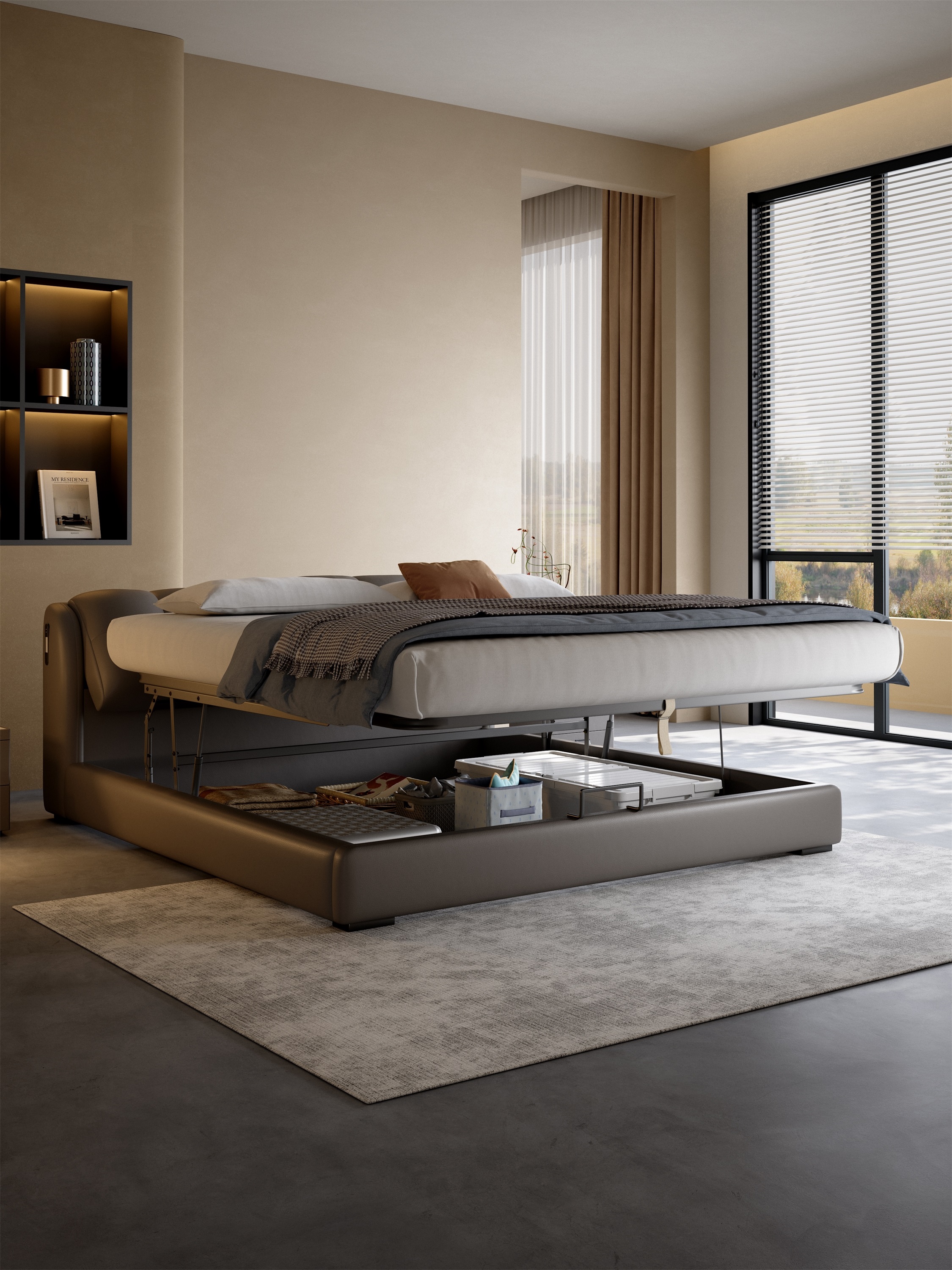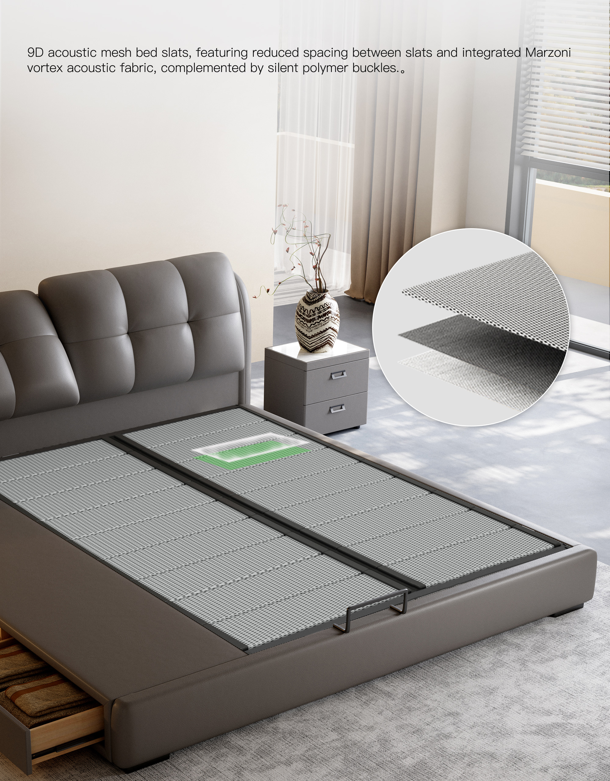 Thanks to the integration of a pneumatic structure, the space beneath the bed is transformed into a high-capacity storage area, addressing household storage demands. Users can freely choose between sliding or lift-up pneumatic opening mechanisms. Additionally, drawers can be installed on either the left or right side of the bed frame, offering flexible adaptation to various storage habits. The 5cm clearance between the bed base and the floor allows easy access for robotic vacuum cleaners and other cleaning devices, combining practicality with daily maintenance convenience.